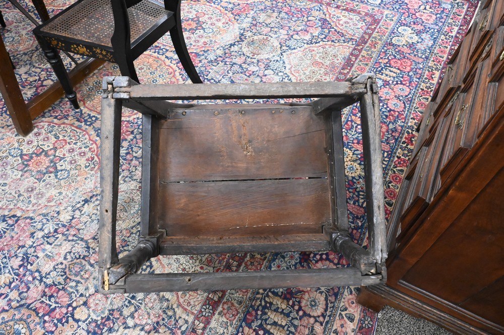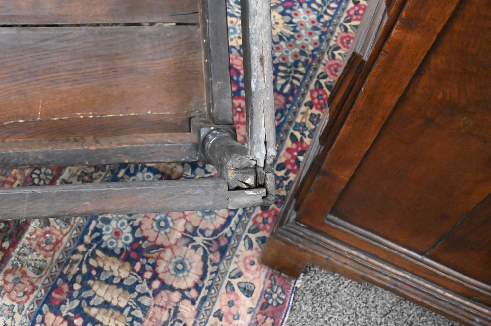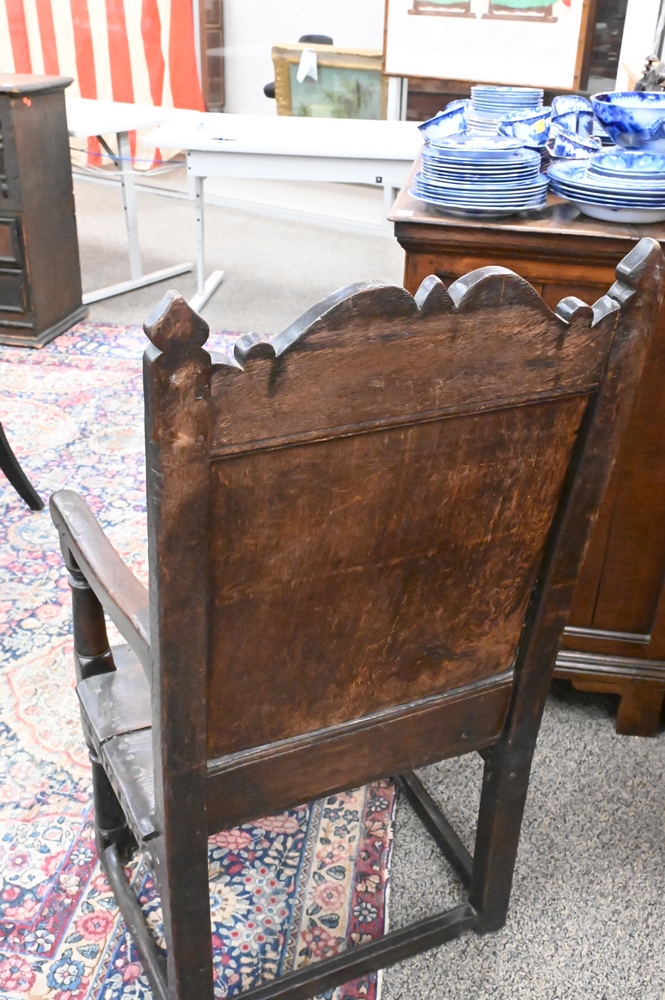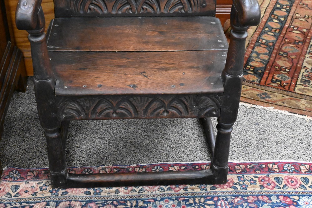 Lot 216: Charles II Oak Wainscot Armchair, having carved panel back, circles over wood seat, carved skirt, turned supports, circa 1660, height 43 1/4 inches, seat height 15 3/4 inches. Provenance: Malcolm Franklin, Chicago. Estate of Wallace Bradway, New Haven, CT.