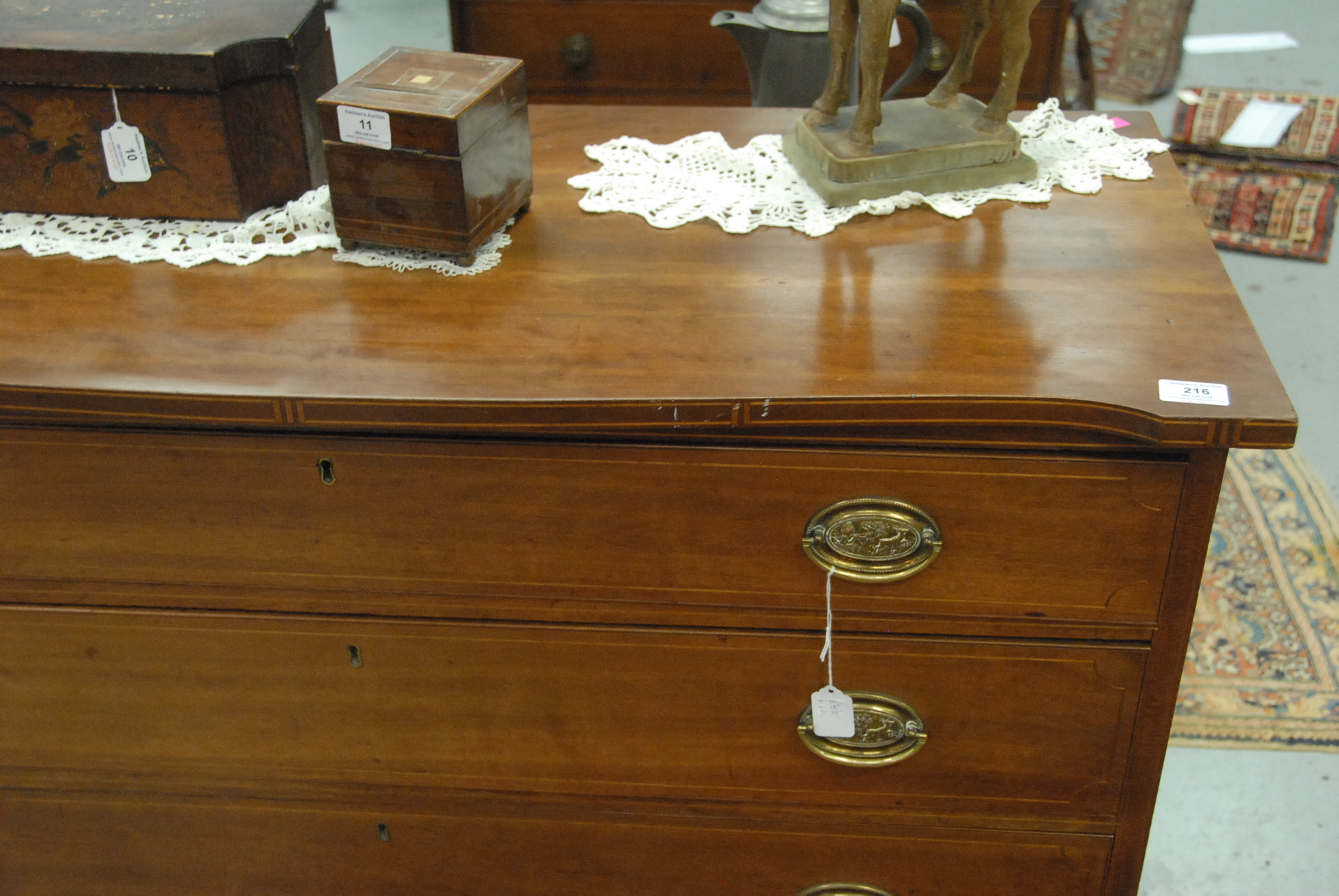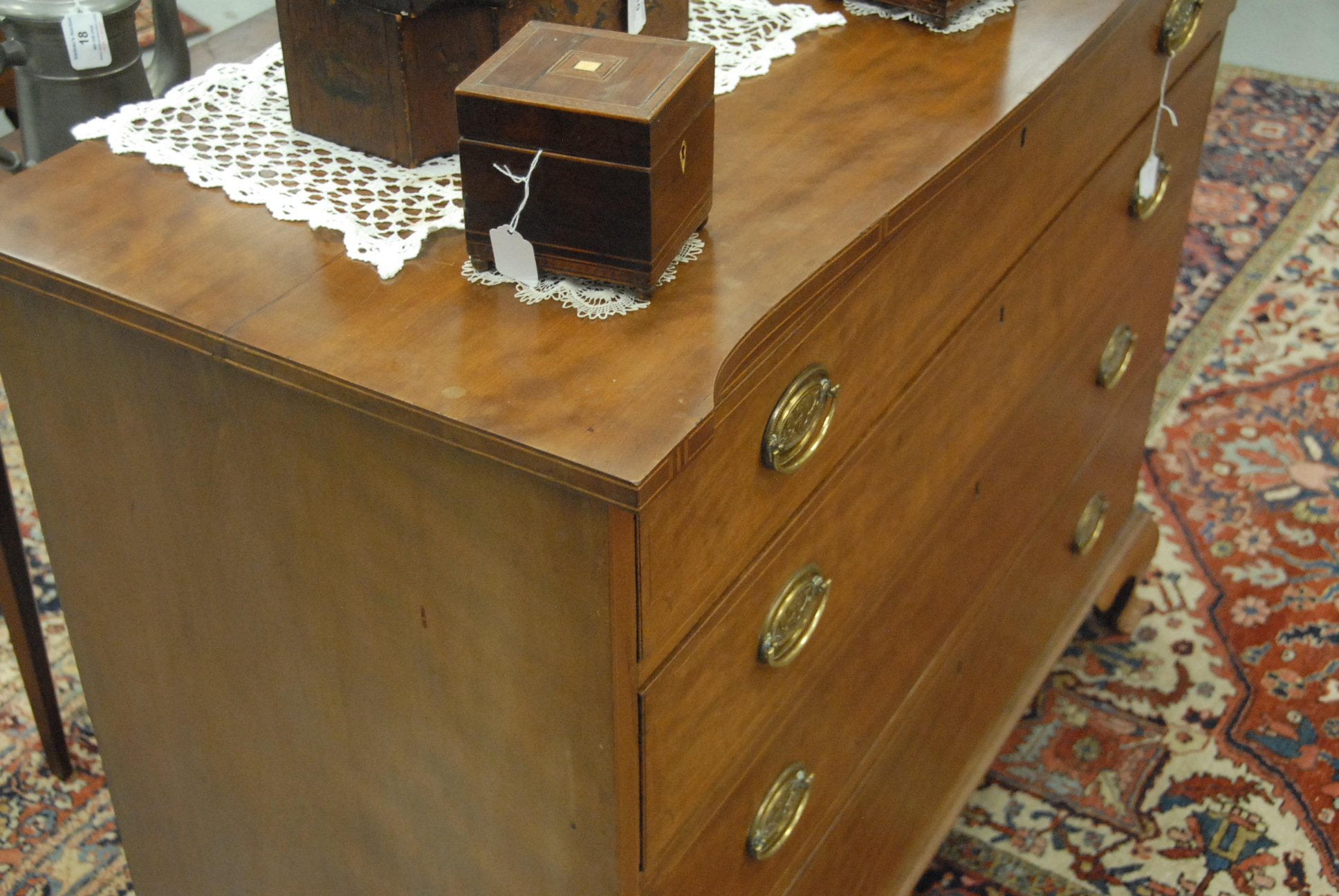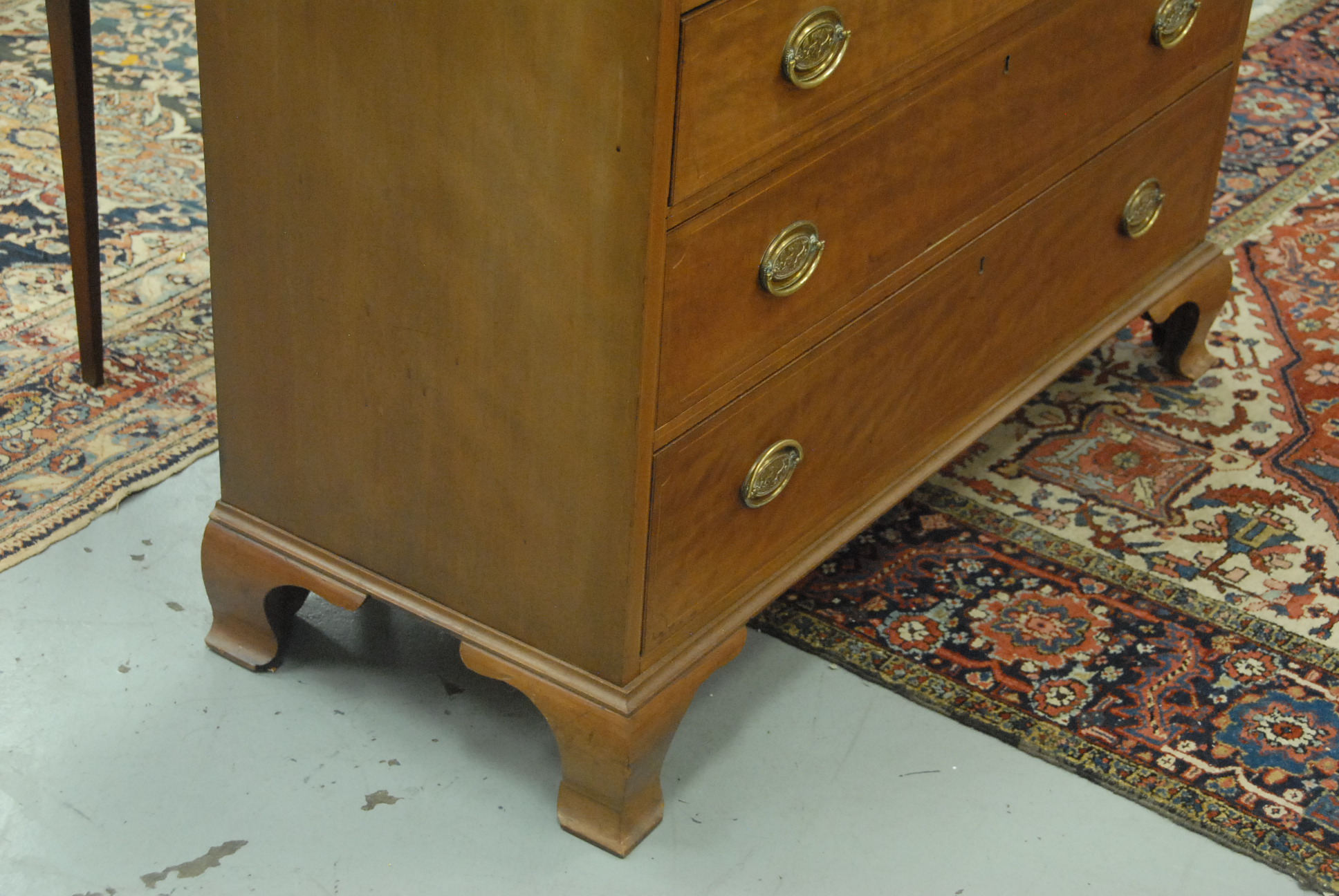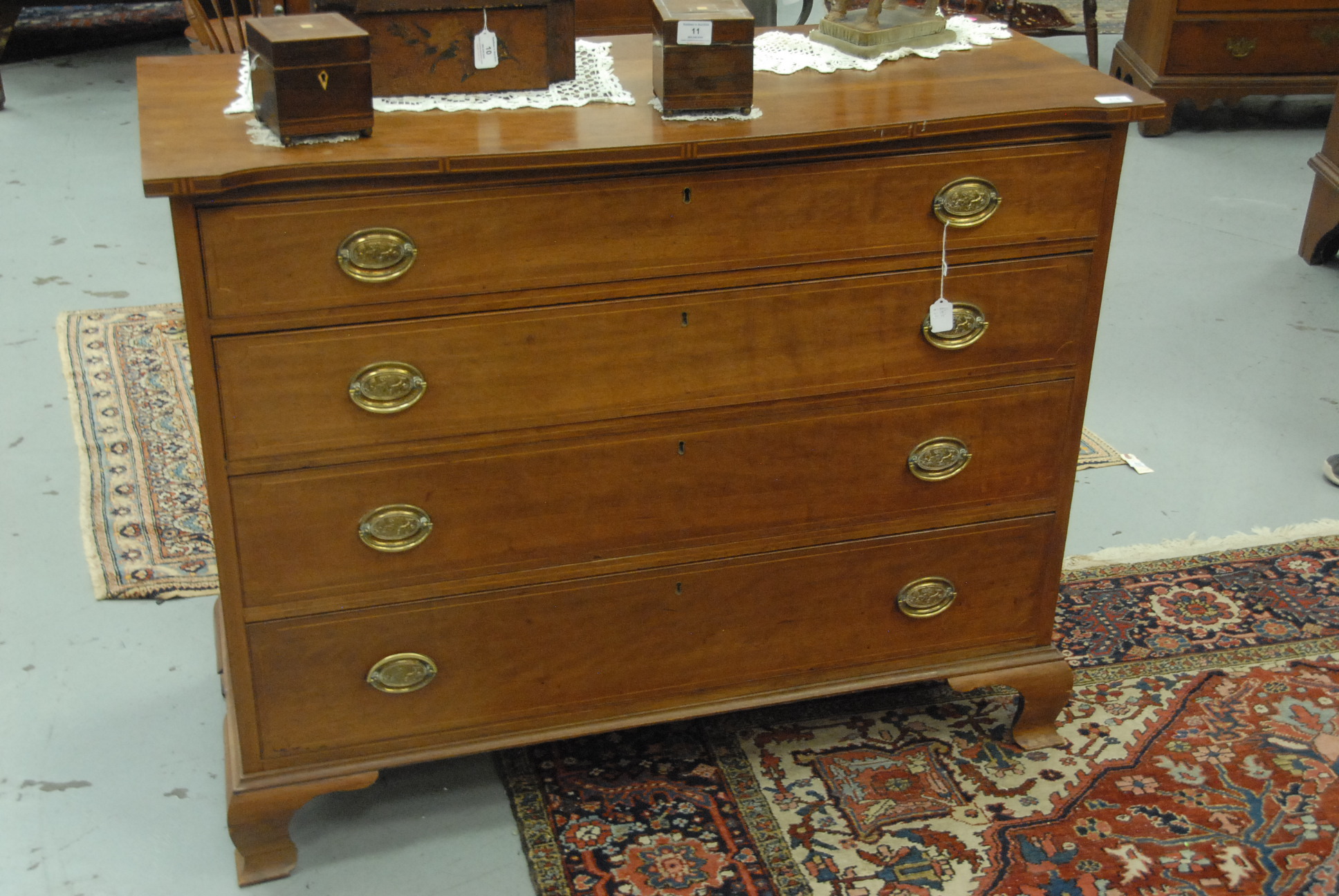 Lot 216: Chippendale chest having shaped top with inlaid edge over four drawers on ogee bracket base, 18th century. ht. 37 in. wd. 44 1/4 in. dp. 18 in. Provenance: Property from The Estate of W. Scott Van Alstyne of Essex, Connecticut.