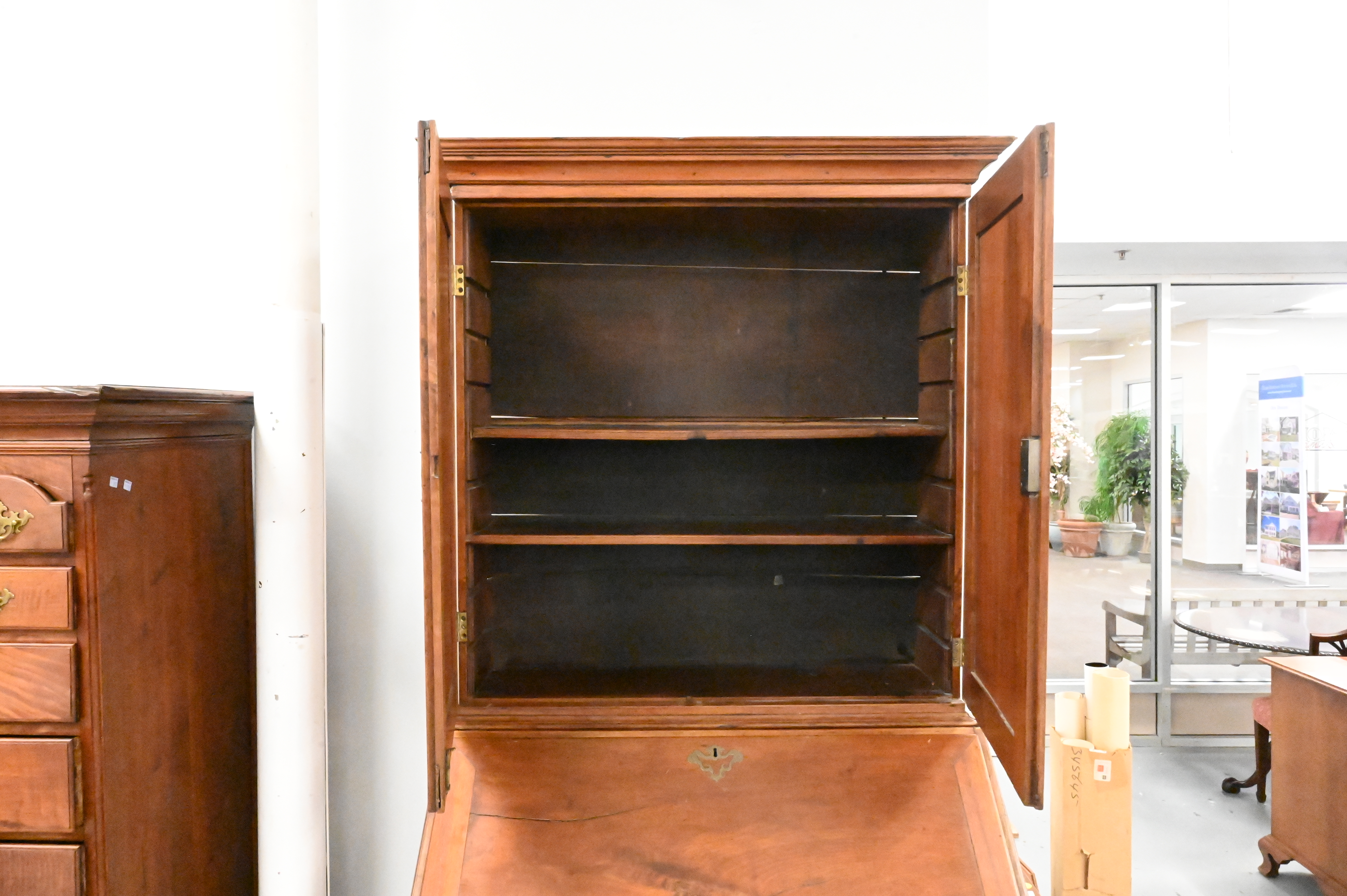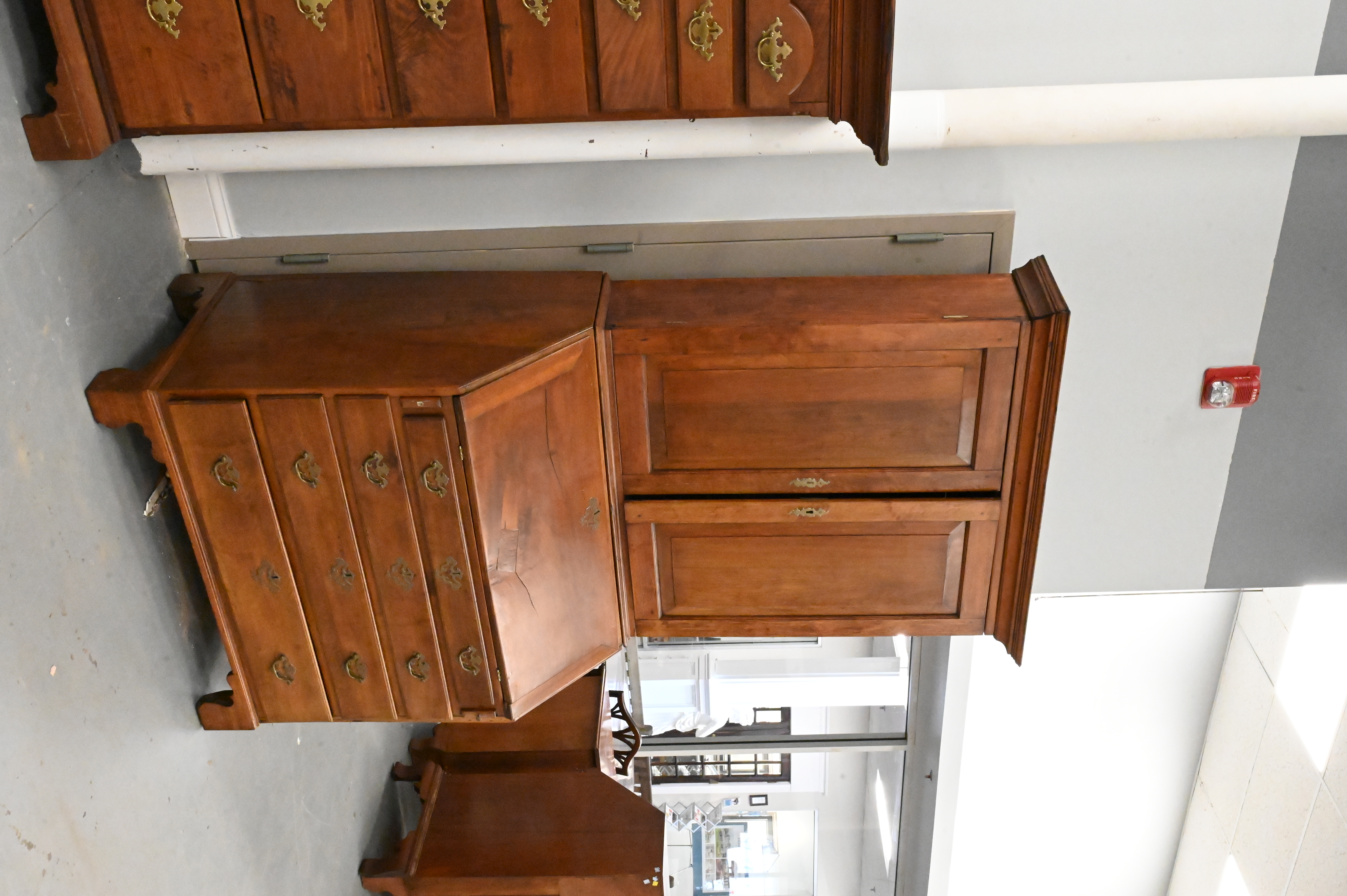 upper section having two raised panel doors opening to adjustable shelves set on lower section having slant lid over four drawers on bracket base, interior having multiple drawers, central door, and flame columns, all having central secret compartment, circa 1780, likely from Pennsylvania