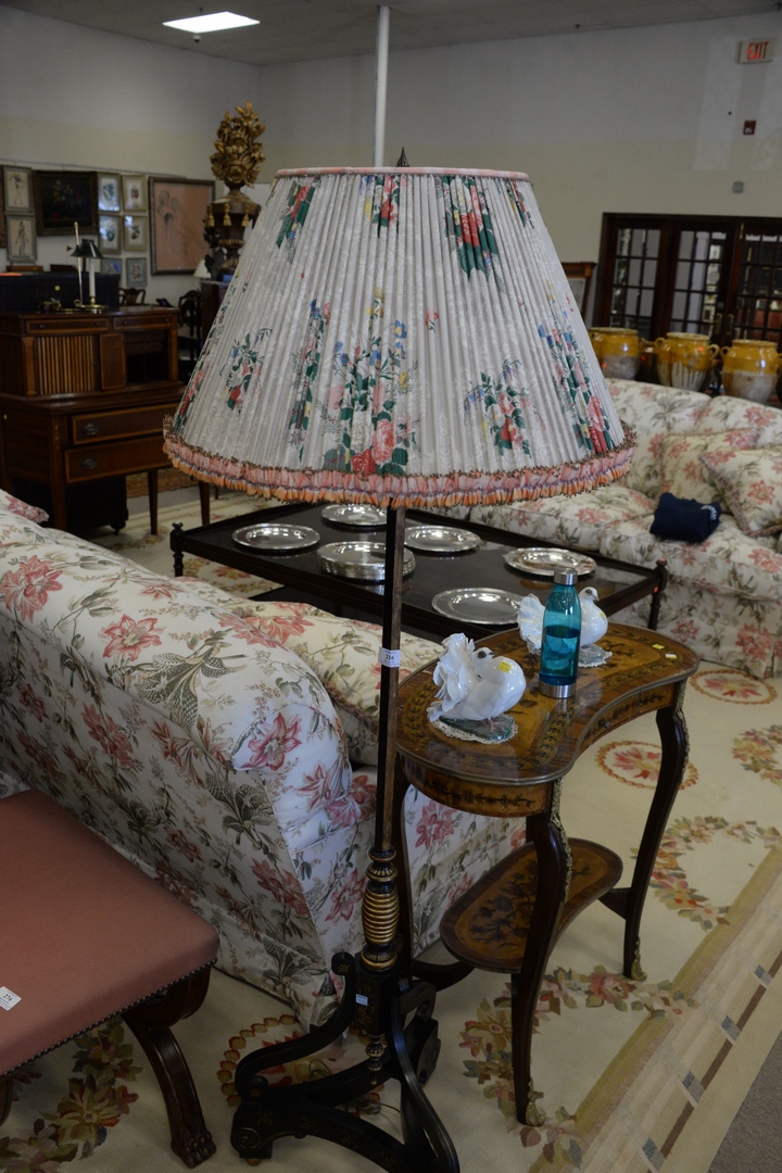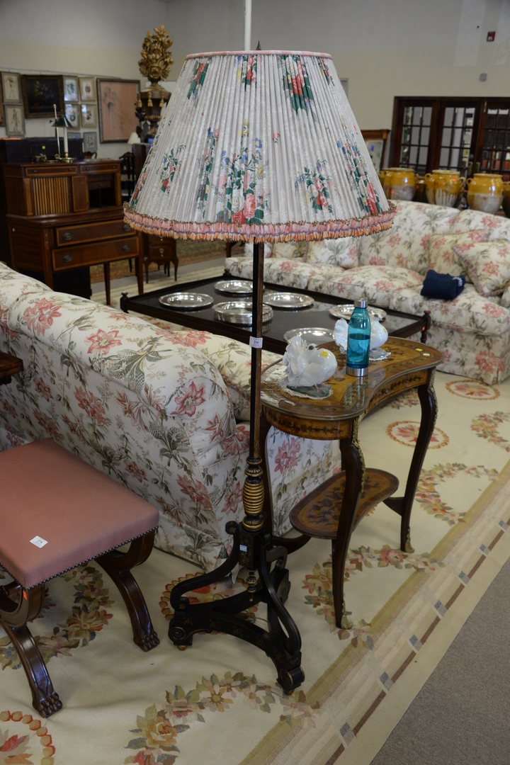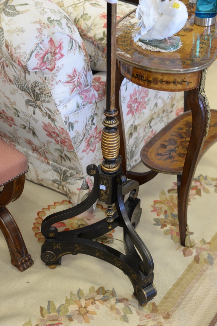 Contemporary Black stenciled Floor lamp with tripod base, height 64 inches.