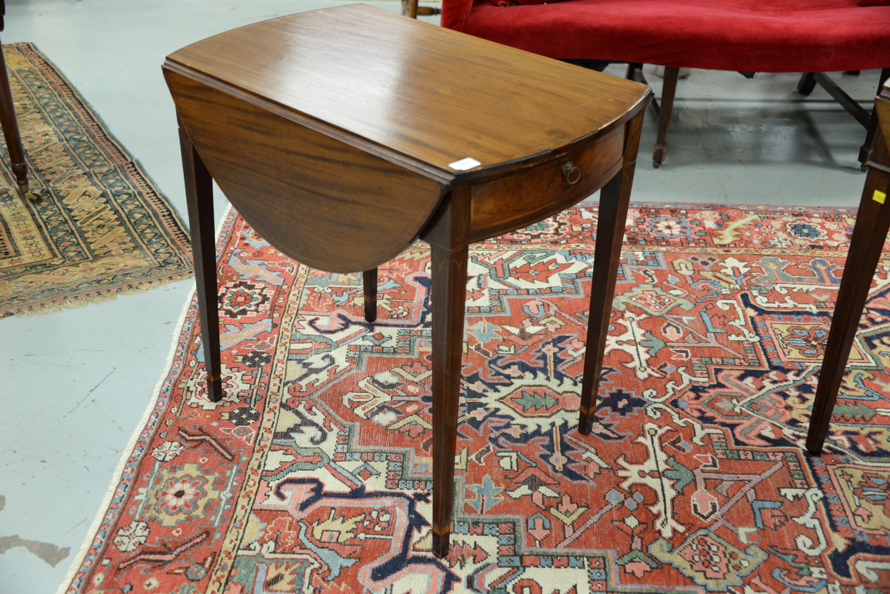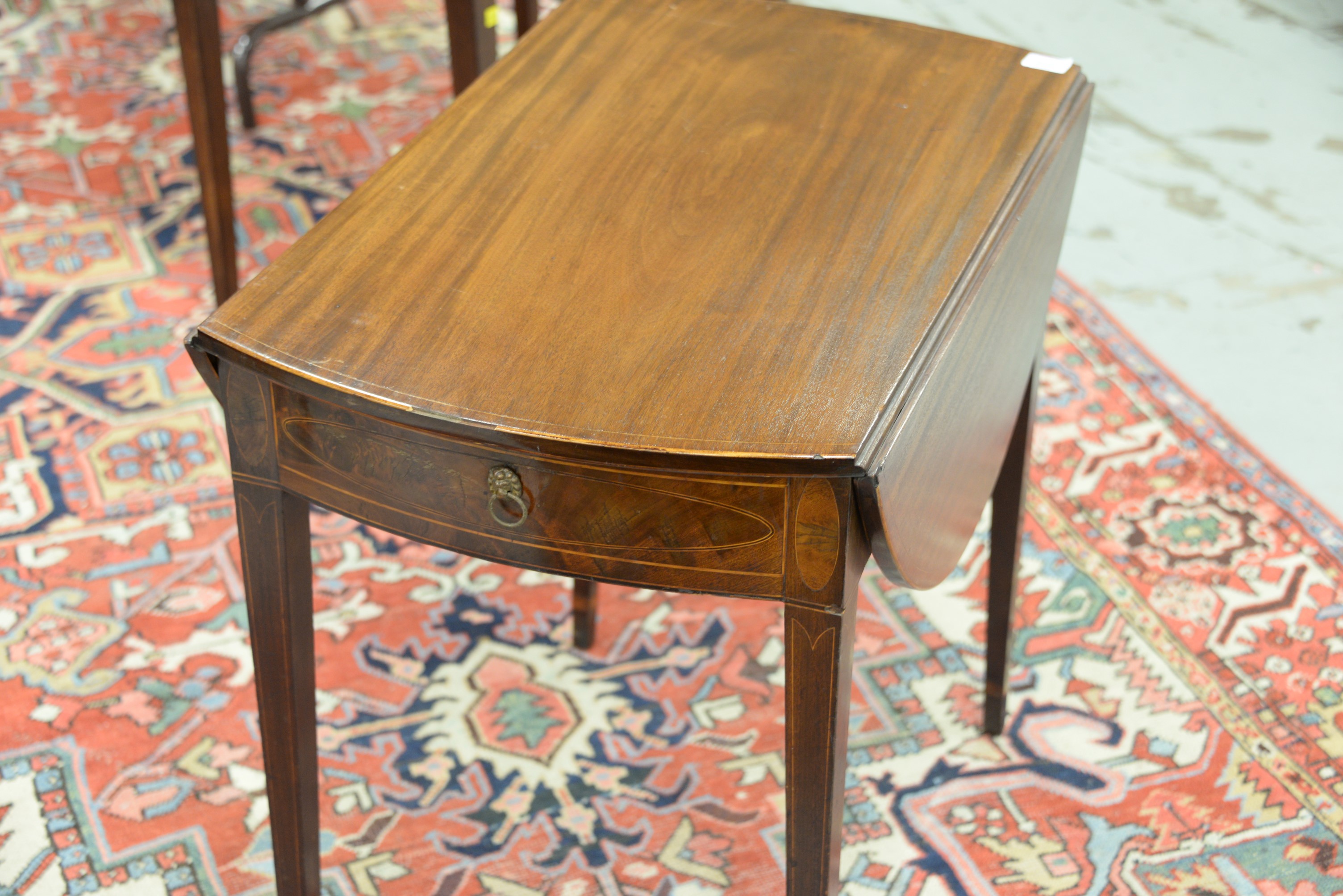 Federal mahogany Pembroke table having oval drop leaves and bowed ends with one drawer, set on square tapered legs having oval, panel, and line inlays some edge inlay missing. ht. 28 1/2 in. open: 38 3/4 x 30 1/4