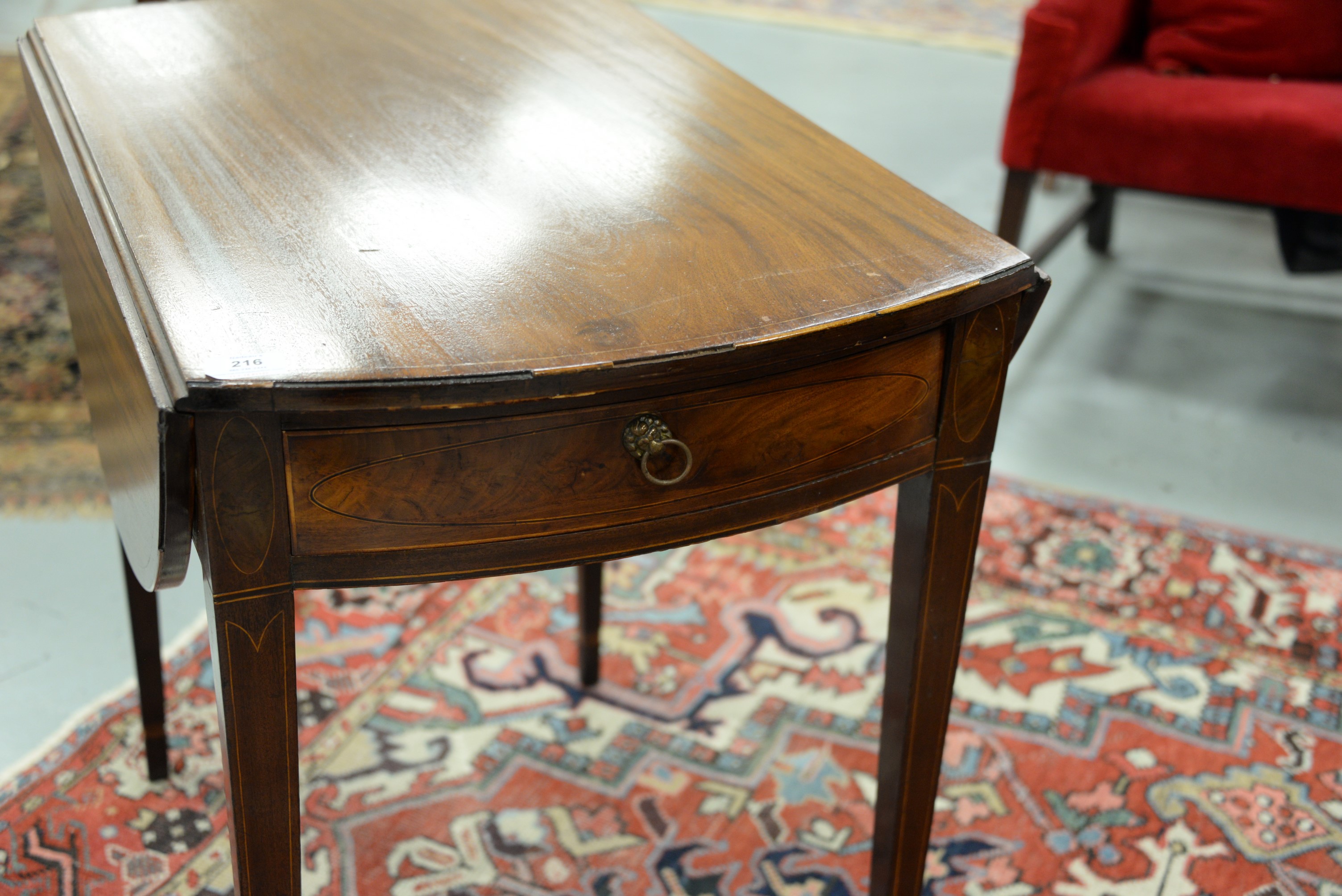Lot 216: Federal mahogany Pembroke table having oval drop leaves and bowed ends with one drawer, set on square tapered legs having oval, pane…