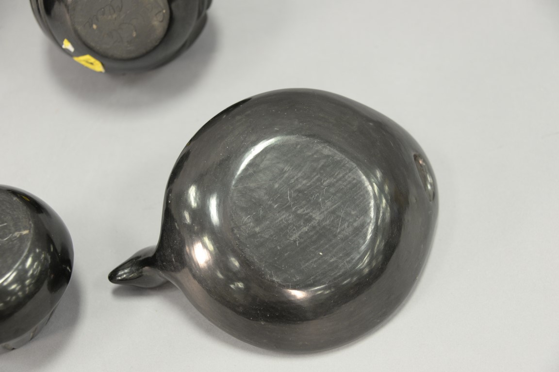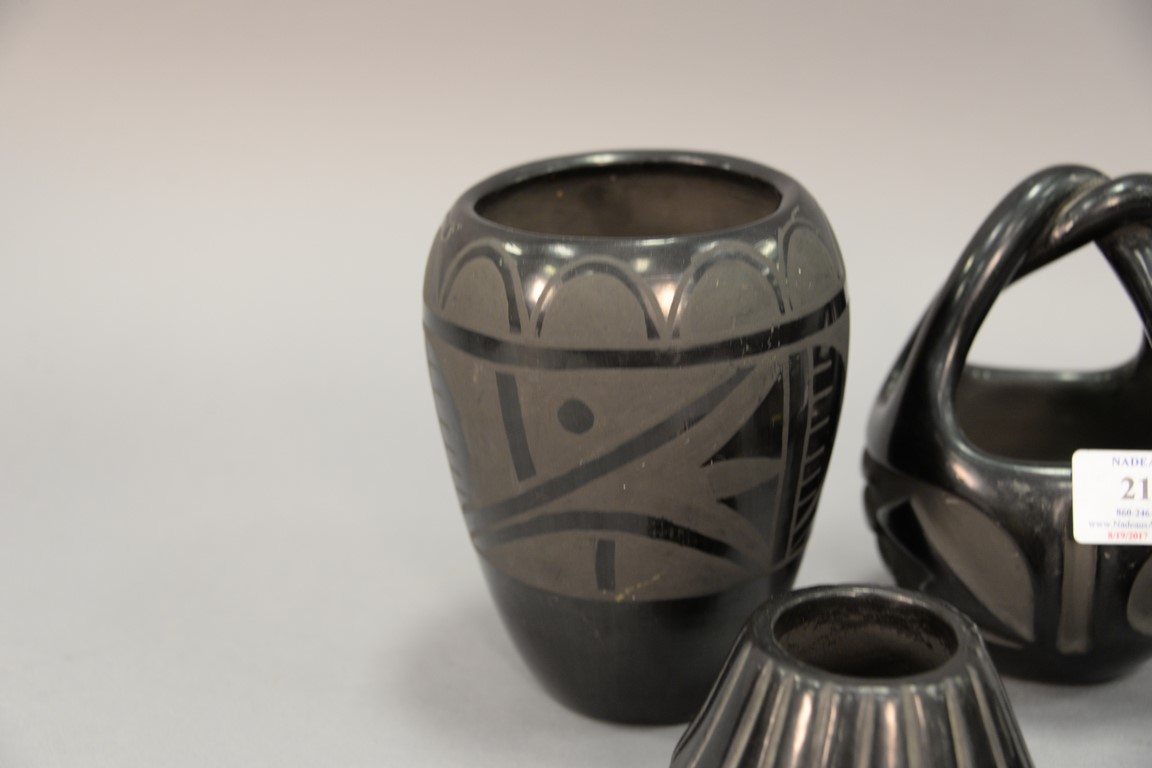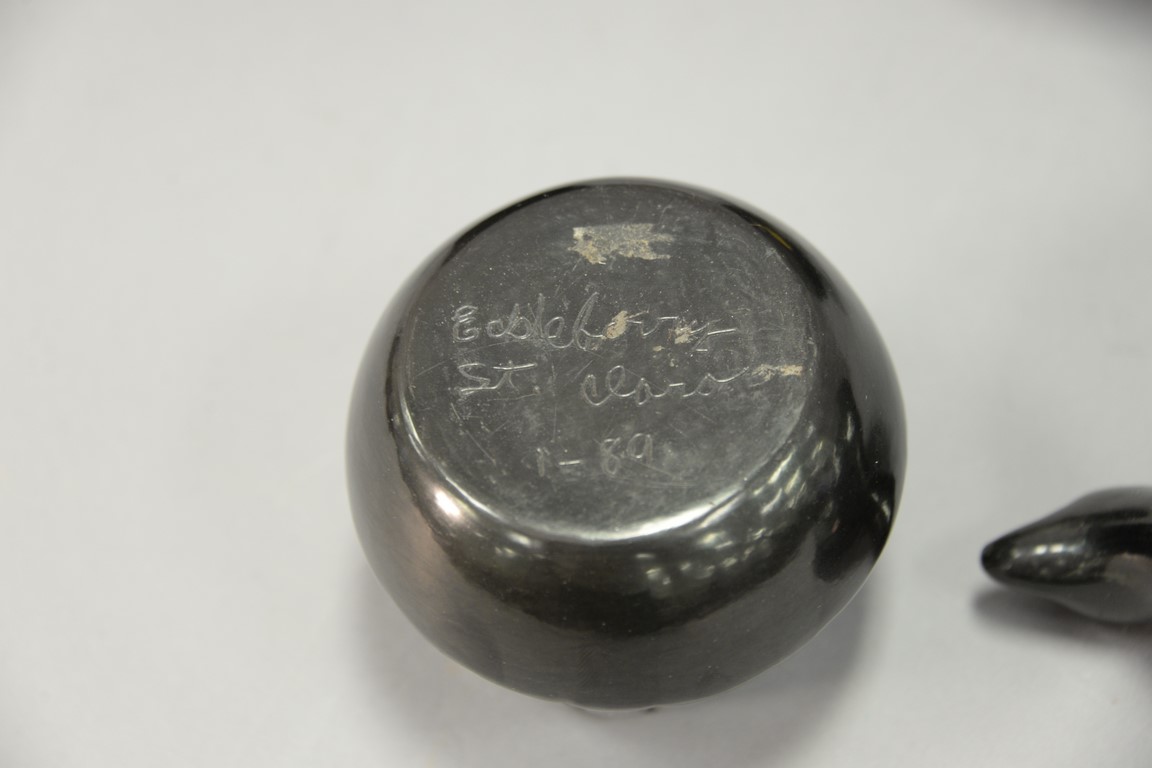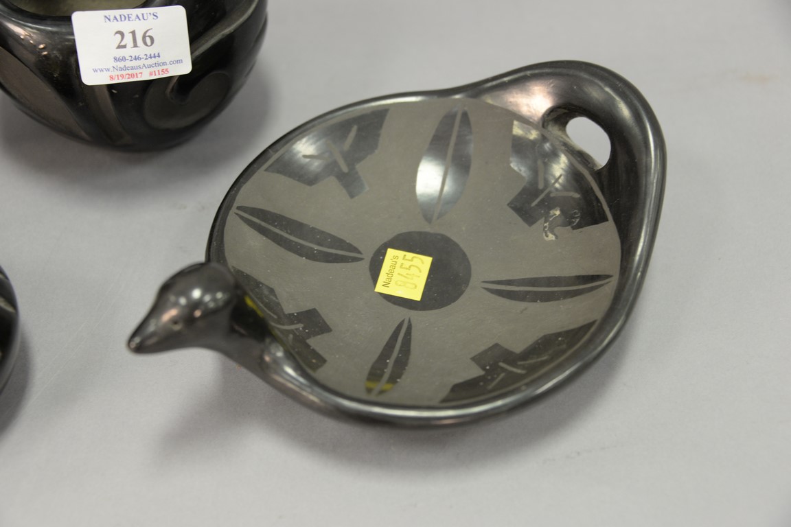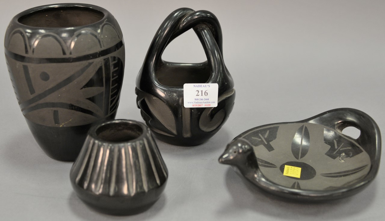 Four Santa Clara Blackware pottery pieces to include small vase marked Eckleberry St. Clara 1-89, basket marked Pabella Sta Clara, tall vase marked Sta Clara, and bird dish marked Jaustine Sta Clara Pueblo. ht. 3in. to 6in.