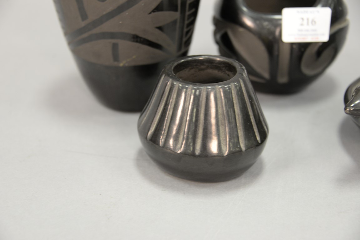 Lot 216: Four Santa Clara Blackware pottery pieces to include small vase marked Eckleberry St. Clara 1-89, basket marked Pabella Sta Clara, t…