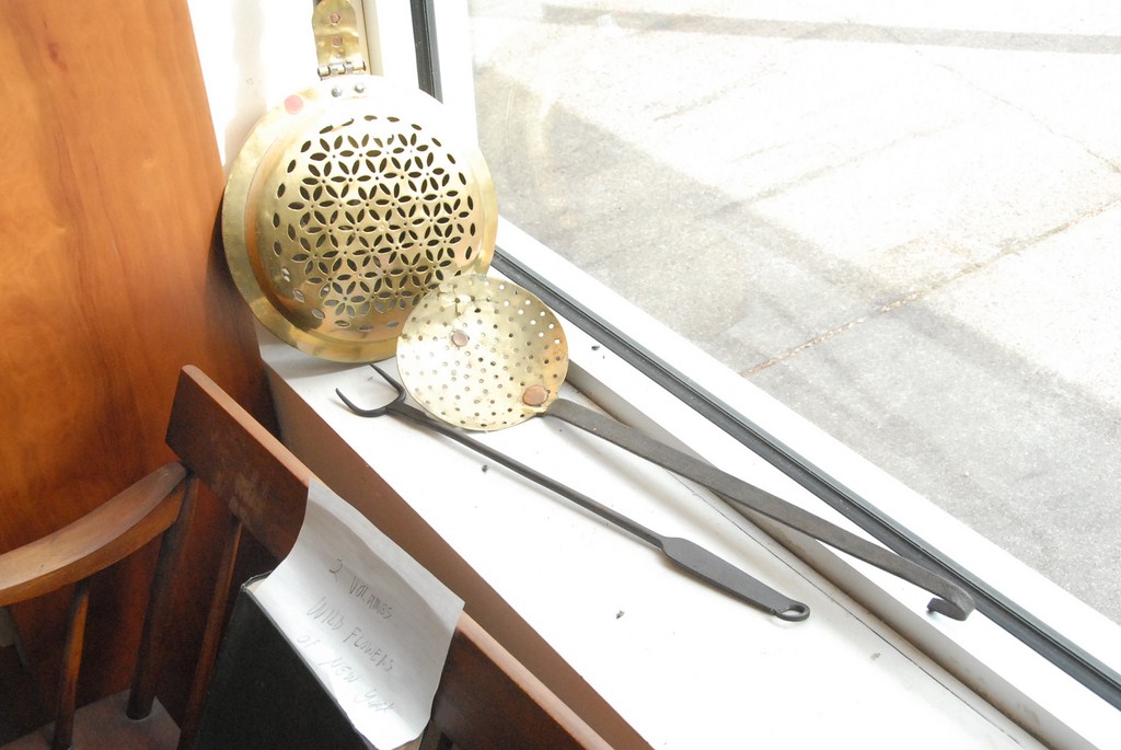 Group lot pierced brass bed warmer, strainer spoon, and iron fork.