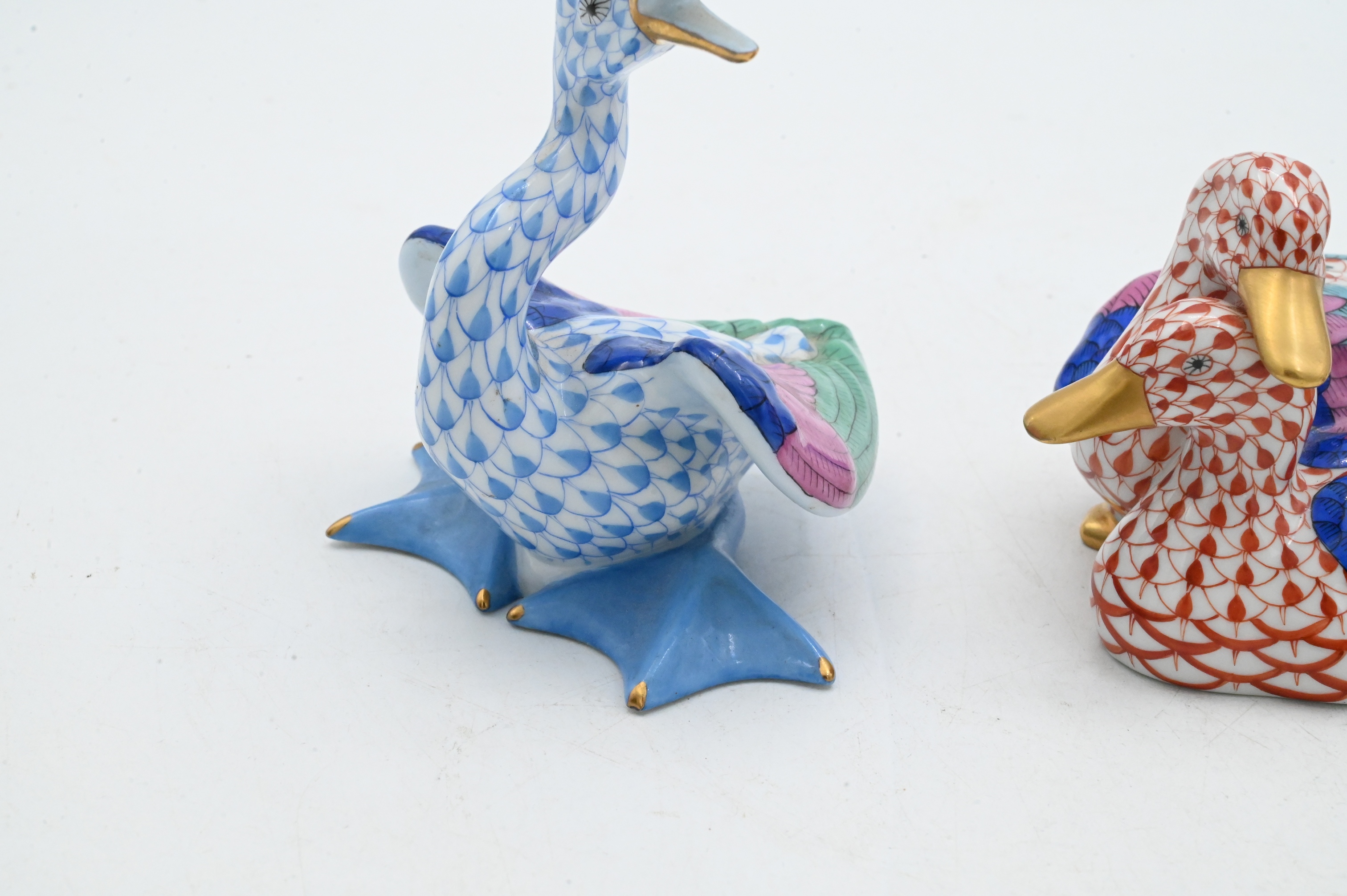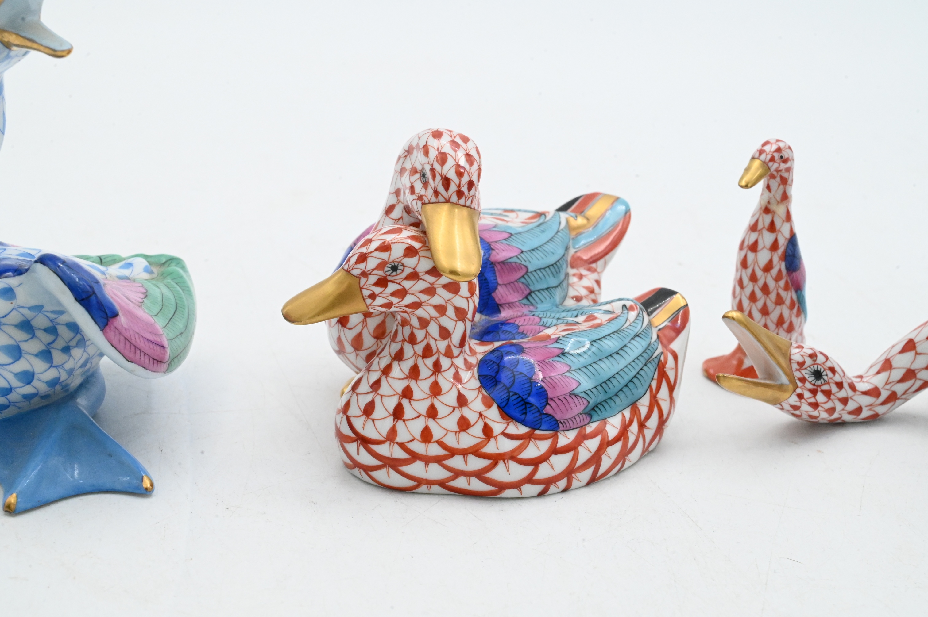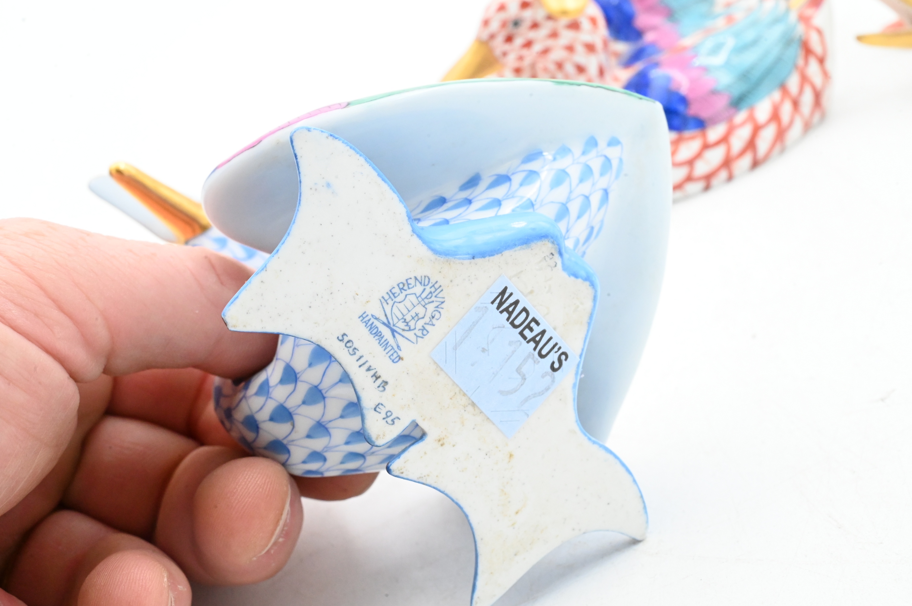 Including a red fishnet pelican, a red fishnet standing duck, a blue fishnet heron, and a red fishnet pair of ducks, each with gilt highlights and marked Herend Hungary Handpainted.