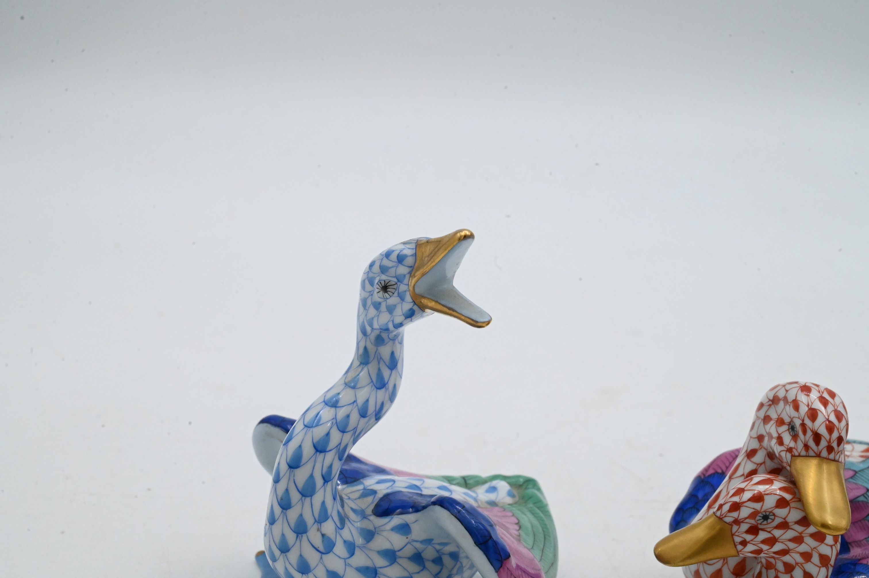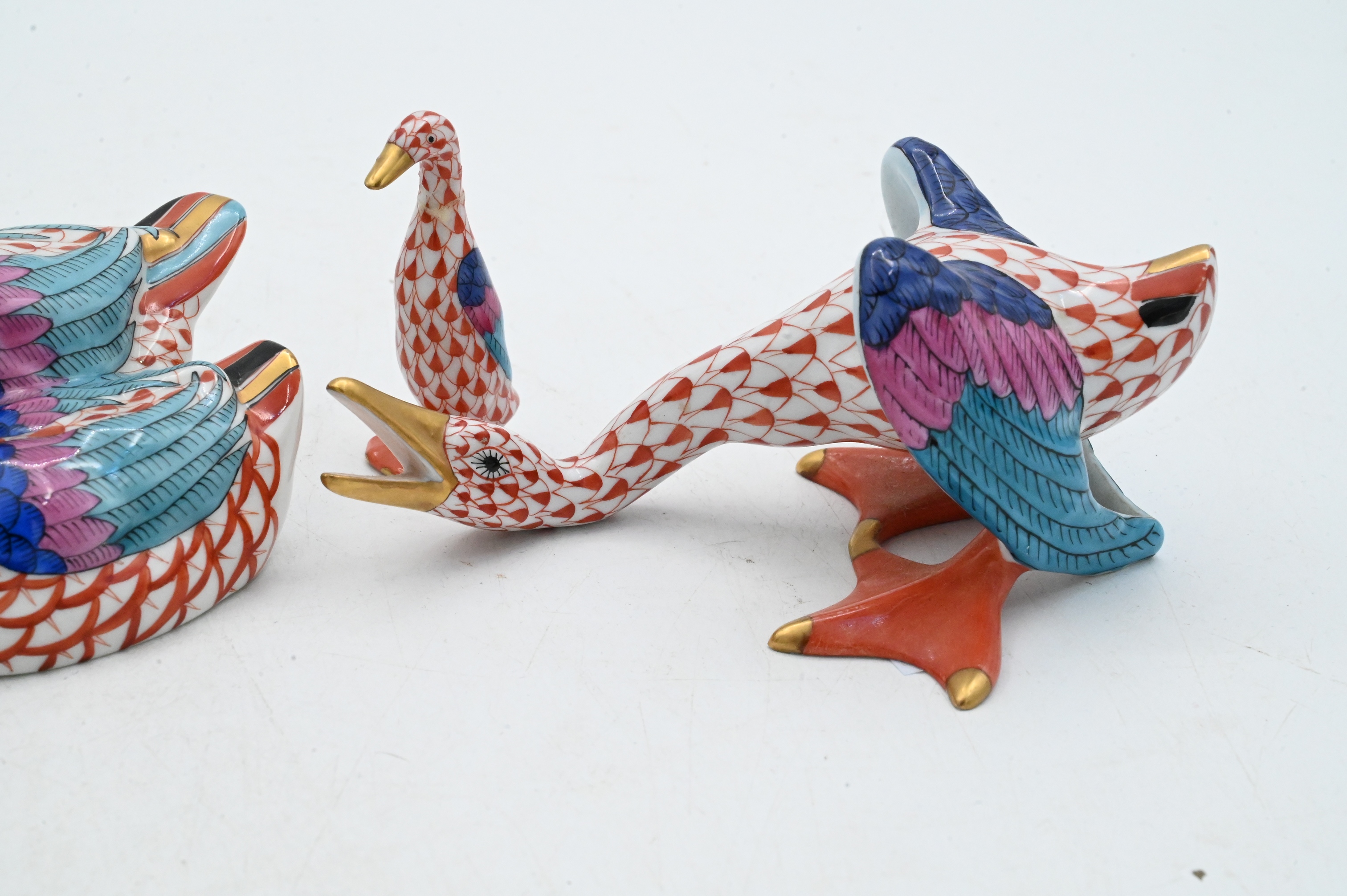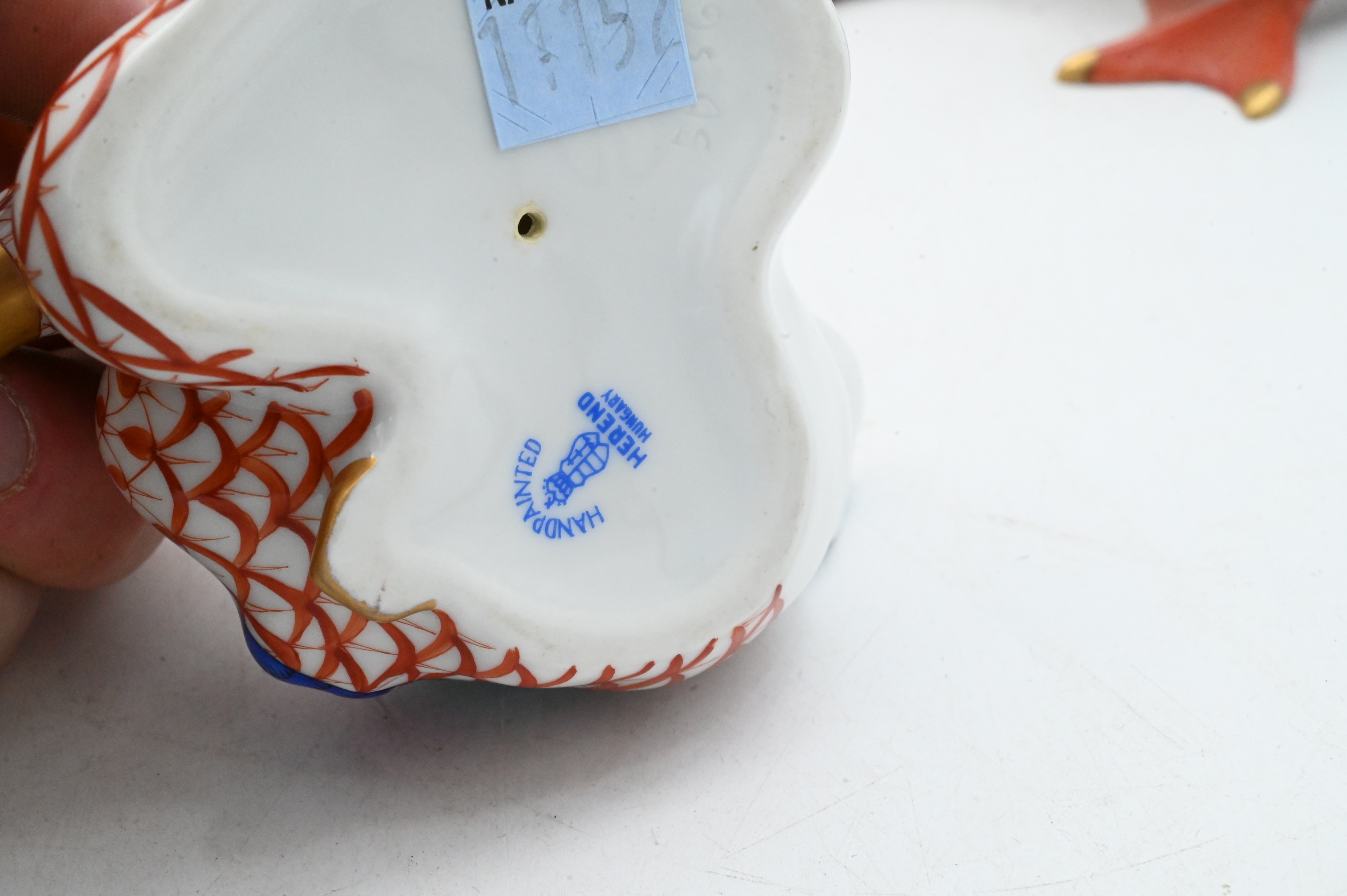 Including a red fishnet pelican, a red fishnet standing duck, a blue fishnet heron, and a red fishnet pair of ducks, each with gilt highlights and marked Herend Hungary Handpainted.
