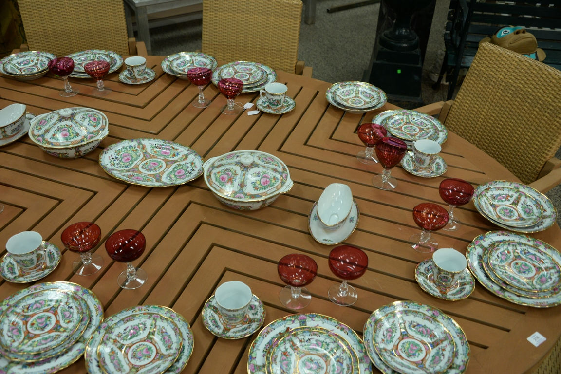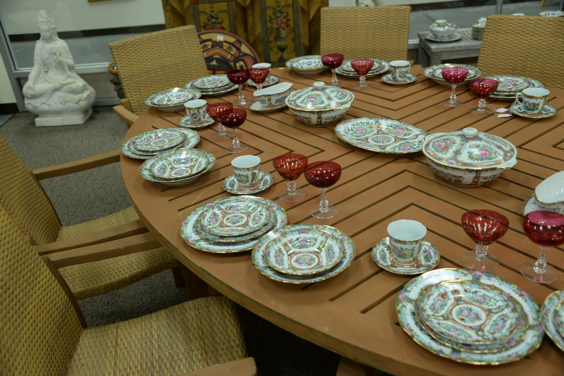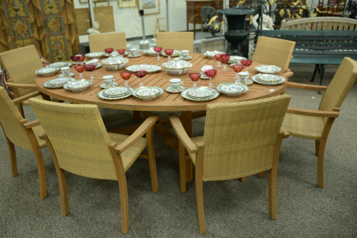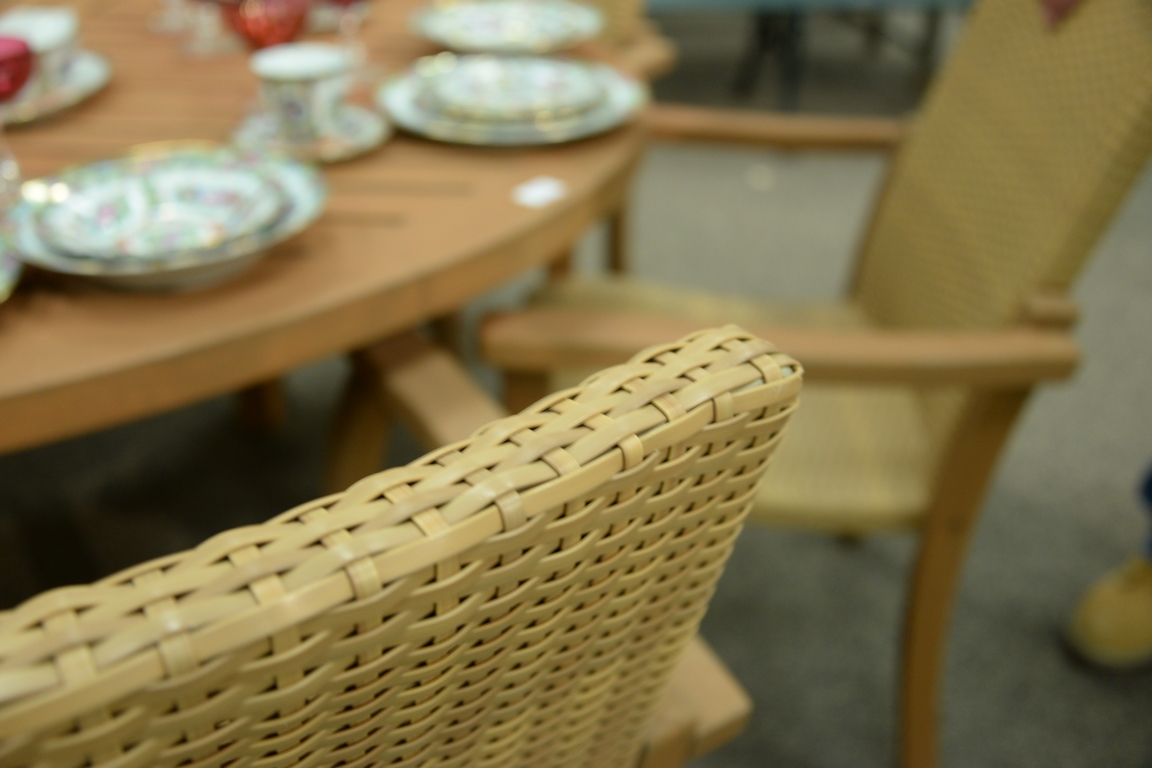 Lot 216: Janus et Cie and Donghia nine piece teak lot including Donghia oval table and eight Janus et Cie armchairs with woven seats and back…