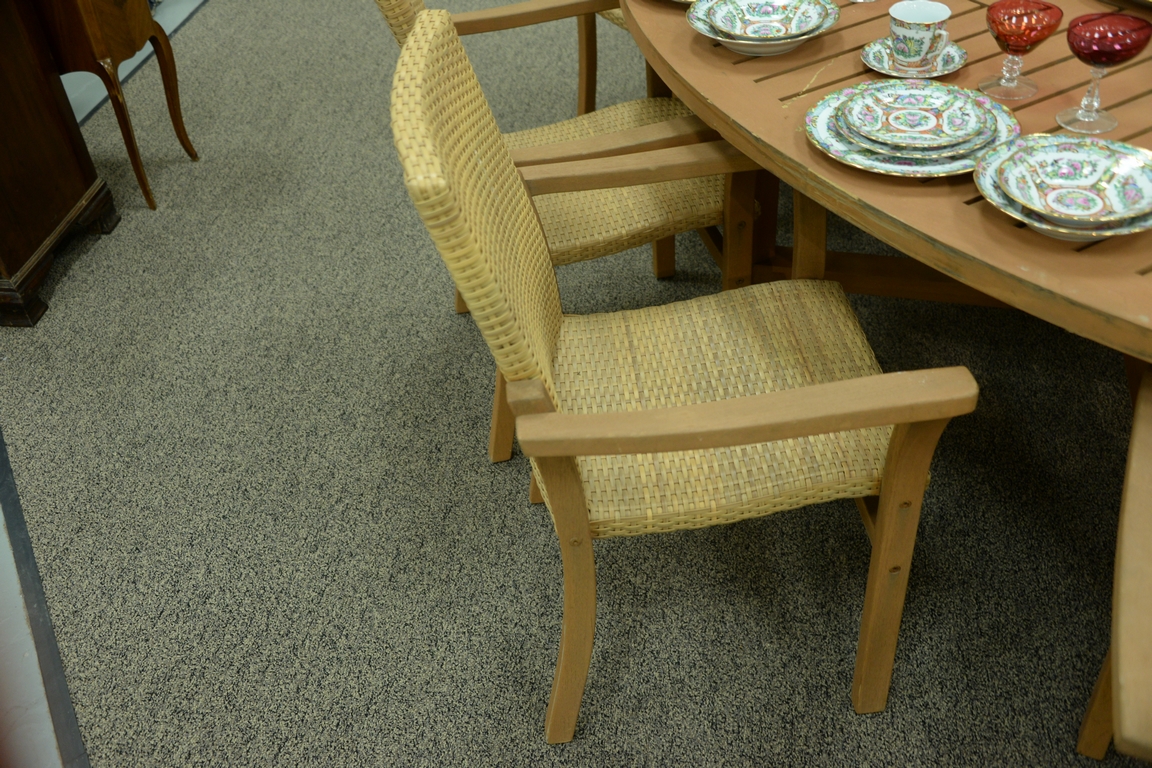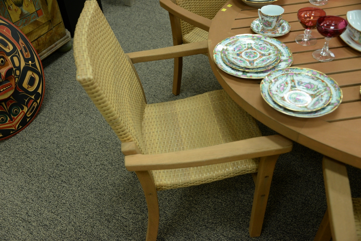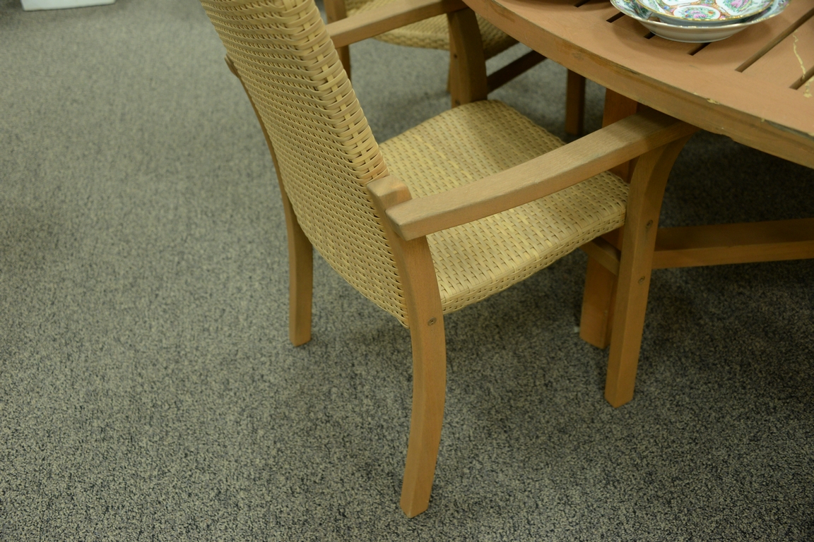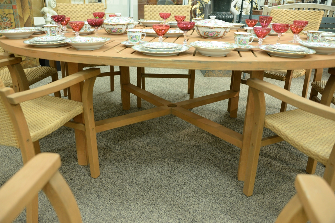 Janus et Cie and Donghia nine piece teak lot including Donghia oval table and eight Janus et Cie armchairs with woven seats and backs chairs retail for 1,239 each. . ht. 29 1/2 in., top: 63 x 92