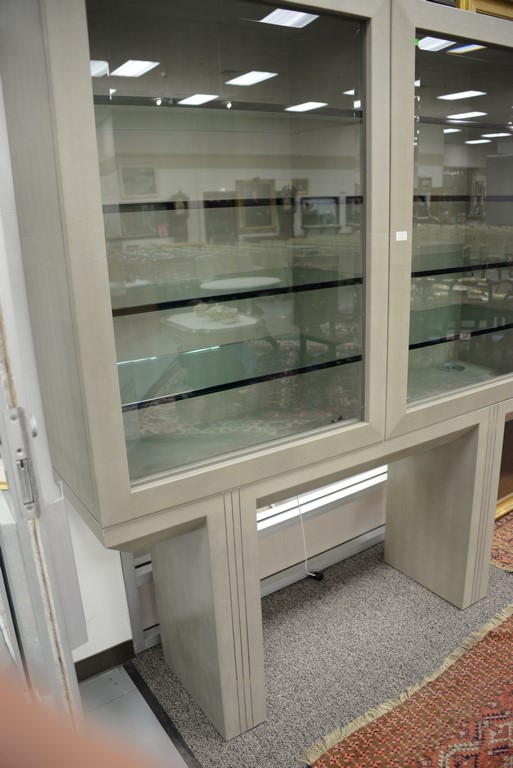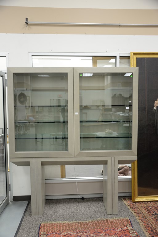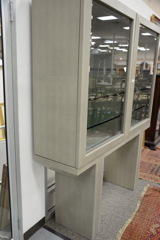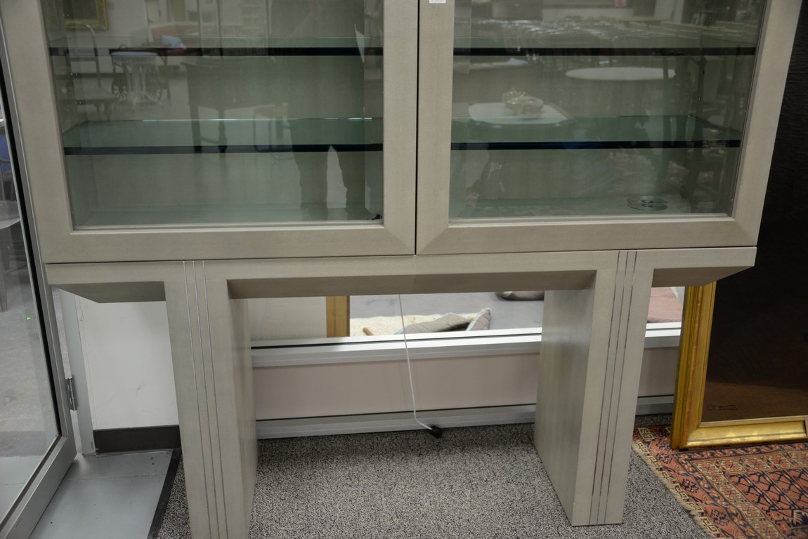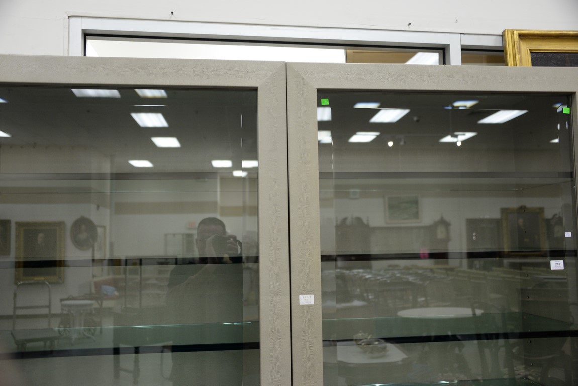 Lot 216: Karl Springer lizard veneer breakfront in two parts having two bevel glass doors with eight 1 thick glass shelves, all on modern ba…
