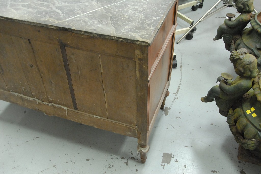 Louis XVI brass mounted walnut commode with a molded rectangular gray and white marble top above three long drawers with the drawer divided into three compartments the bottom two long drawers flanked by fluted pilasters and the whole with keyhole escutcheons, drawer pulls, and a straight apron raised on toupie feet, late 18th century restored – marble has crack. Provenance: From prominent Woodbridge, Connecticut family collection. ht. 33in. wd. 47in. dp. 20 1/2in.