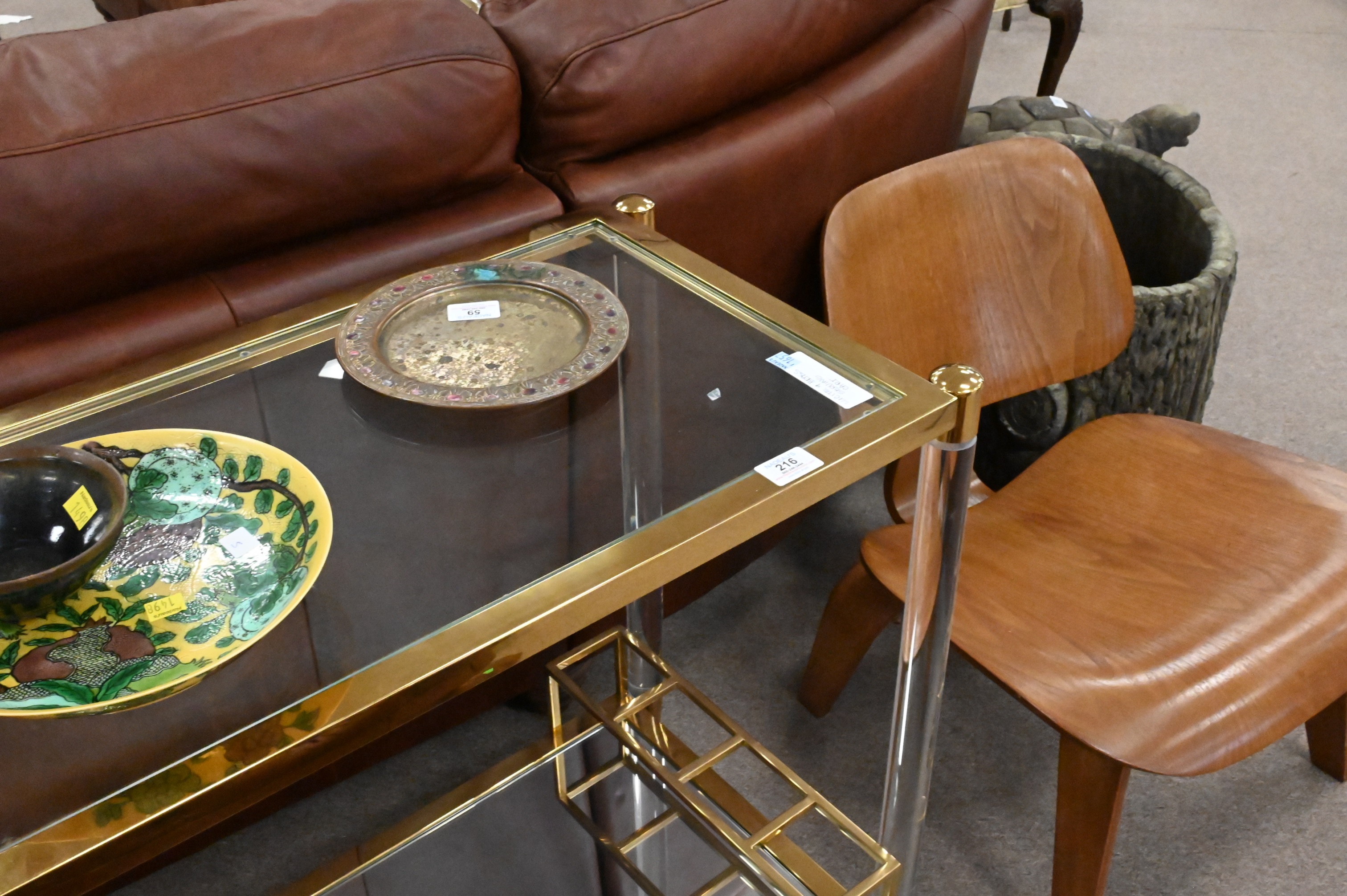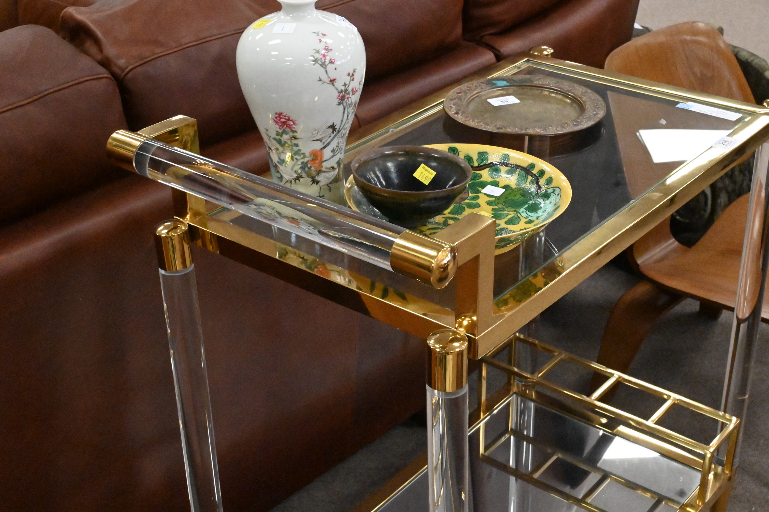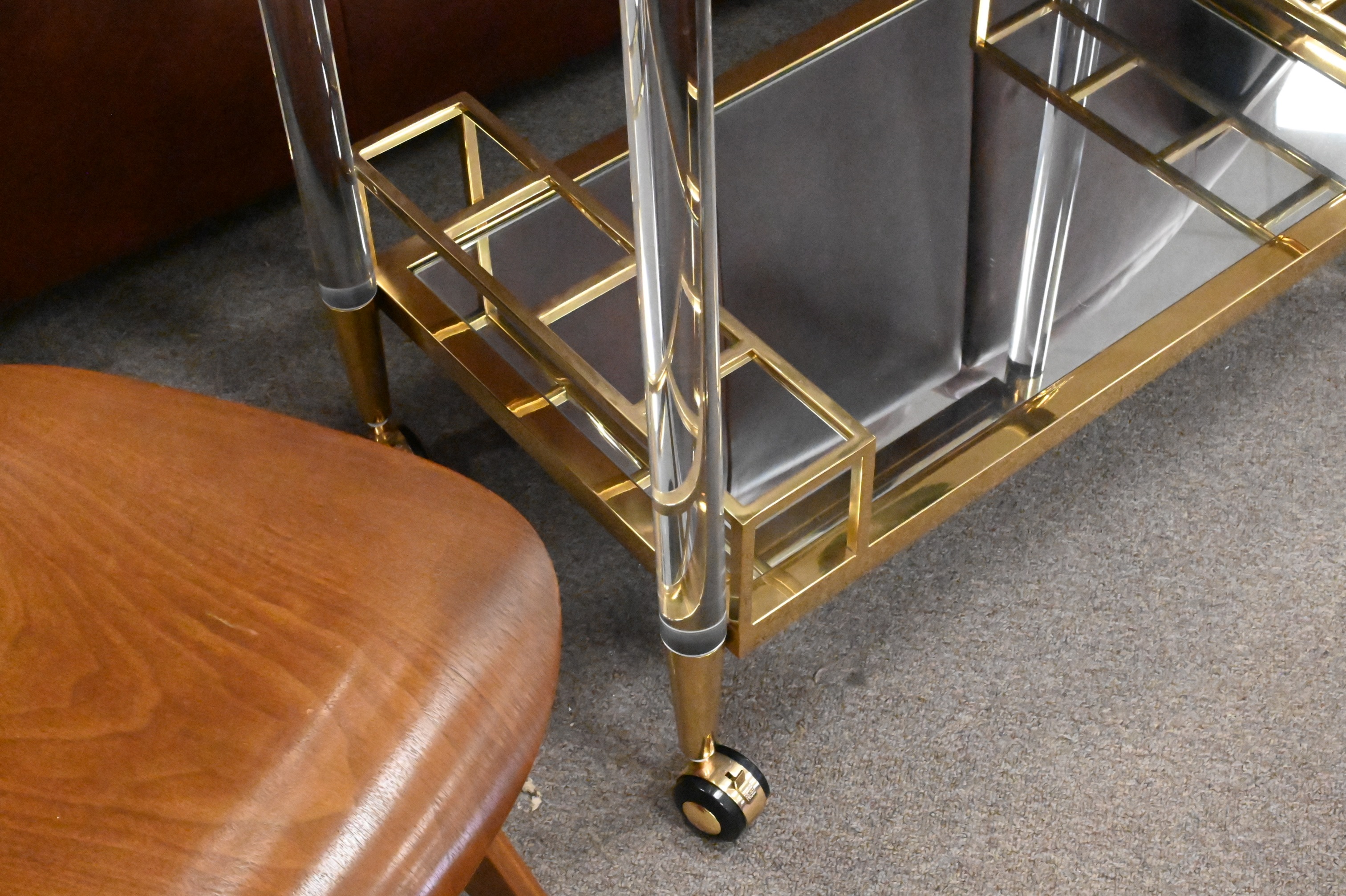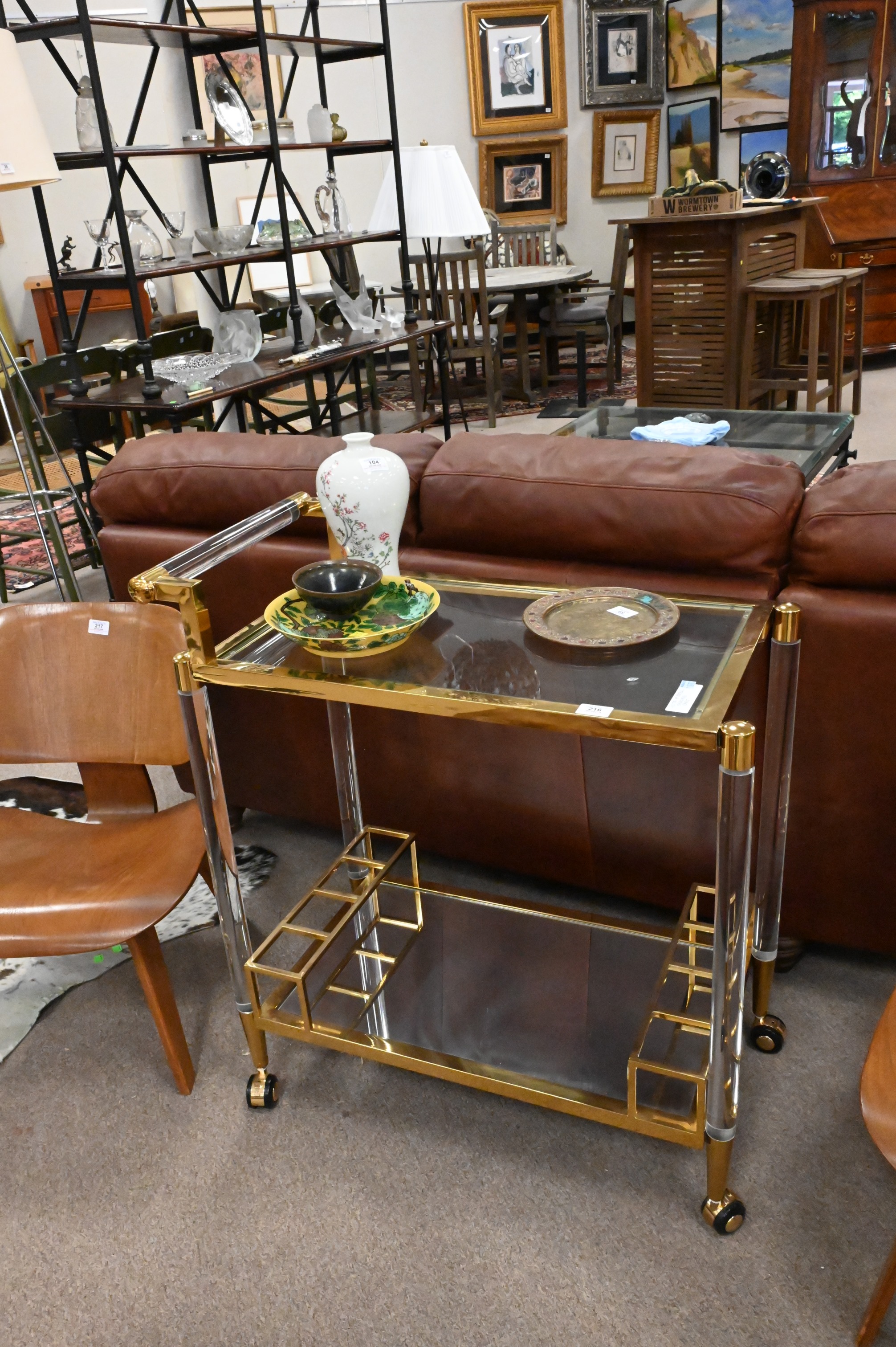 Lucite and Brass Bar/Serving Cart, having two tiers and bottle holders on lower level, height 35 inches, top 27″ x 16″