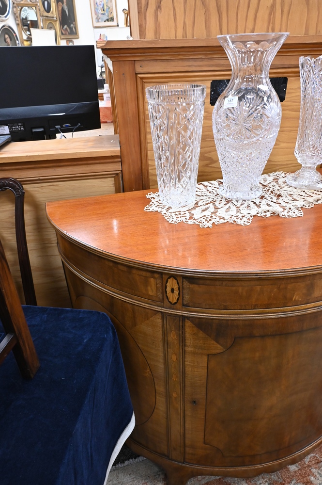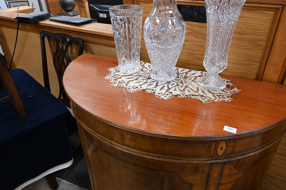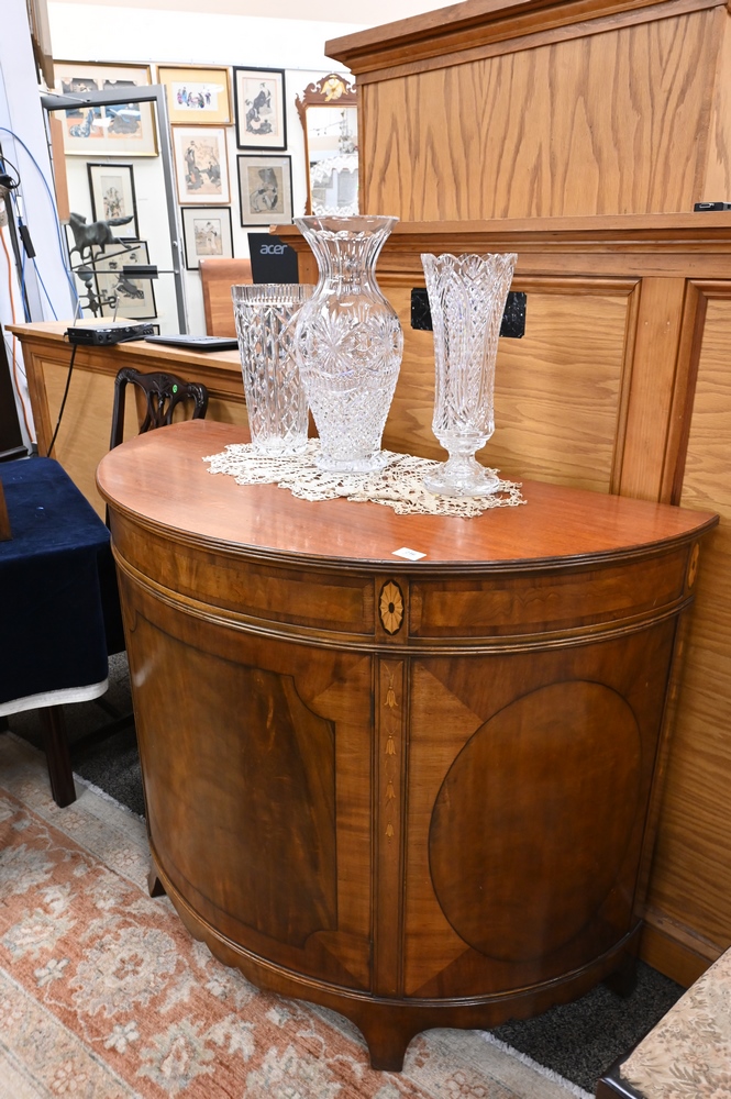 Lot 216: Mahogany Demilune Server, having inlaid front, attributed to Margolis, height 36 inches, top 21″ x 46″.