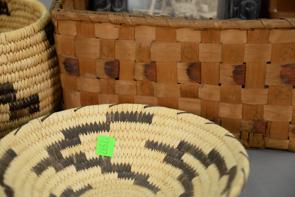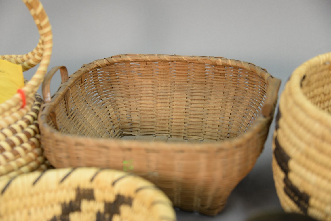 Lot 216: Nine piece lot including one Acoma bowl and eight baskets. bowl: ht. 2 3/4 in. dia. 5 1/2 in. and baskets ht. 2 1/4 in. dia. 3 in….