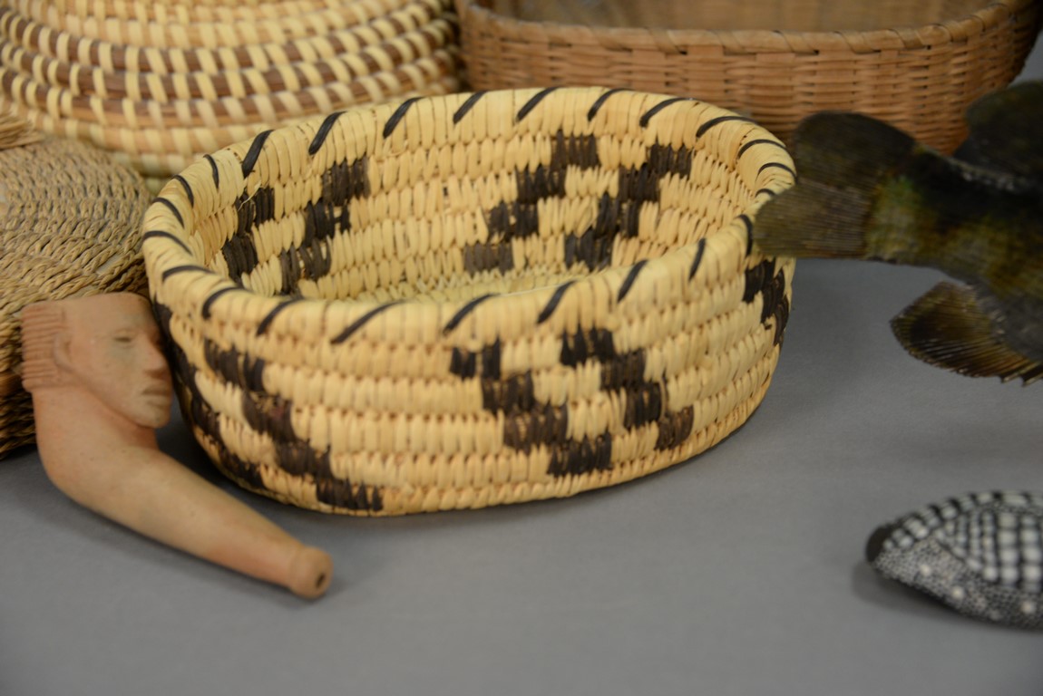 Nine piece lot including one Acoma bowl and eight baskets. bowl: ht. 2 3/4 in. dia. 5 1/2 in. and baskets ht. 2 1/4 in. dia. 3 in. to ht. 5 in. dia. 6 1/2 in.