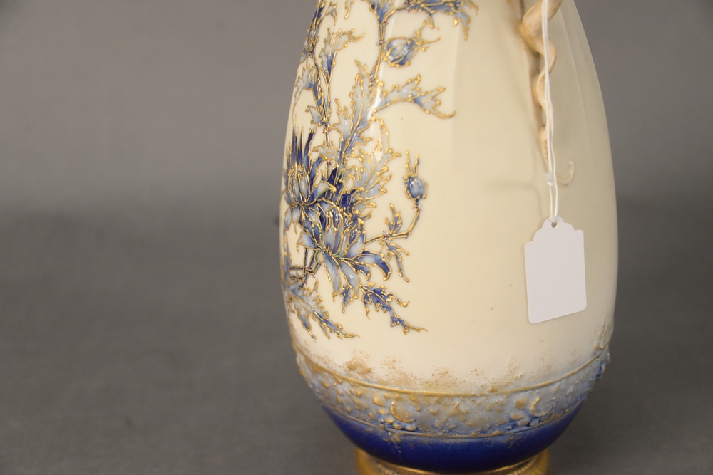 Porcelain Dragon Urn, having gilt dragon handle, paint decorated with gilt flowers, height 17 inches.