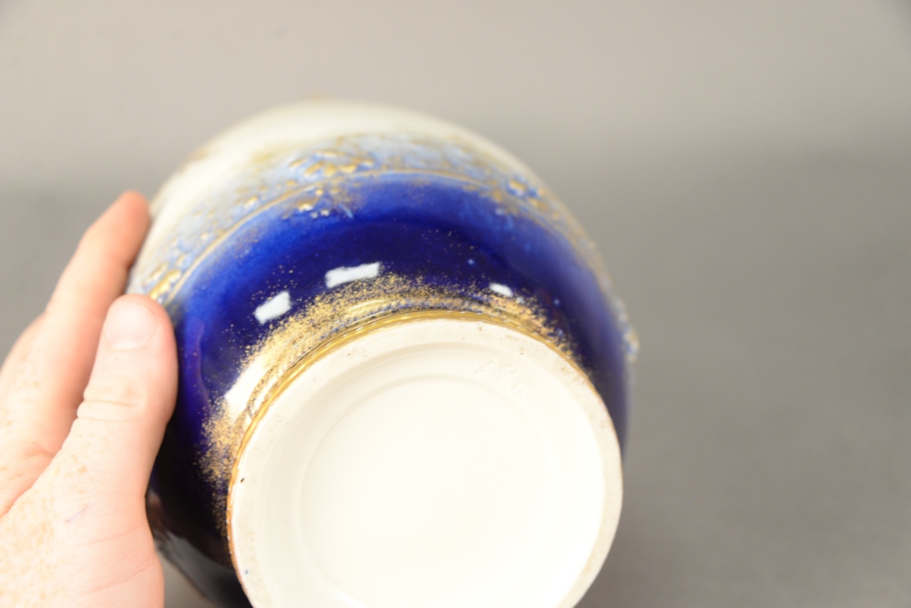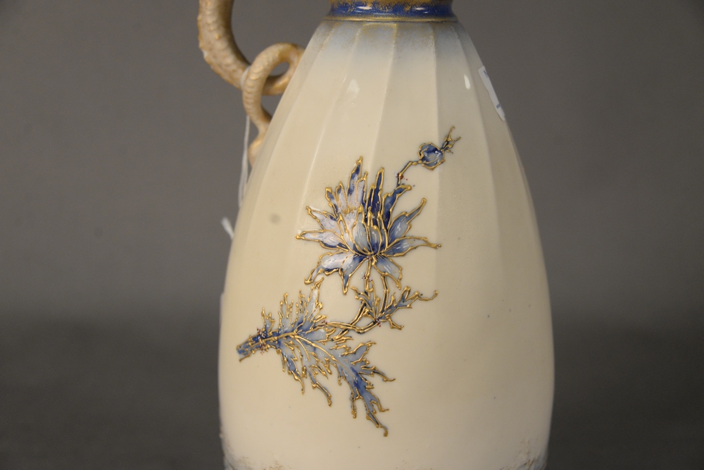 Lot 216: Porcelain Dragon Urn, having gilt dragon handle, paint decorated with gilt flowers, height 17 inches.