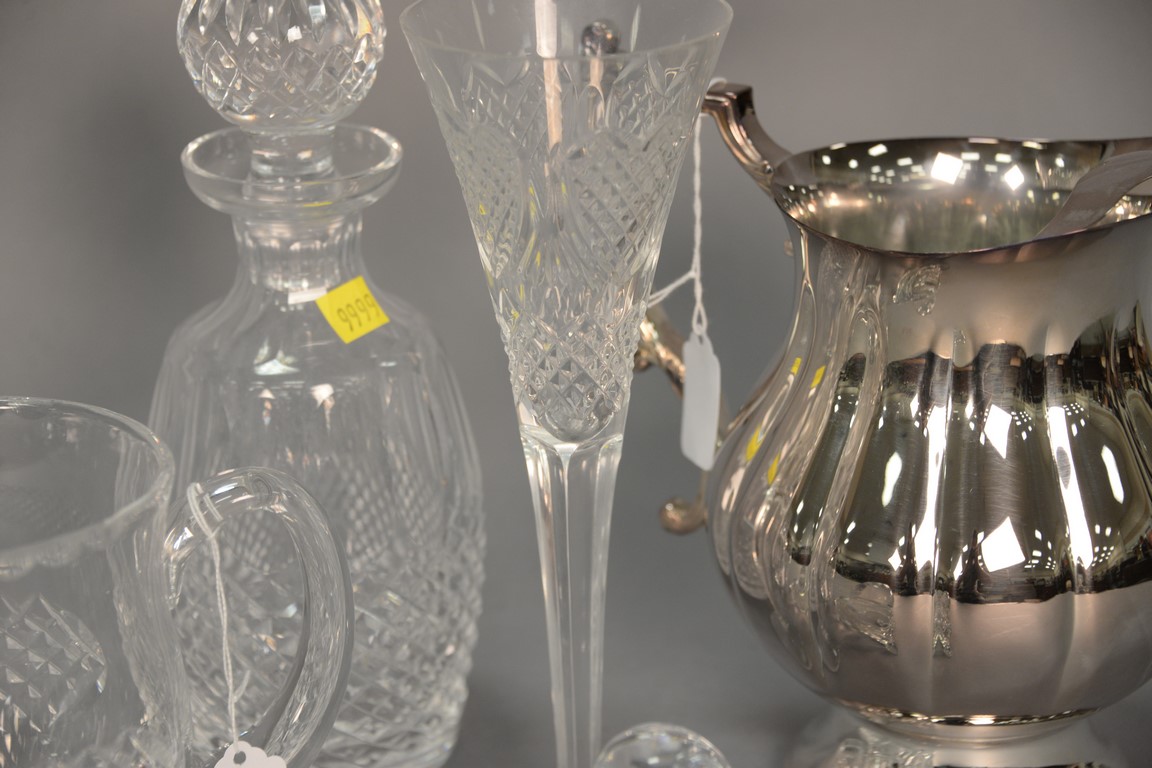 Seven piece Waterford lot including crystal vase, crystal decanter ht 10 1/2 in., crystal pitcher, pair of crystal stemmed champagnes, a crystal seal, and Waterford silverplated pitcher.