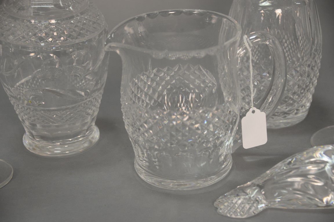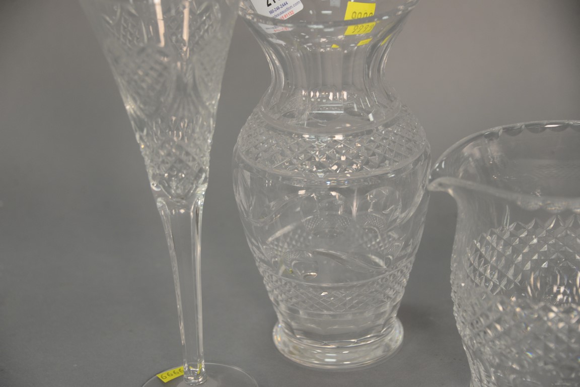 Lot 216: Seven piece Waterford lot including crystal vase, crystal decanter ht 10 1/2 in., crystal pitcher, pair of crystal stemmed champagne…