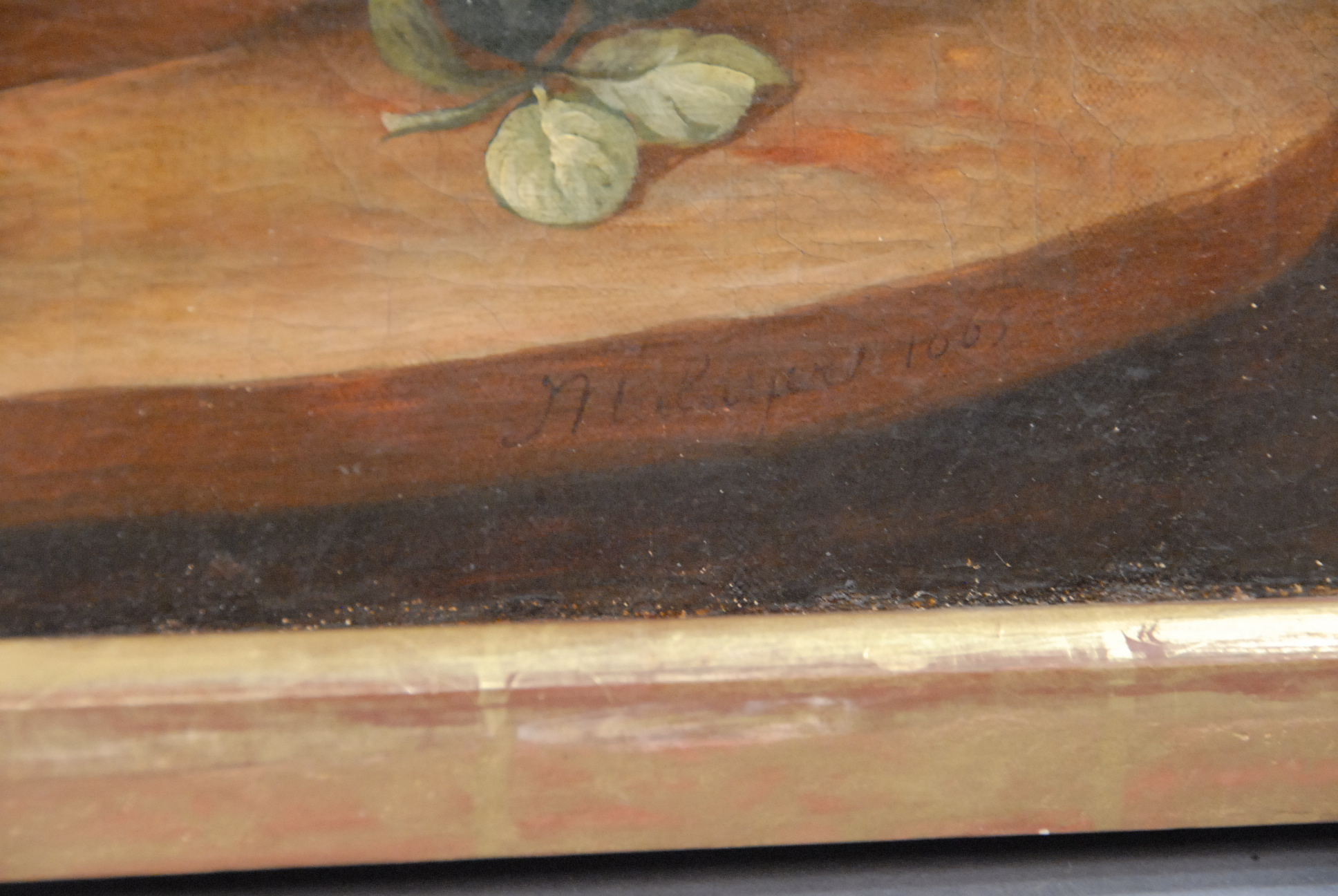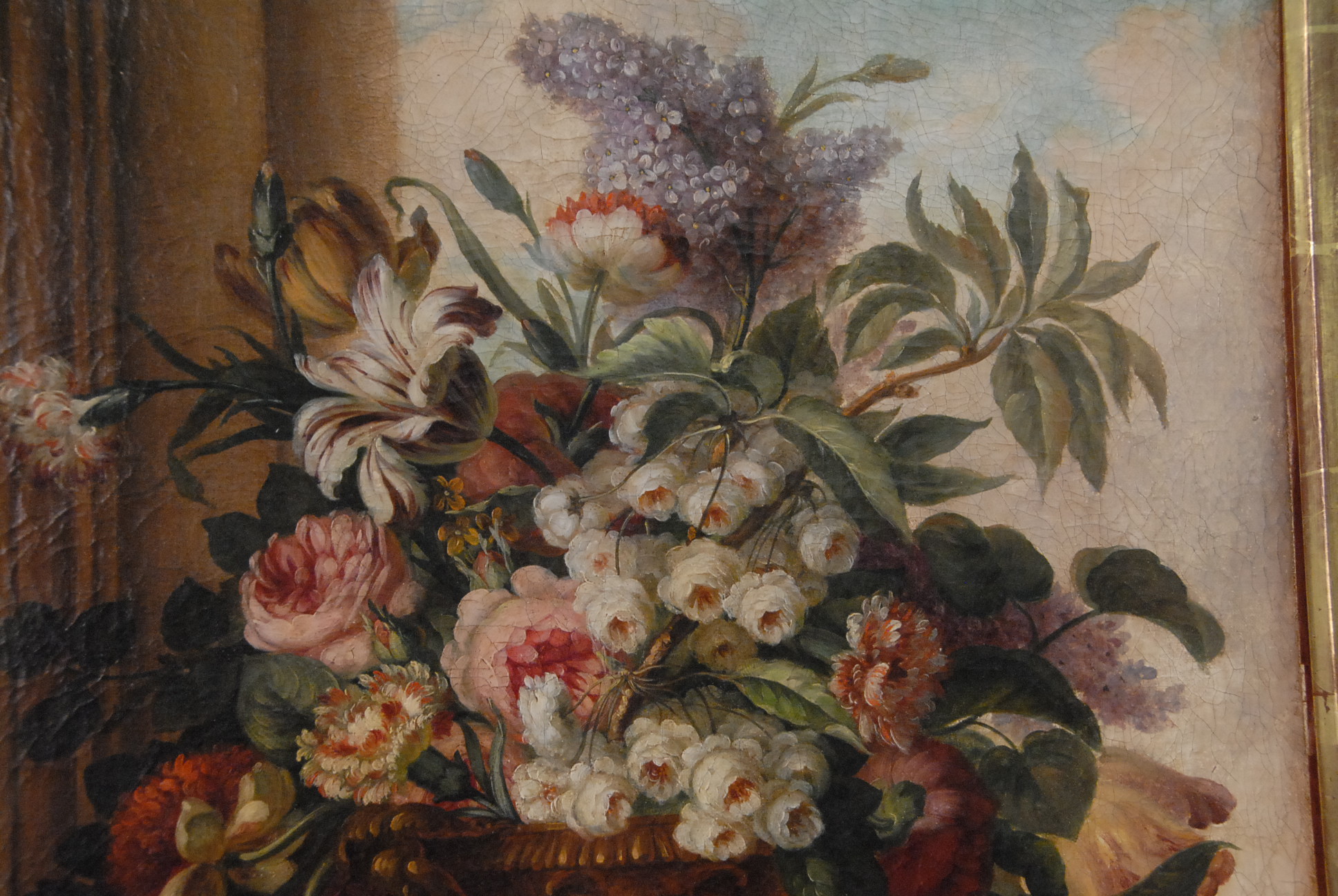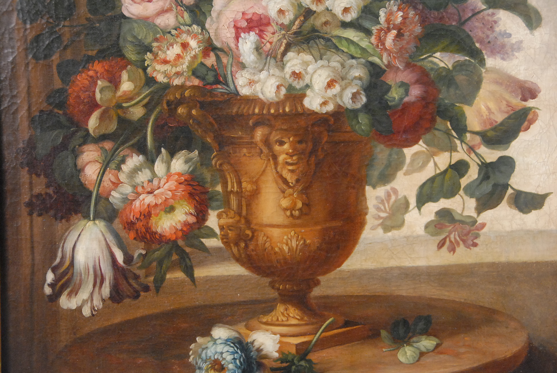 Still life of flowers in an urn, oil on canvas signed lower right indistinctly 1665, remounted & stretched.