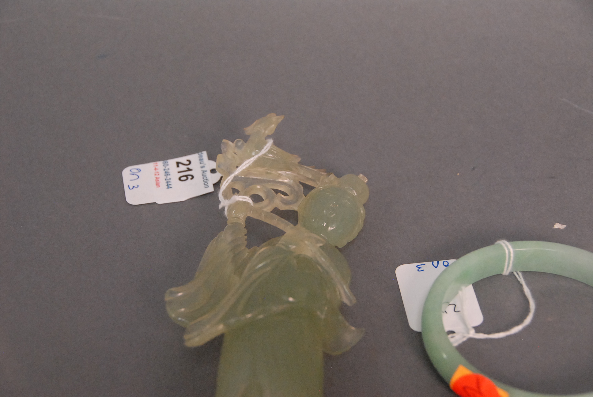 Lot 216: Three carved jade items to include a carved jade Guanyin figure holding blossoming flower with a bird on it ht. 9 1/4in. and two jad…