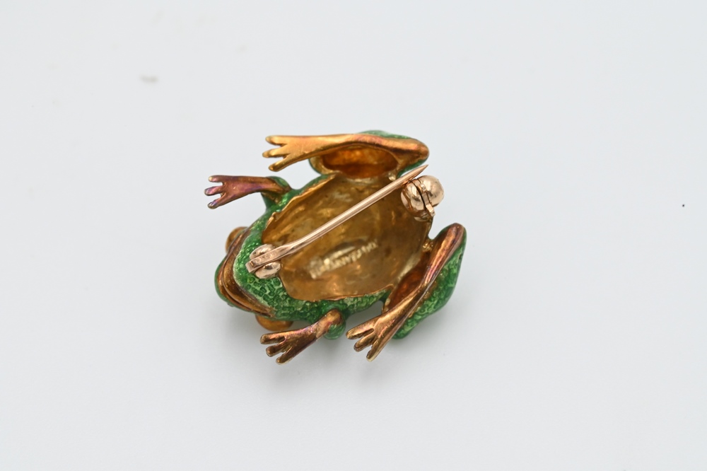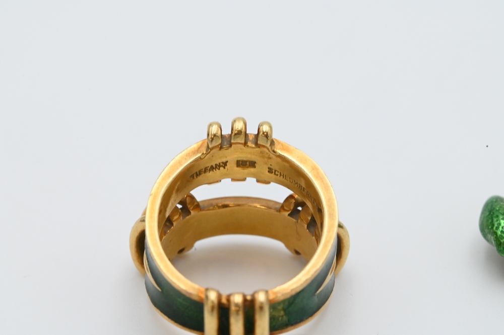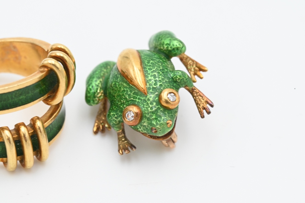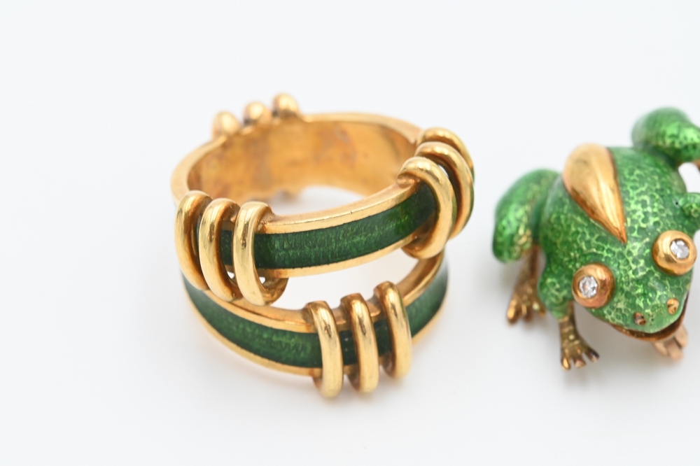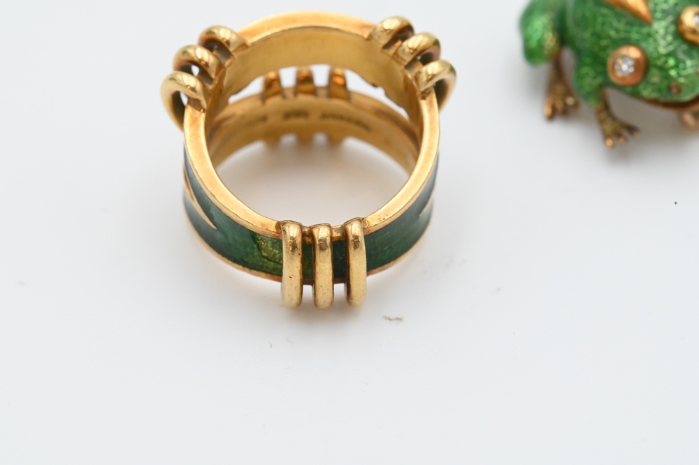 Two Piece Lot, to include a Tiffany & Company Schlumberger 18 karat gold and green enameled ring, along with Tiffany & Company 18 karat gold frog brooch having green enameling, 17.7 grams (chip in enameling at back of ring on one side).