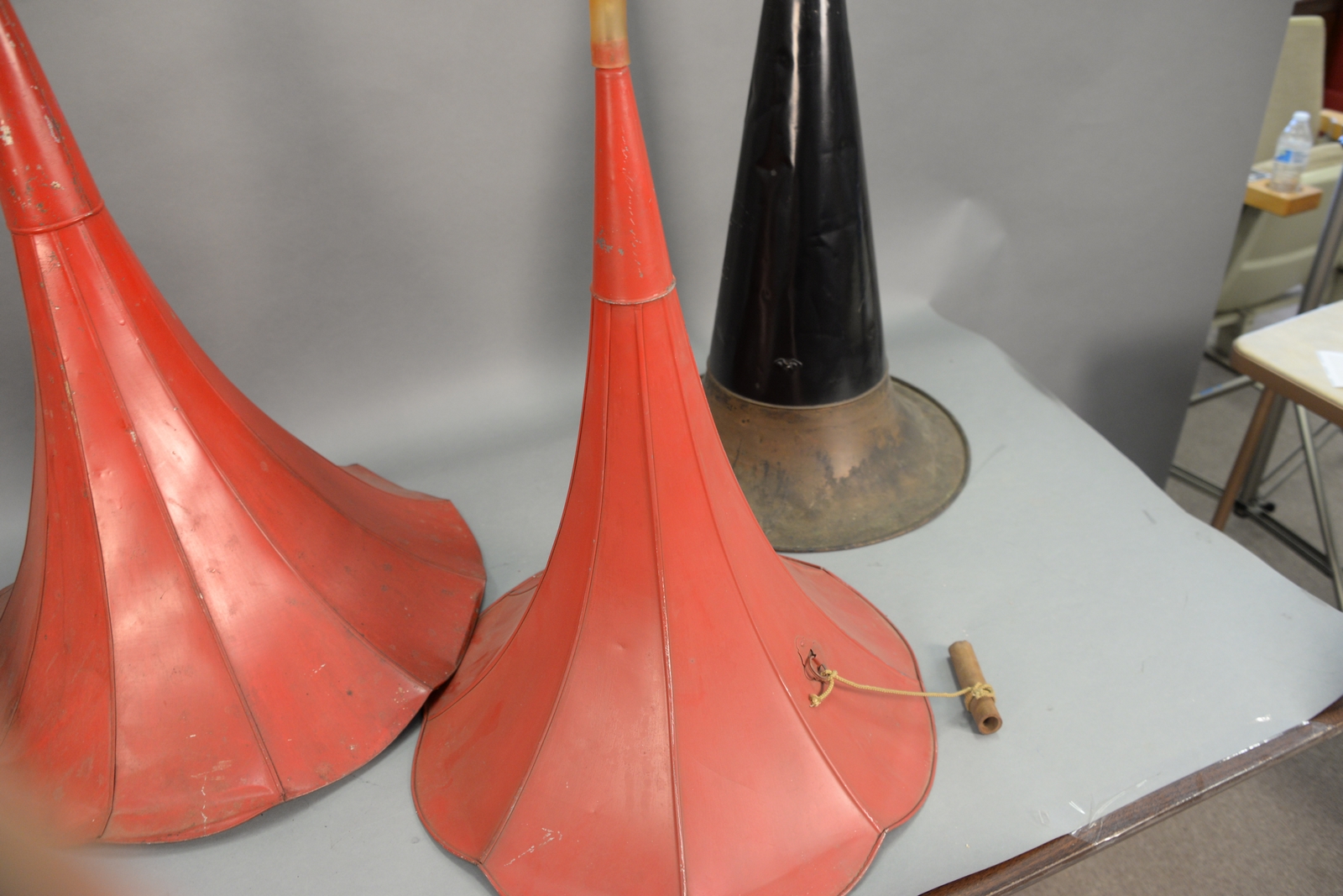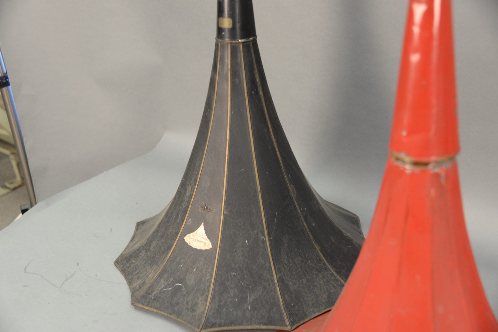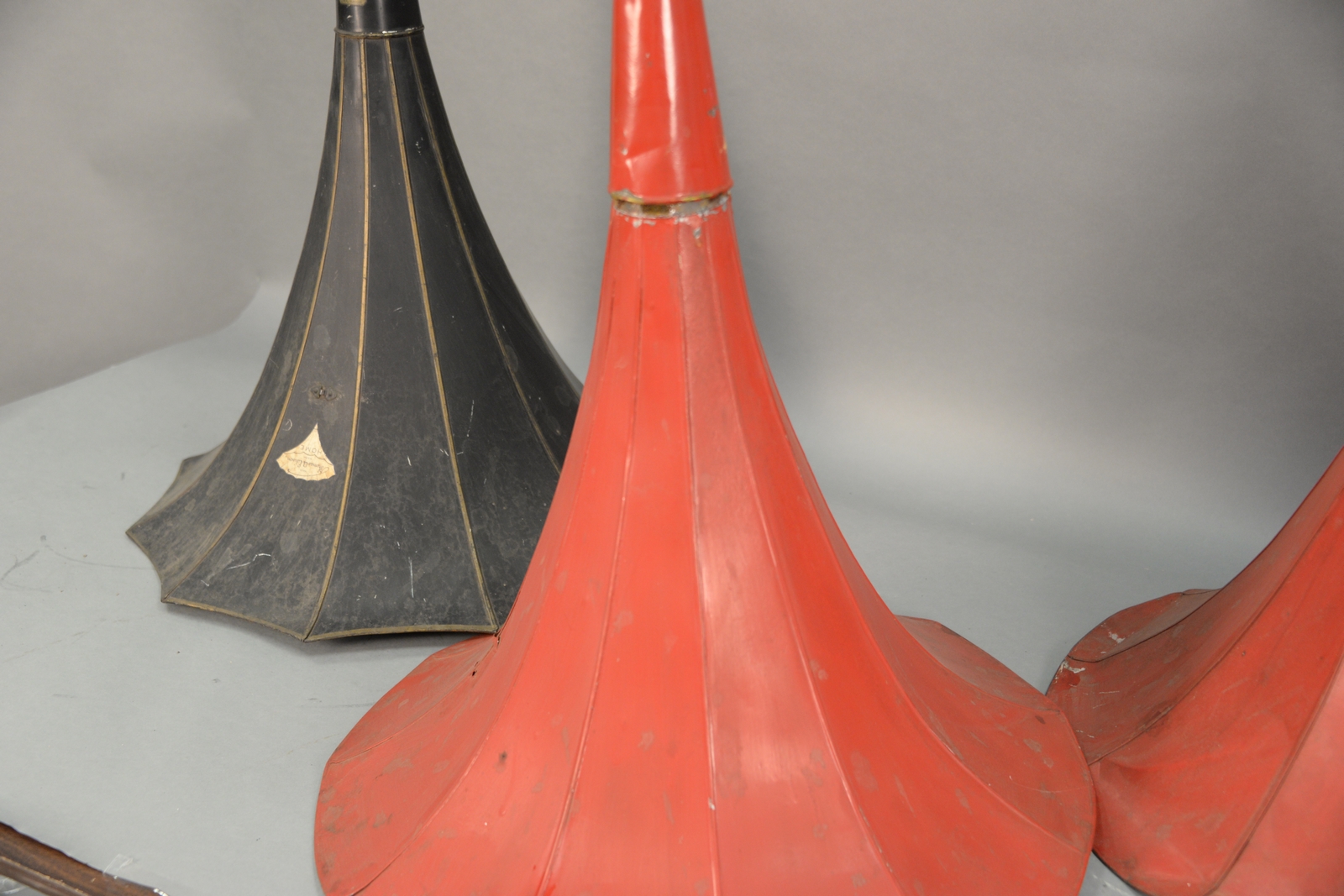 Five Edison phonograph horns. 26 1/2in. to 35in.
