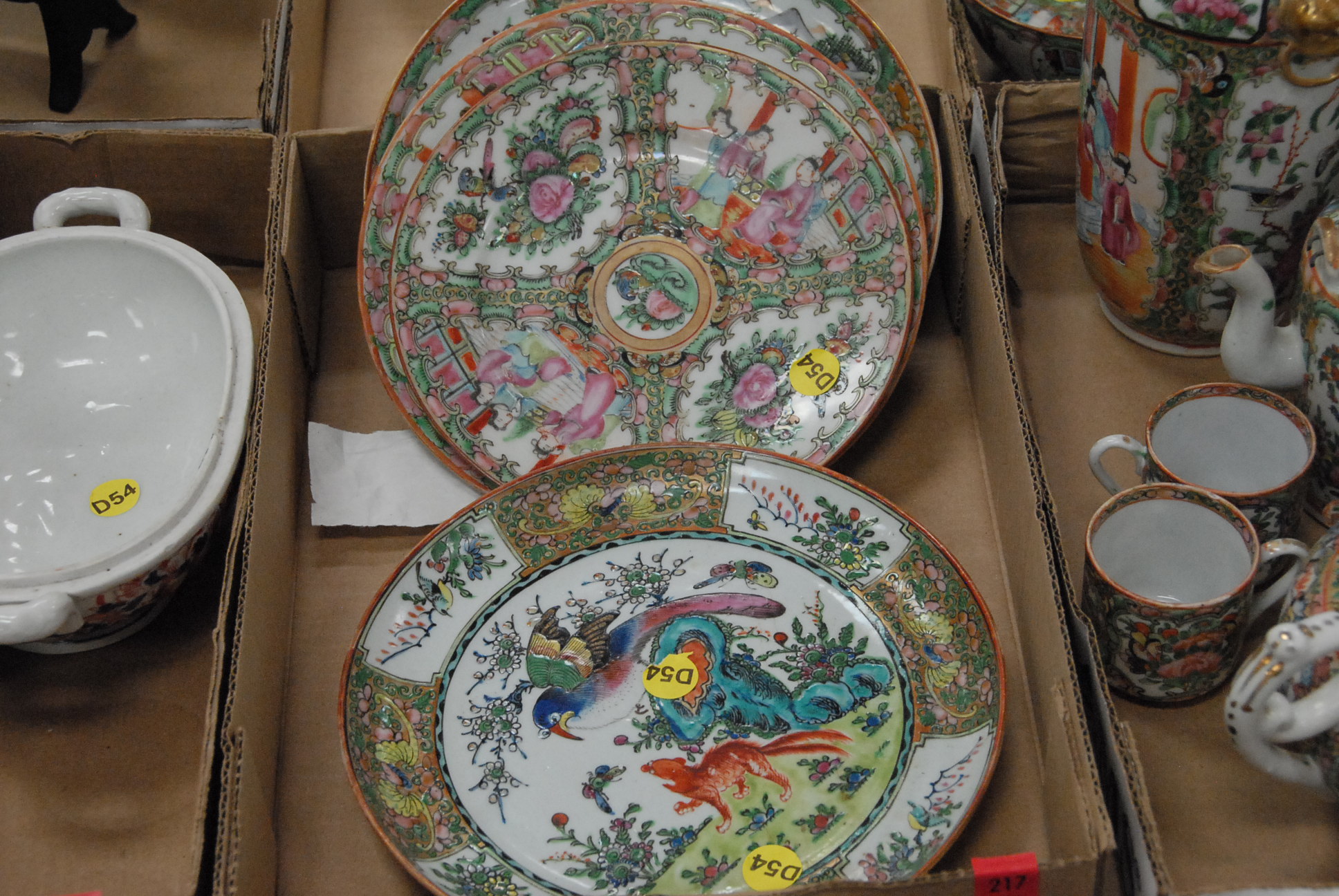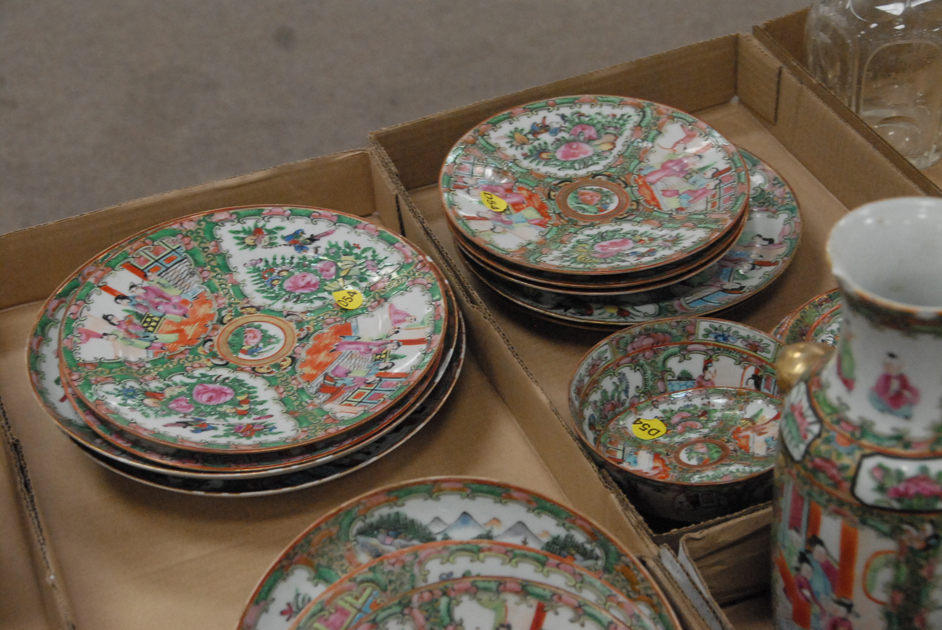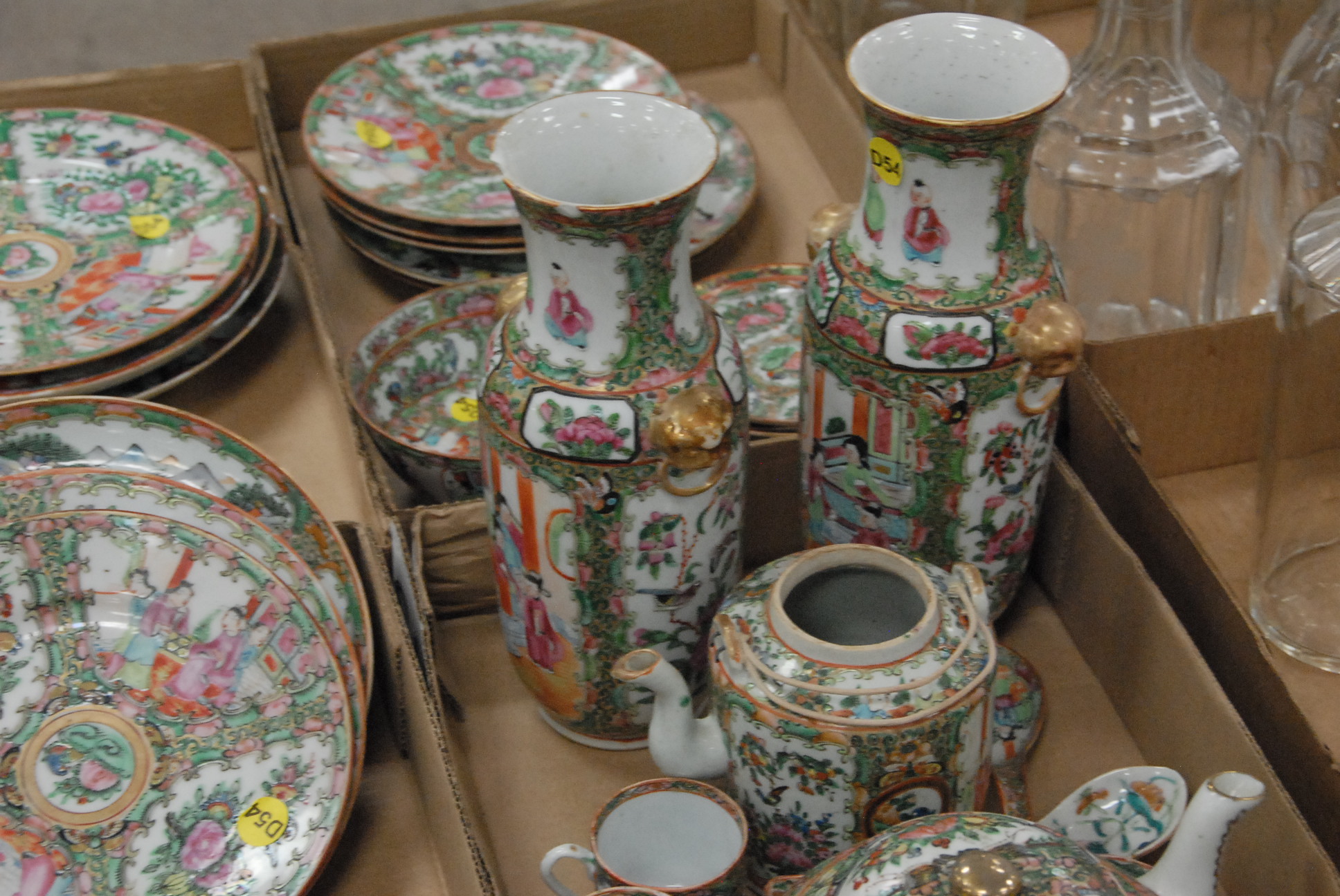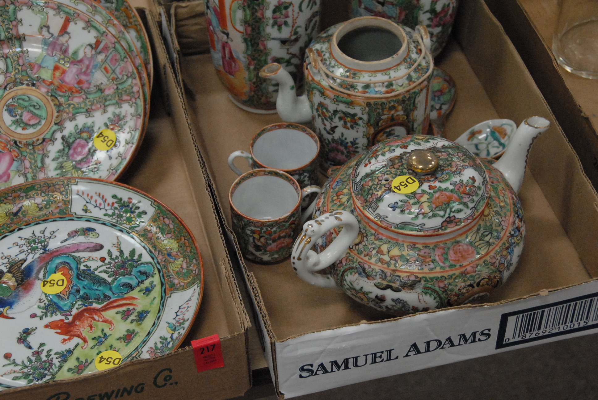 Four tray lots of Rose Famille to include a bowl, plates, two teapots, cups, and two vases
