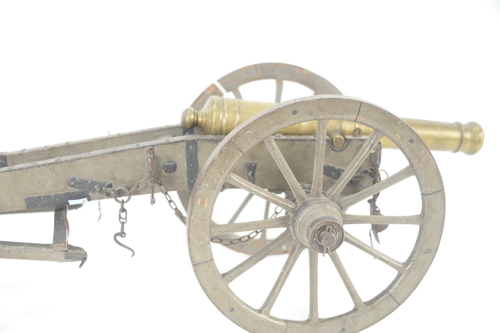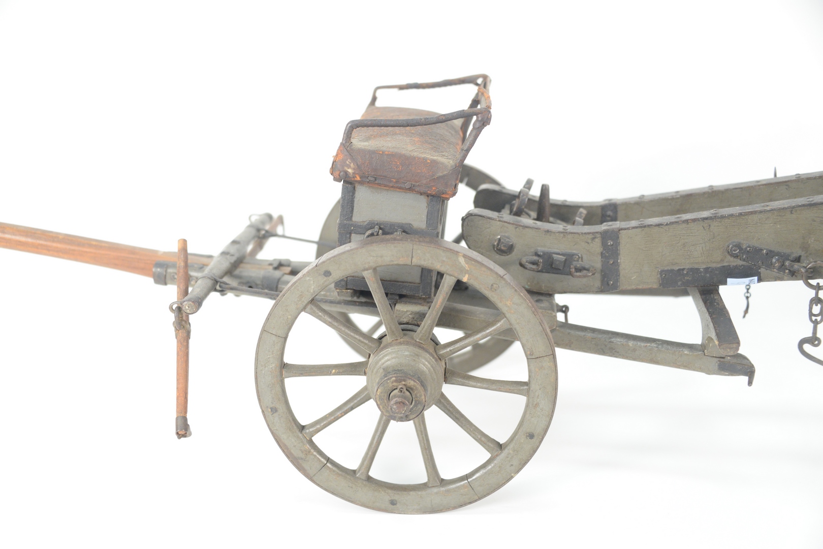 Lot 217: French Model Field Cannon with Limber, made of iron and grey painted wood with ammo box, rare facing leather seat and heavy brass adjustable cannon, length 45 inches.