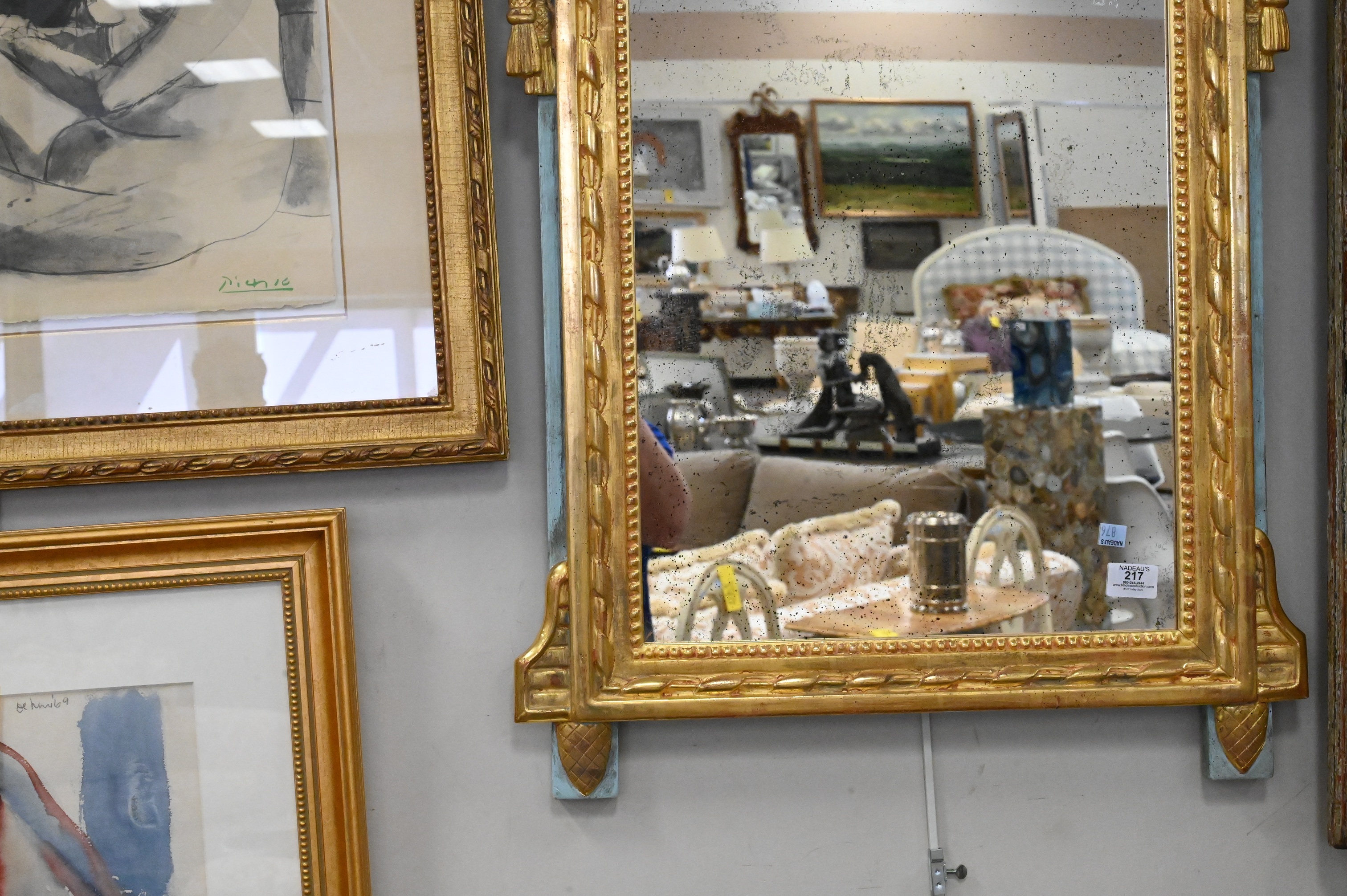 having ornate openwork pediment with scrolling foliate, musical instruments, and tassels traveling down to blue painted border and pineapple accents
