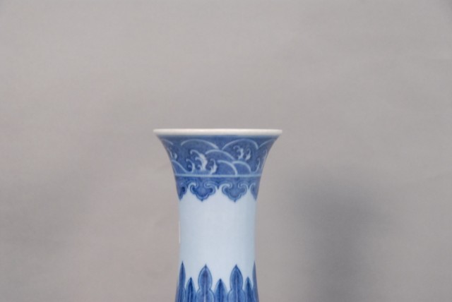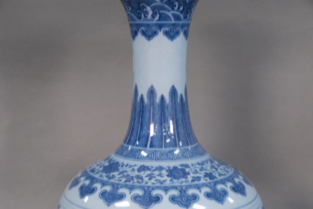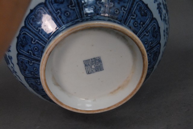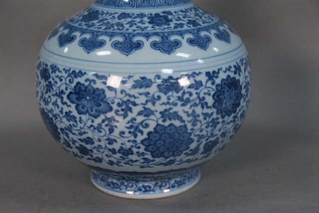 Globular blue and light. blue vase with scrolling vines and blossoming flowers