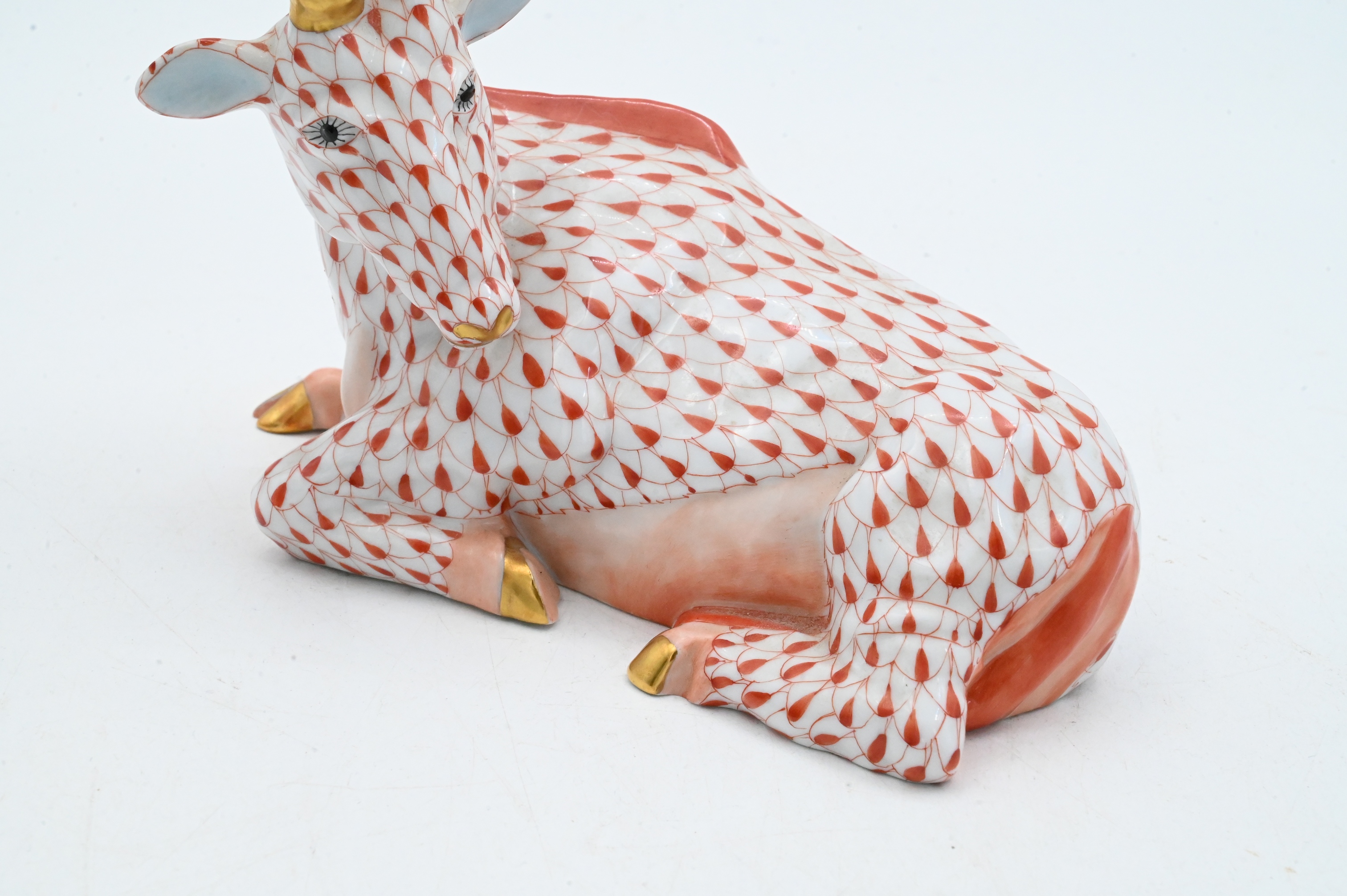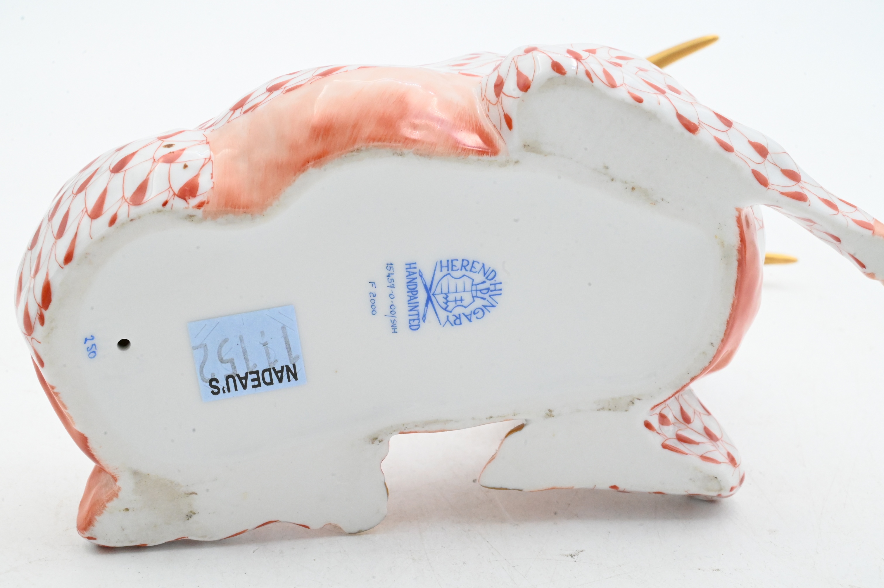 Orange fishnet pattern with gilt horns and hooves, marked Herend Hungary Handpainted, numbered 15457-0-00/SVH and dated F 2000 on underside.