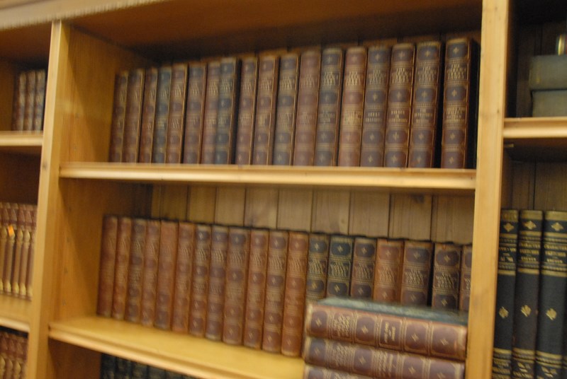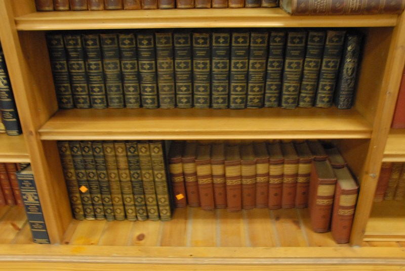 Lot 217: Leather books, large grouping in cabinet, mostly leather bindings, approximately 155 books in total.