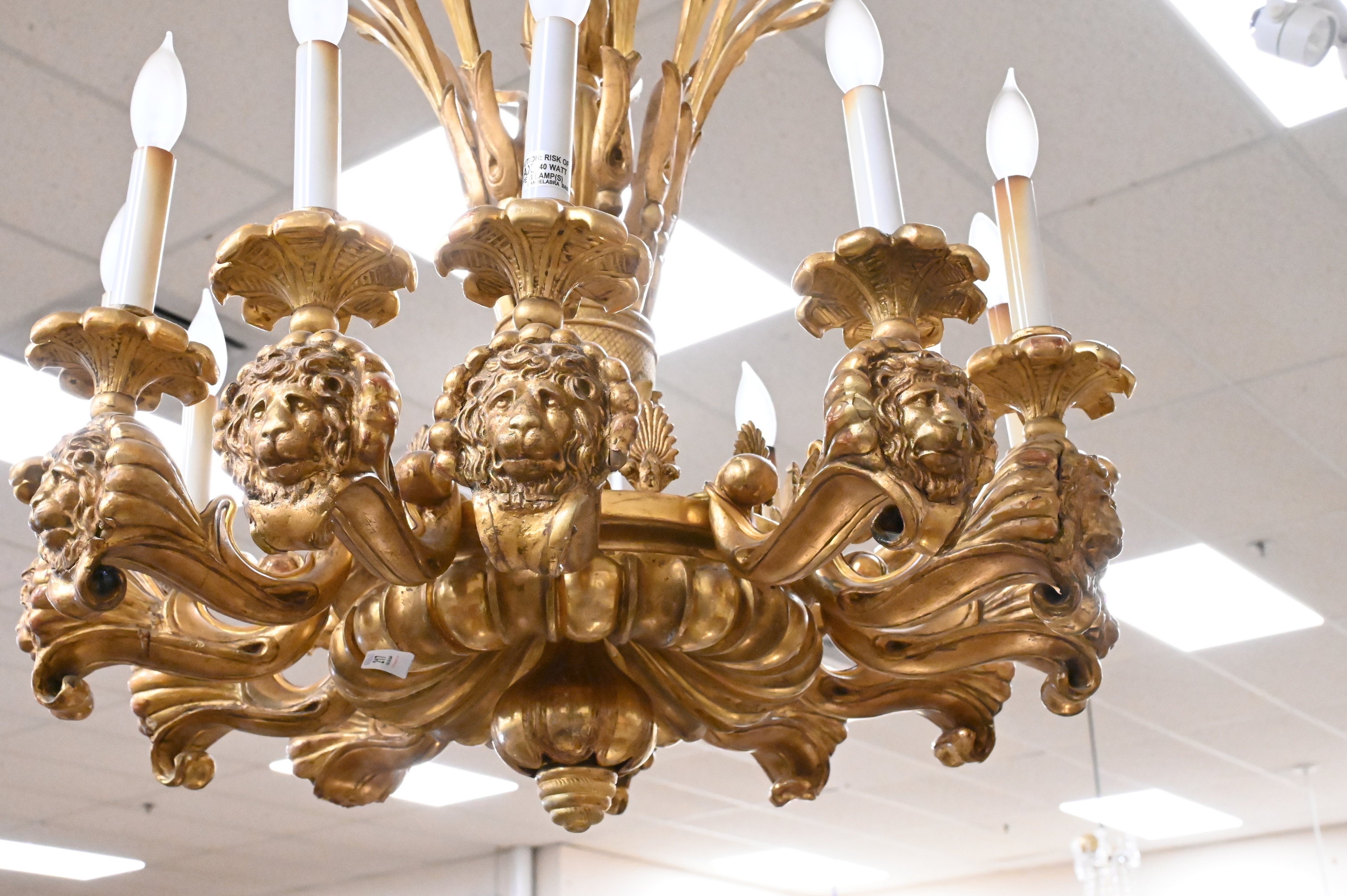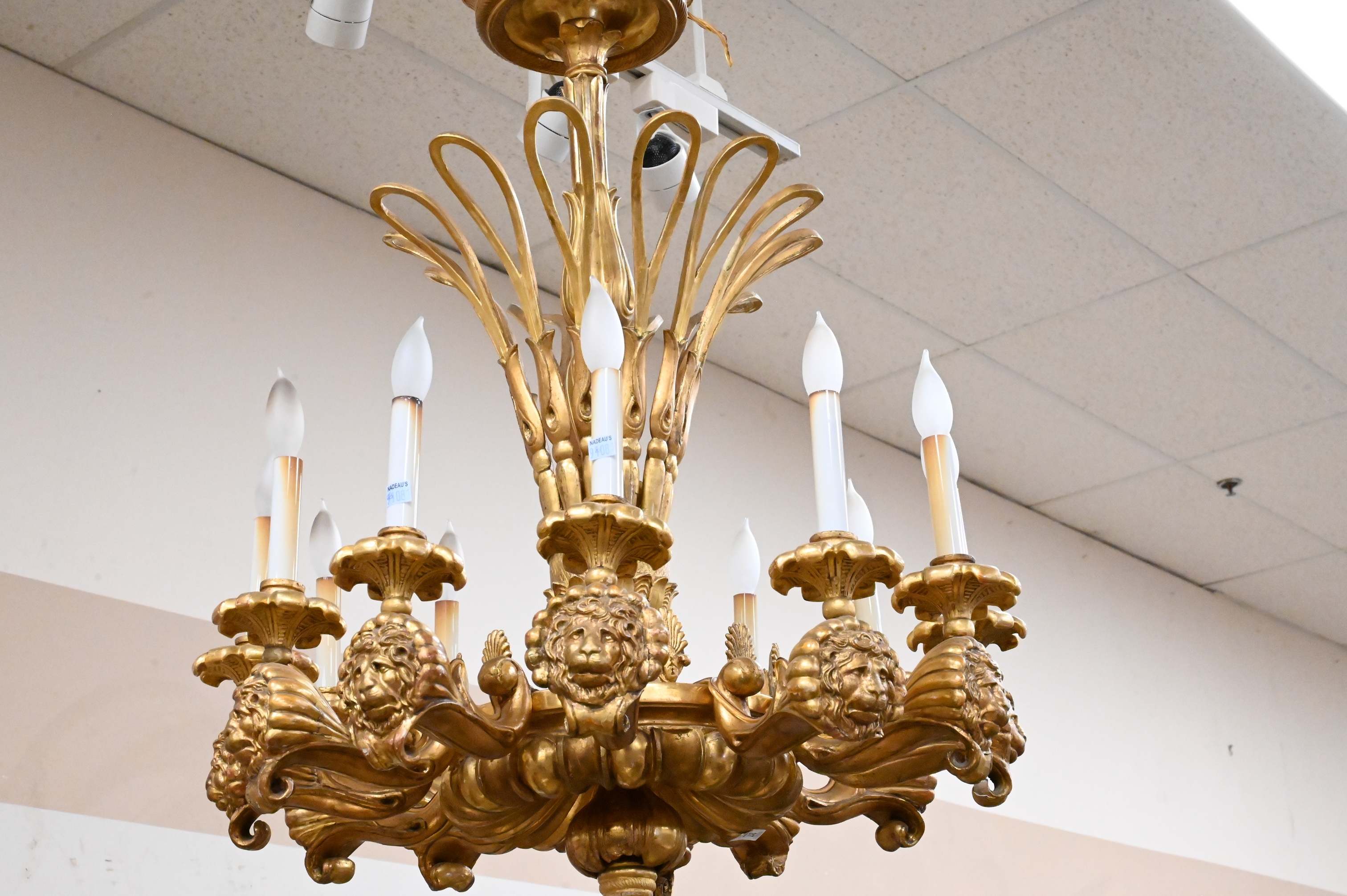 impressive neoclassical giltwood chandelier, the scalloped-edge circular corona above a fluted baluster standard issuing twelve boldly carved scrolling arms with lion-mask terminals, each supporting a fluted candle cup, the lower section carved with full acanthus and a stepped pendant finial, retains a rich gilded surface, later electrified