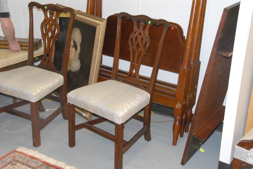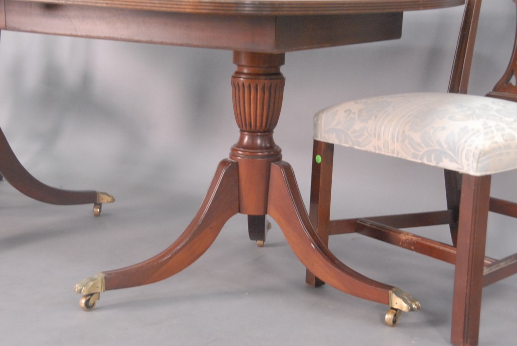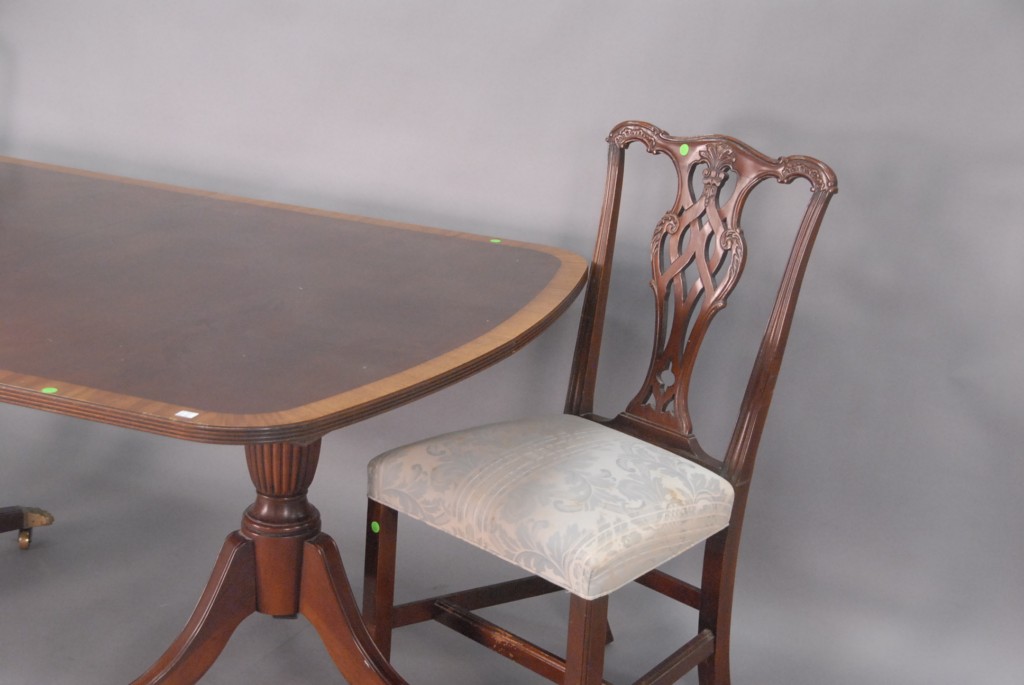 Lot 217: Nine piece Ethan Allen mahogany dining set including banded inlaid double pedestal table with large leave, eight Chippendale style s…