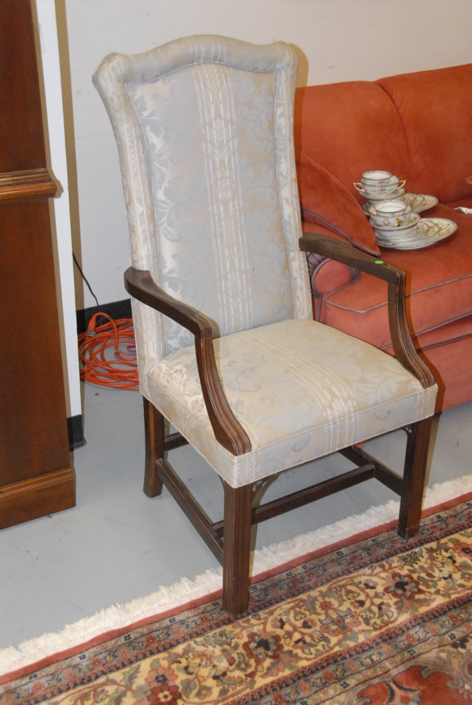 Nine piece Ethan Allen mahogany dining set including banded inlaid double pedestal table with large leave, eight Chippendale style side chairs, and pair of Chippendale style armchairs with fully upholstered seats and backs, table lg. 70, wd. 46 and one 24 leave.