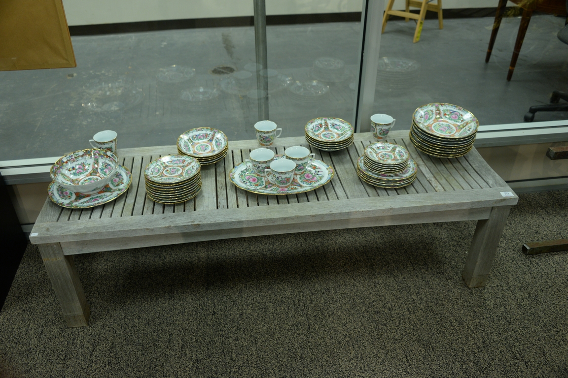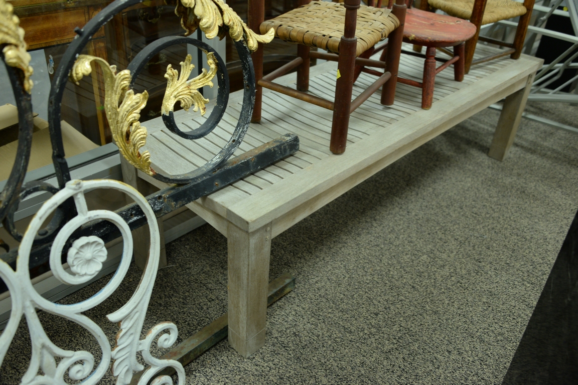 Pair of teak benches, top with slight inward curve. ht. 16in., lg. 60in., wd. 19in.