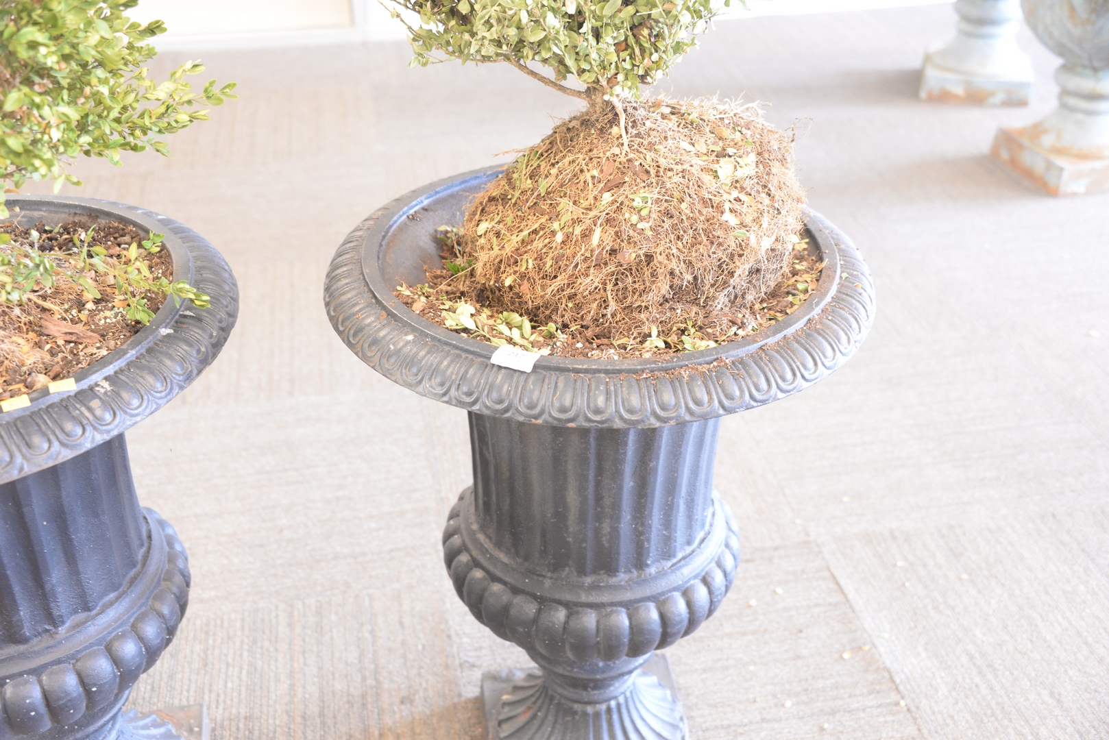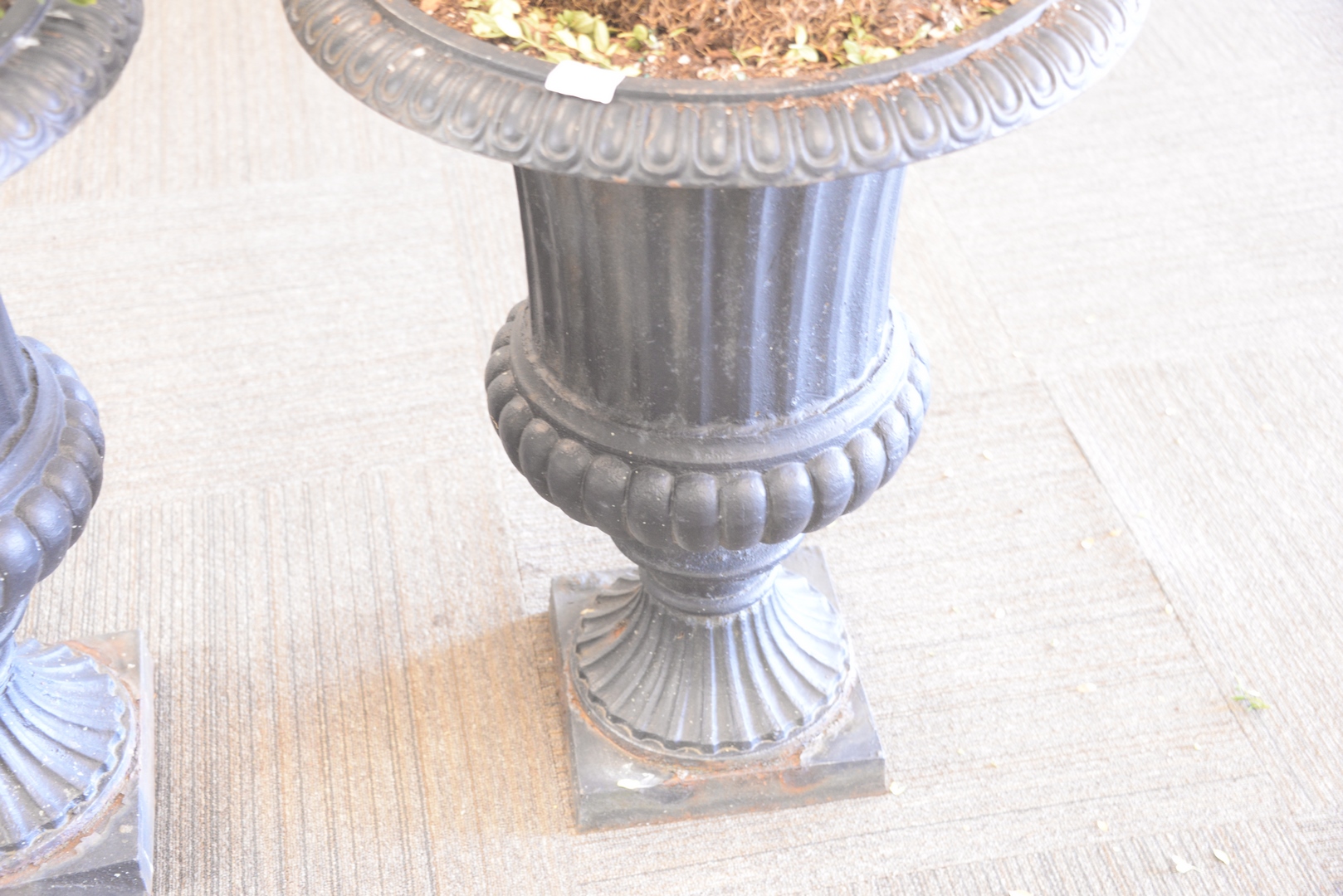 Pair of Victorian Style Iron Urns on square bases, height 30 inches, diameter 23 inches.