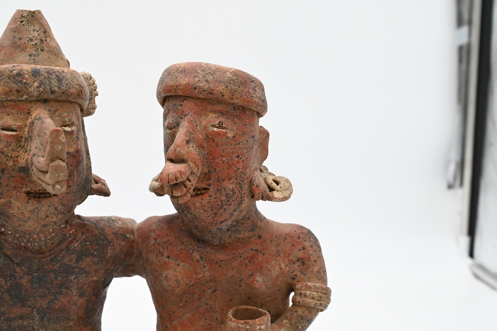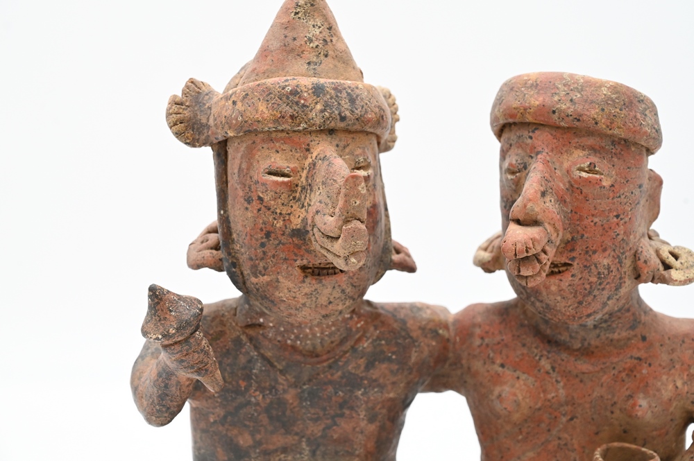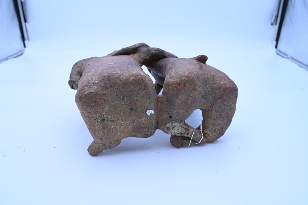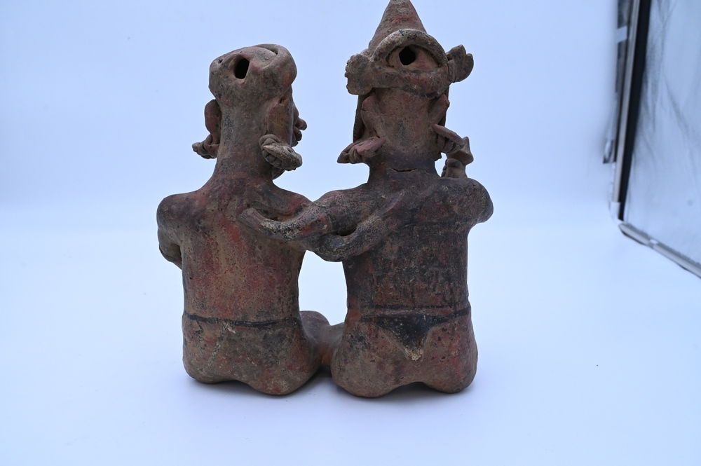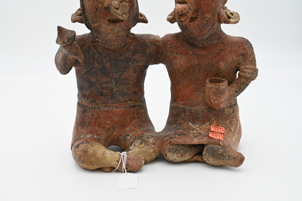 Lot 217: Pre Columbian Pottery Double Figure, two people sitting crossed legged, height 12 3/4 inches.