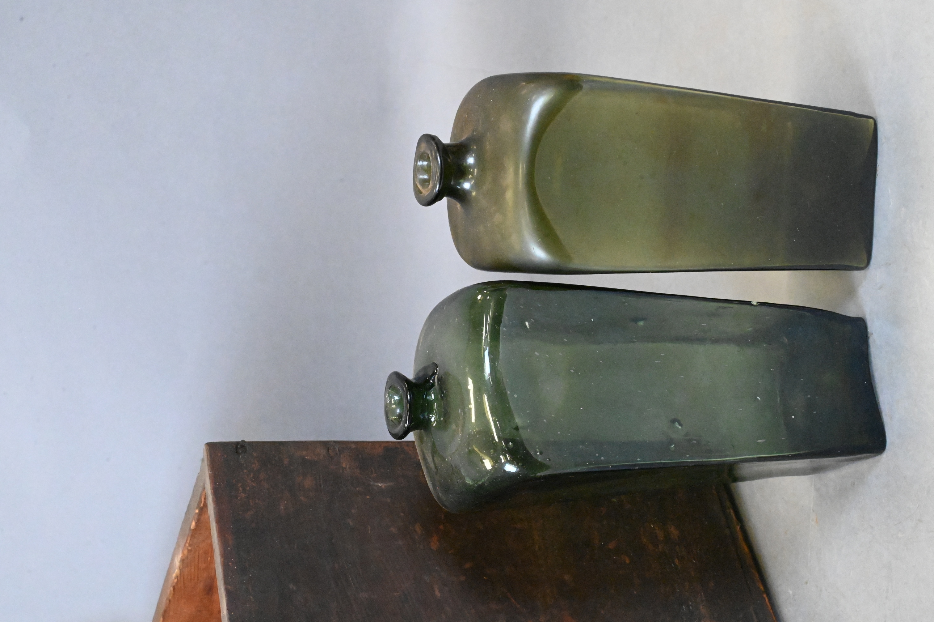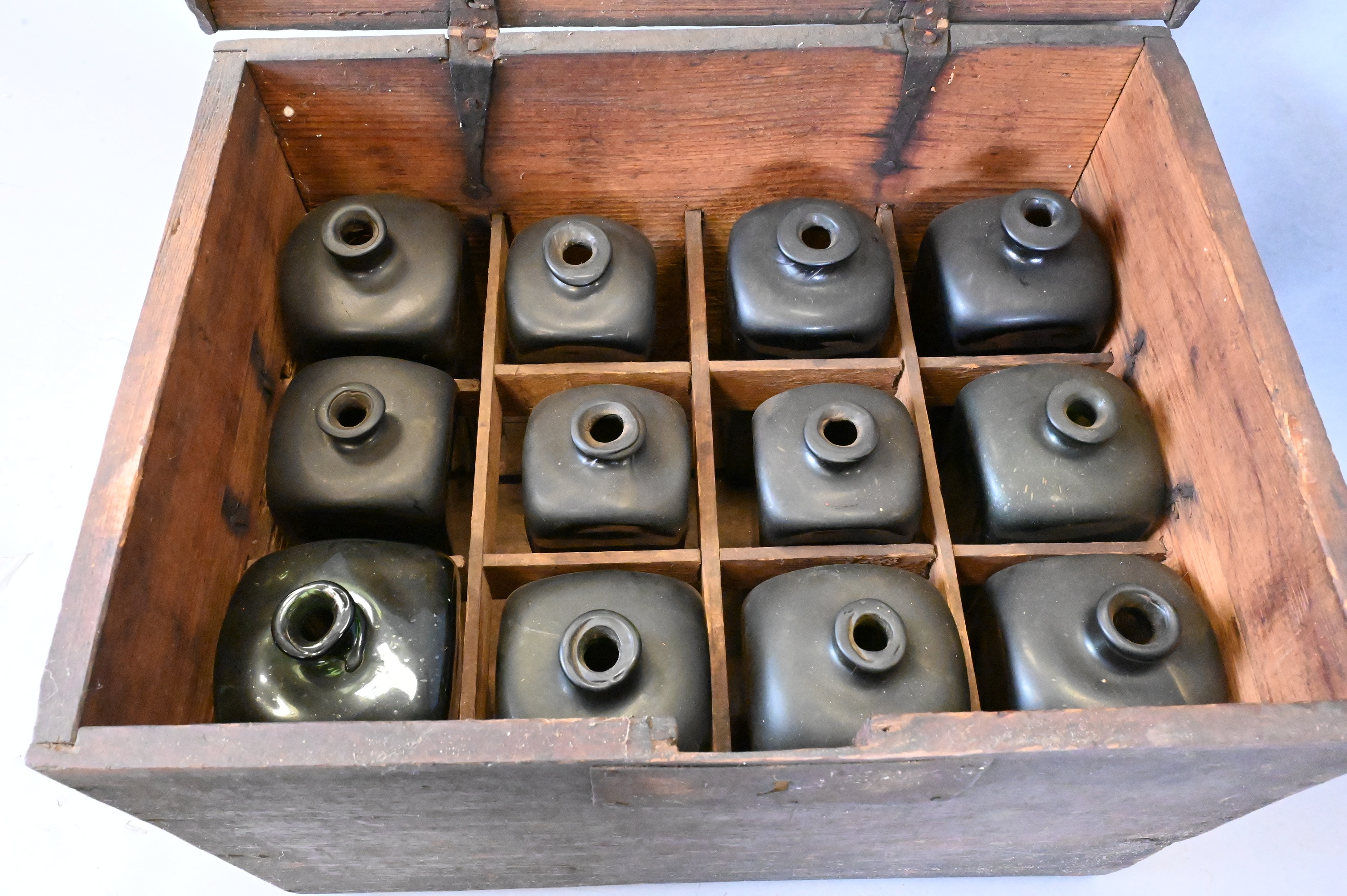 tantalus box with metal mounts opening to 12 compartments with hand blown glass bottles