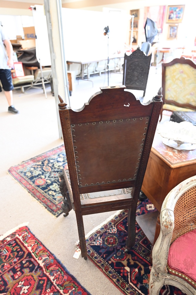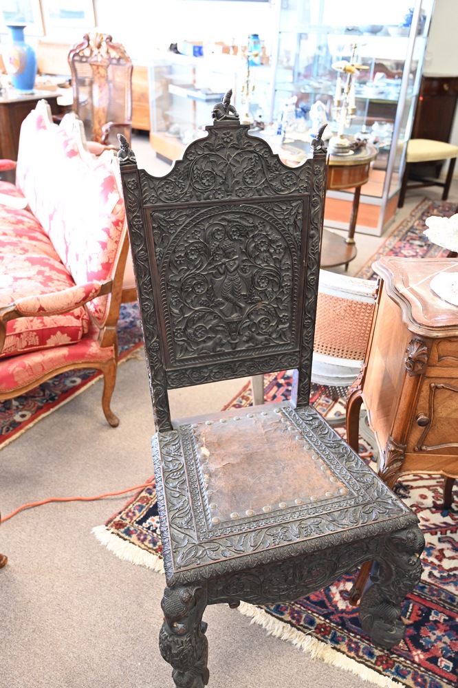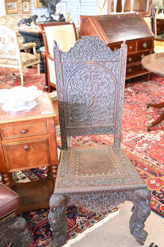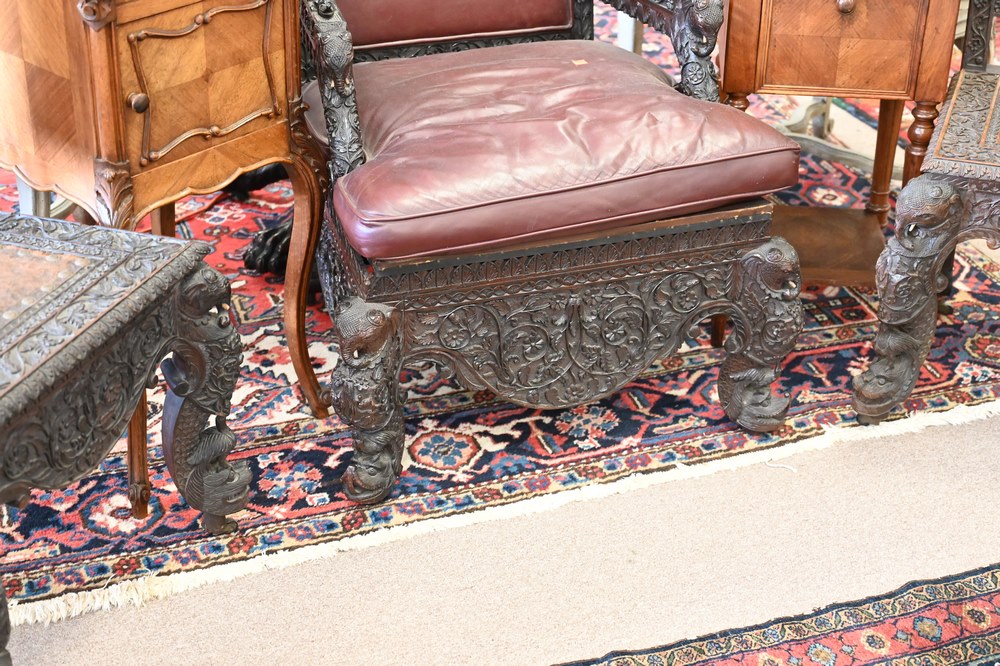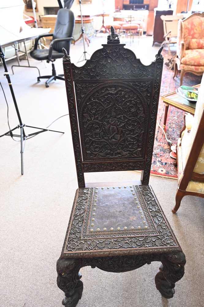 Lot 217: Set of Four Anglo-Indian Chairs, to include three side chairs and one armchair, having legs with carved elephants and dolphin feet, with carved alligators on arms, one center top figural carving missing, height 46 inches.