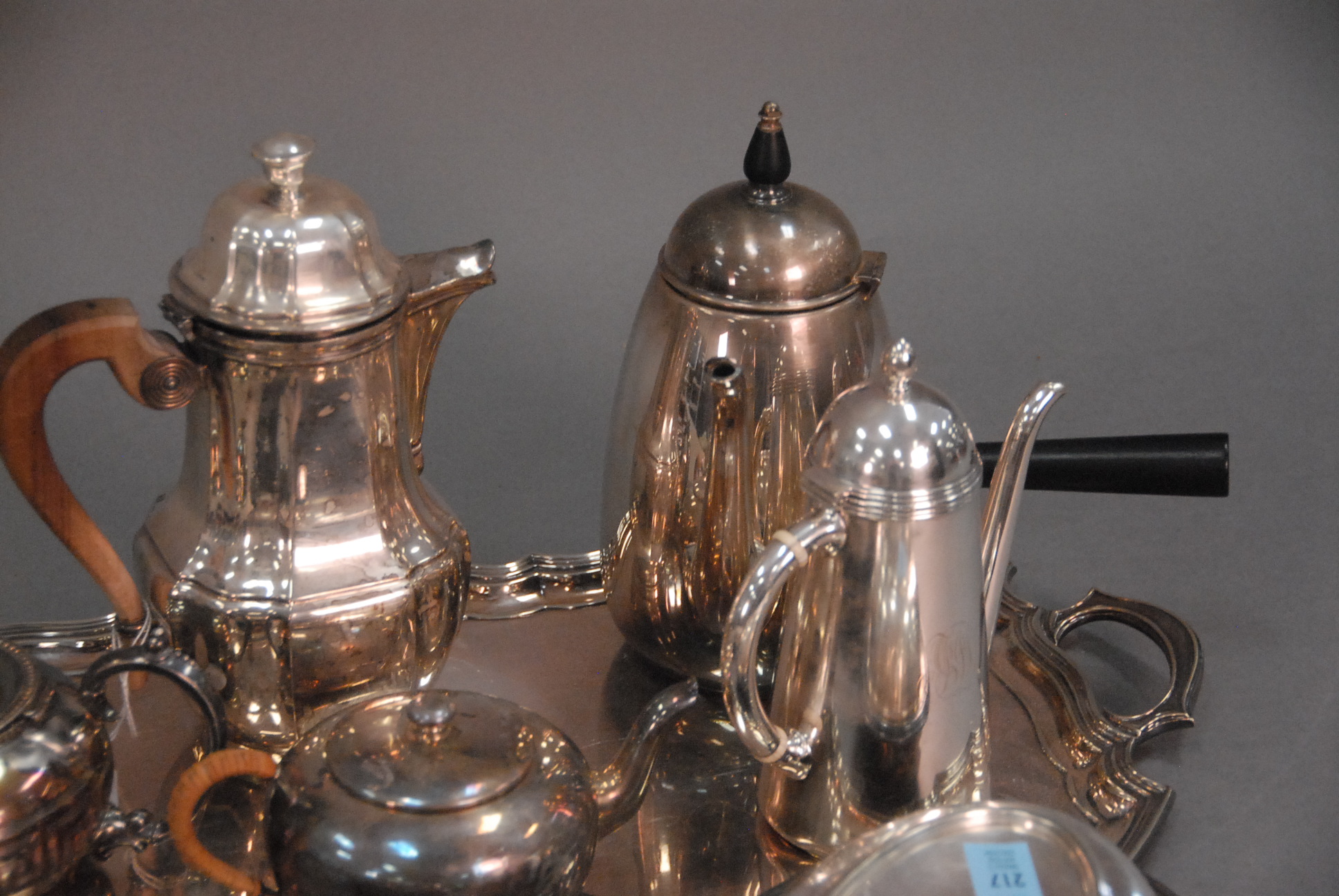 Silverplated lot including tray, teapot, covered vegetable dish, coffee pots, etc.