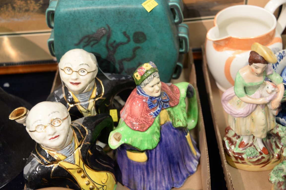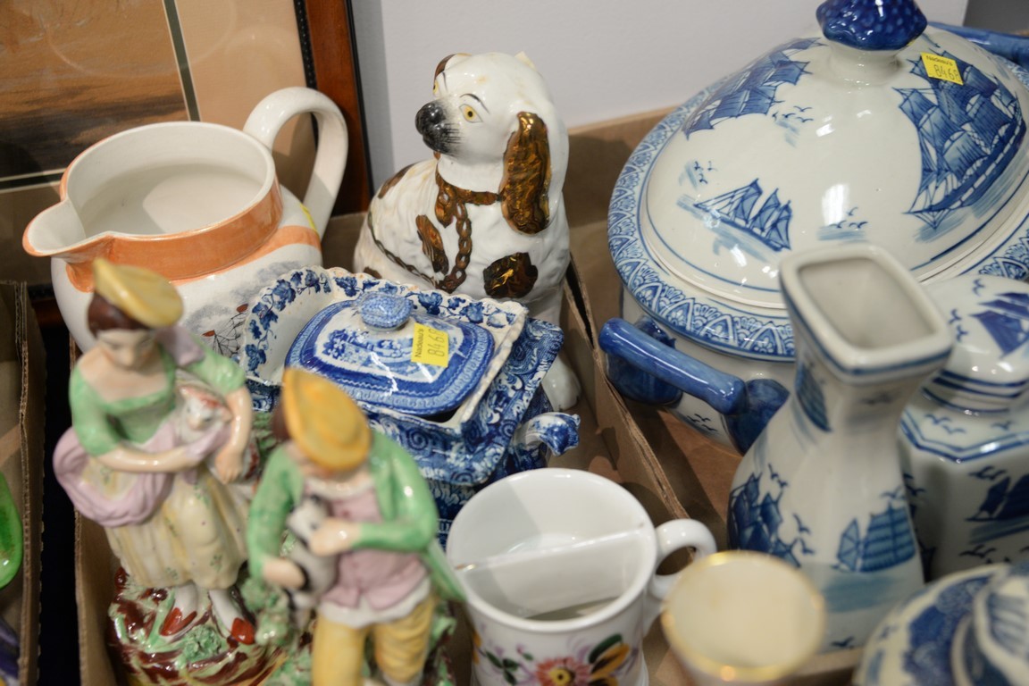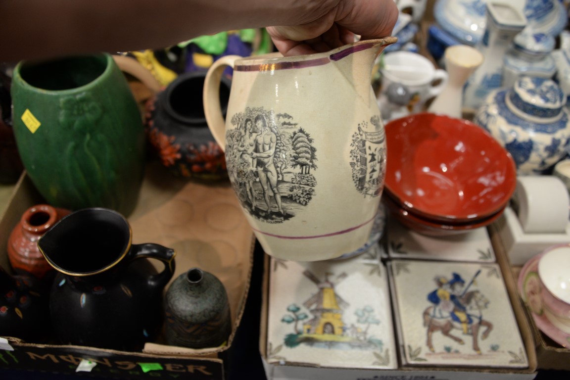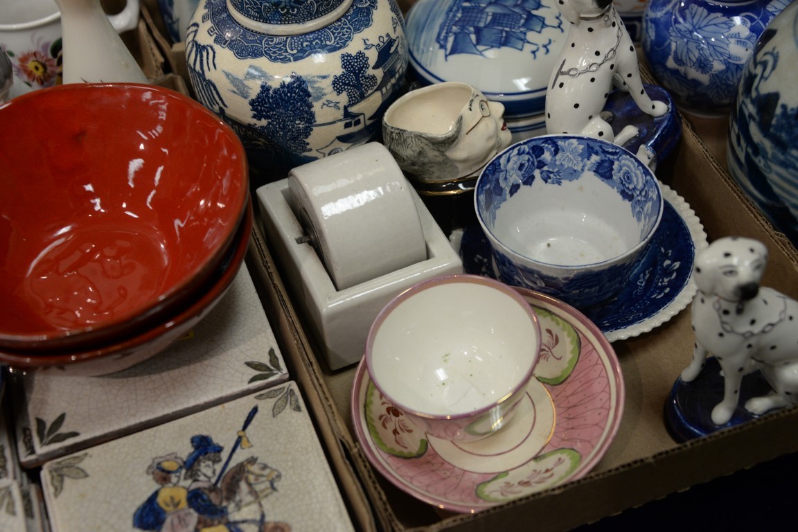 Six box lots of porcelain and pottery to include green glazed flower vase, two Zward Holland pottery, tiles, figures, Staffordshire dogs, blue and white porcelain, Adam & Eve jug, etc. Provenance: Estate of Arthur C. Pinto, MD