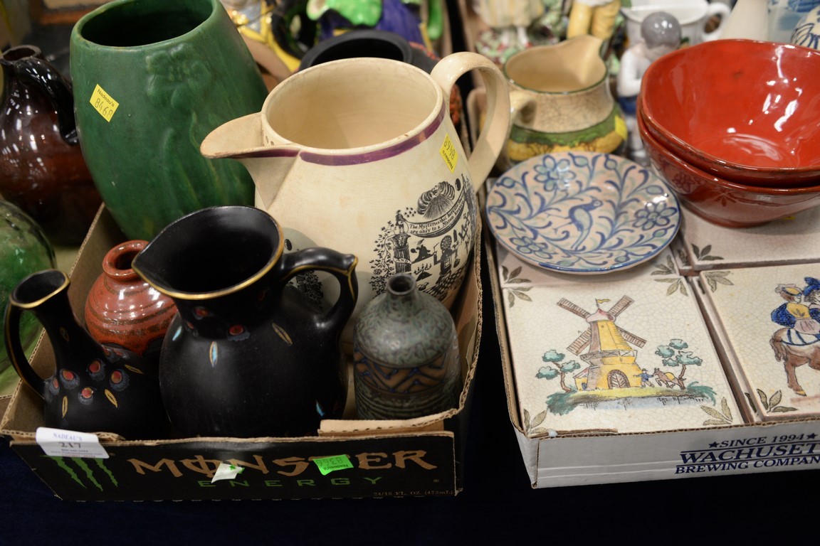 Lot 217: Six box lots of porcelain and pottery to include green glazed flower vase, two Zward Holland pottery, tiles, figures, Staffordshire…