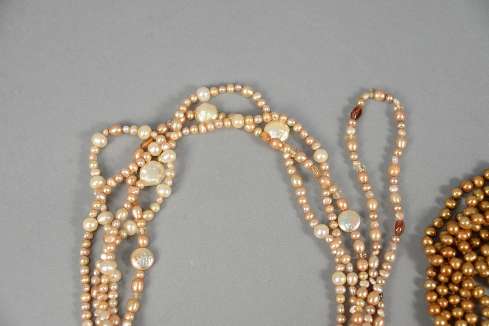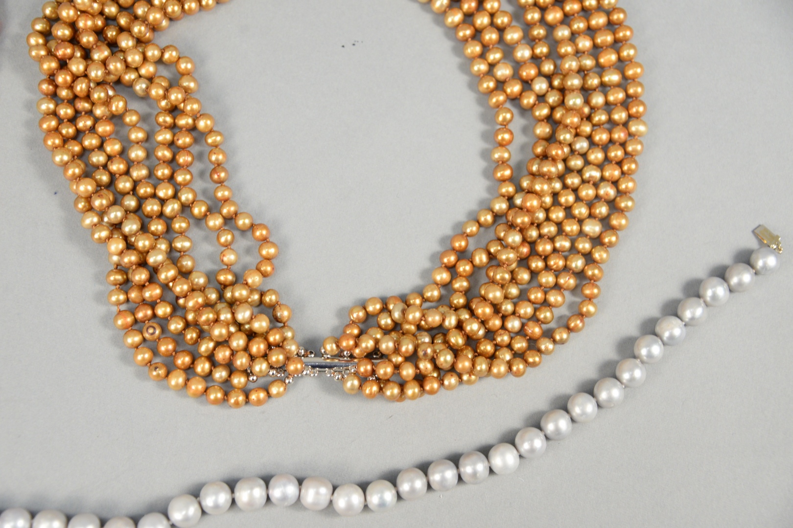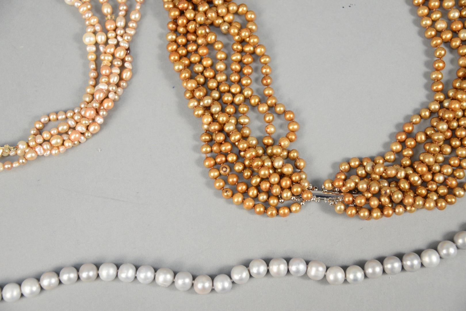Lot 217: Three Pearl Necklaces including one light grey, with gold clasp length 17 1/2 inches, 10.3 millimeters