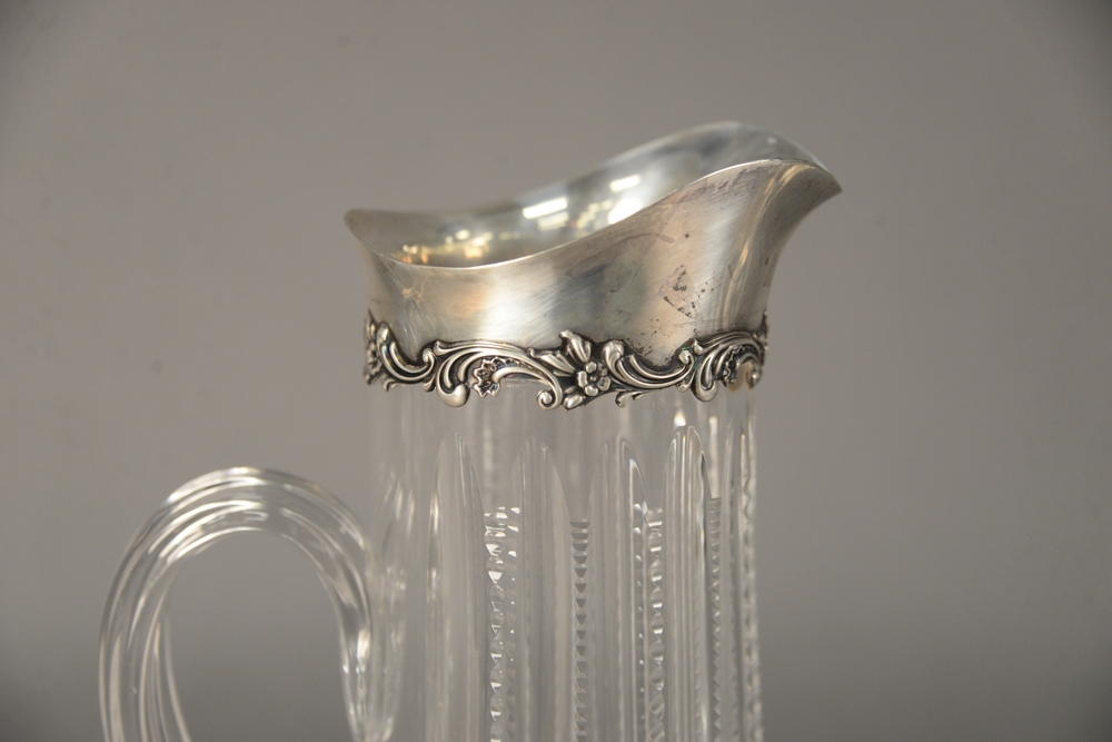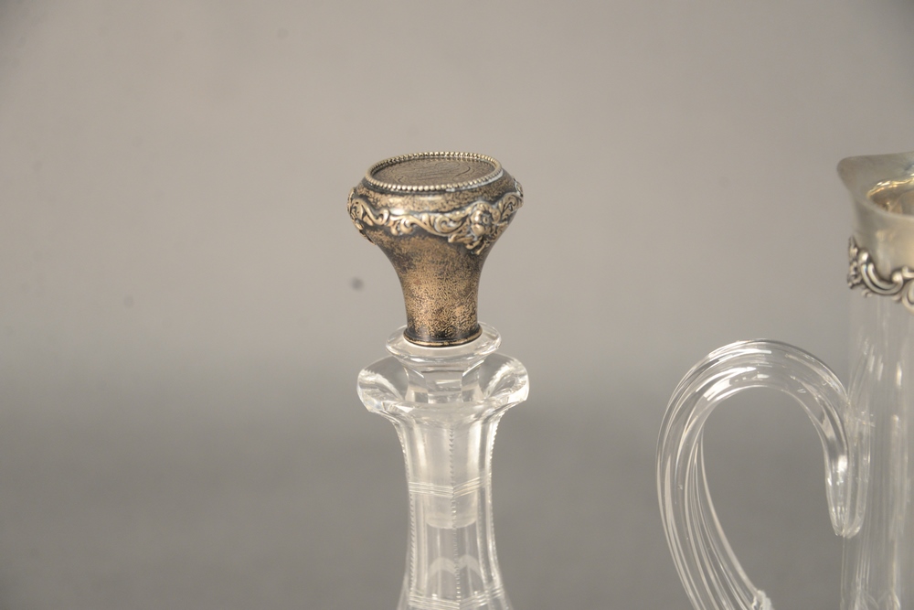 Three Piece Glass Lot, to include two cut glass decanters attributed to Hawks, having Gorham sterling silver overlay stoppers, along with a cut glass pitcher having a sterling silver rim, height 10 inches and 9 1/2 inches.