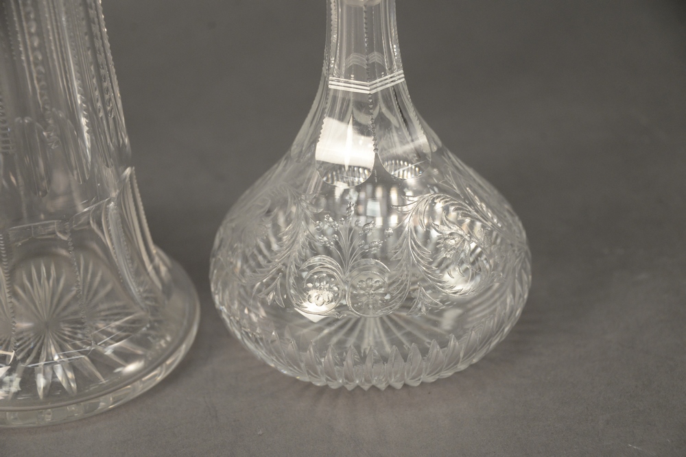 Lot 217: Three Piece Glass Lot, to include two cut glass decanters attributed to Hawks, having Gorham sterling silver overlay stoppers, along…