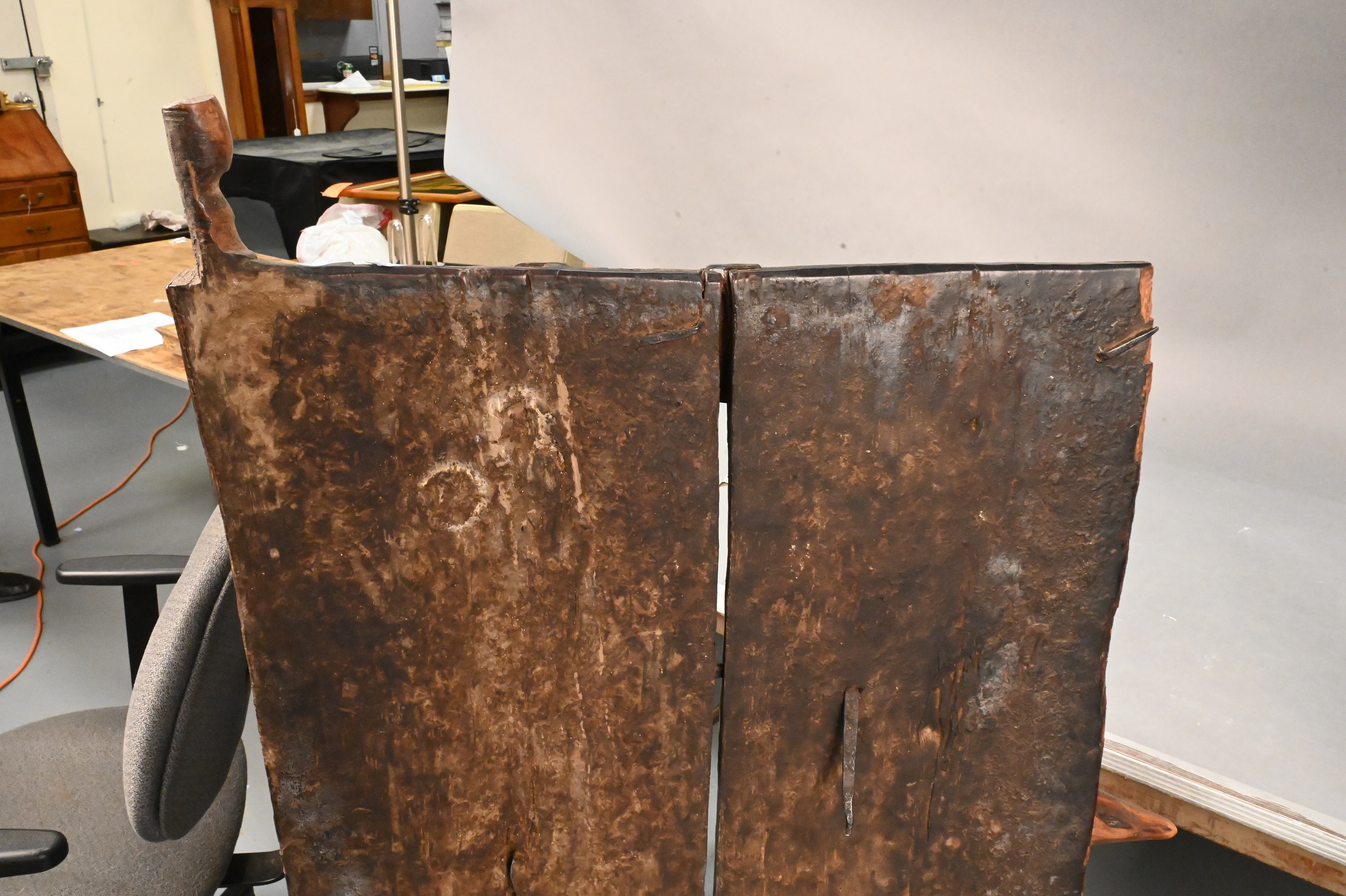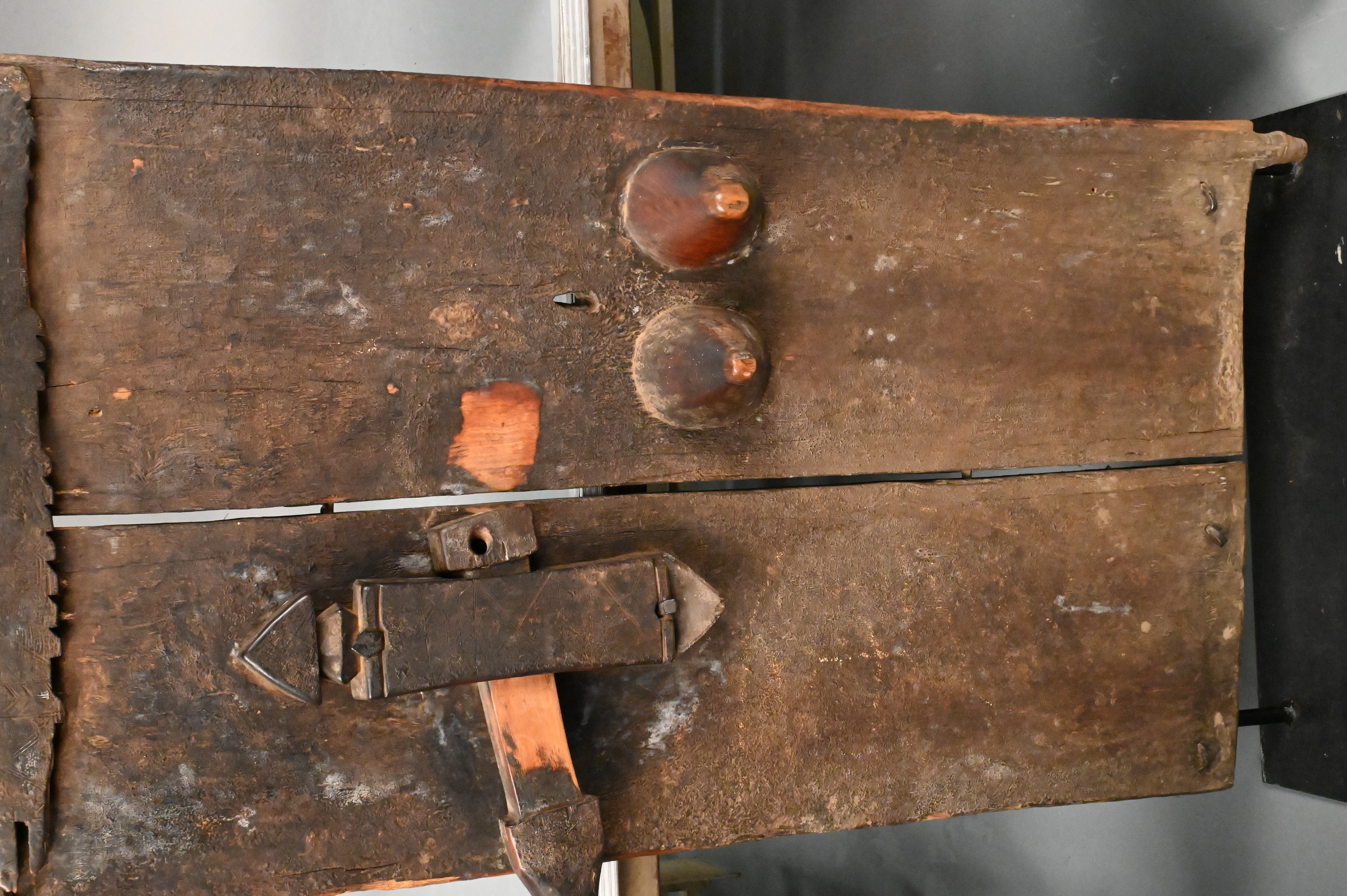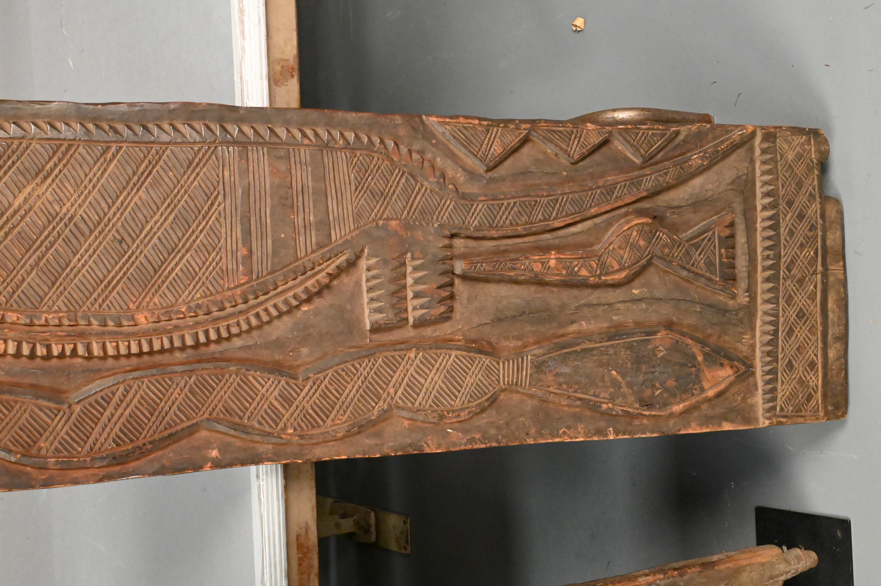 to include early Dogon Granary door having carved handle / lock two carved spokes center right and patterned top border Mali, the other a Ishan single panel door featuring a snake and lizard like animal Nigeria early 20th century