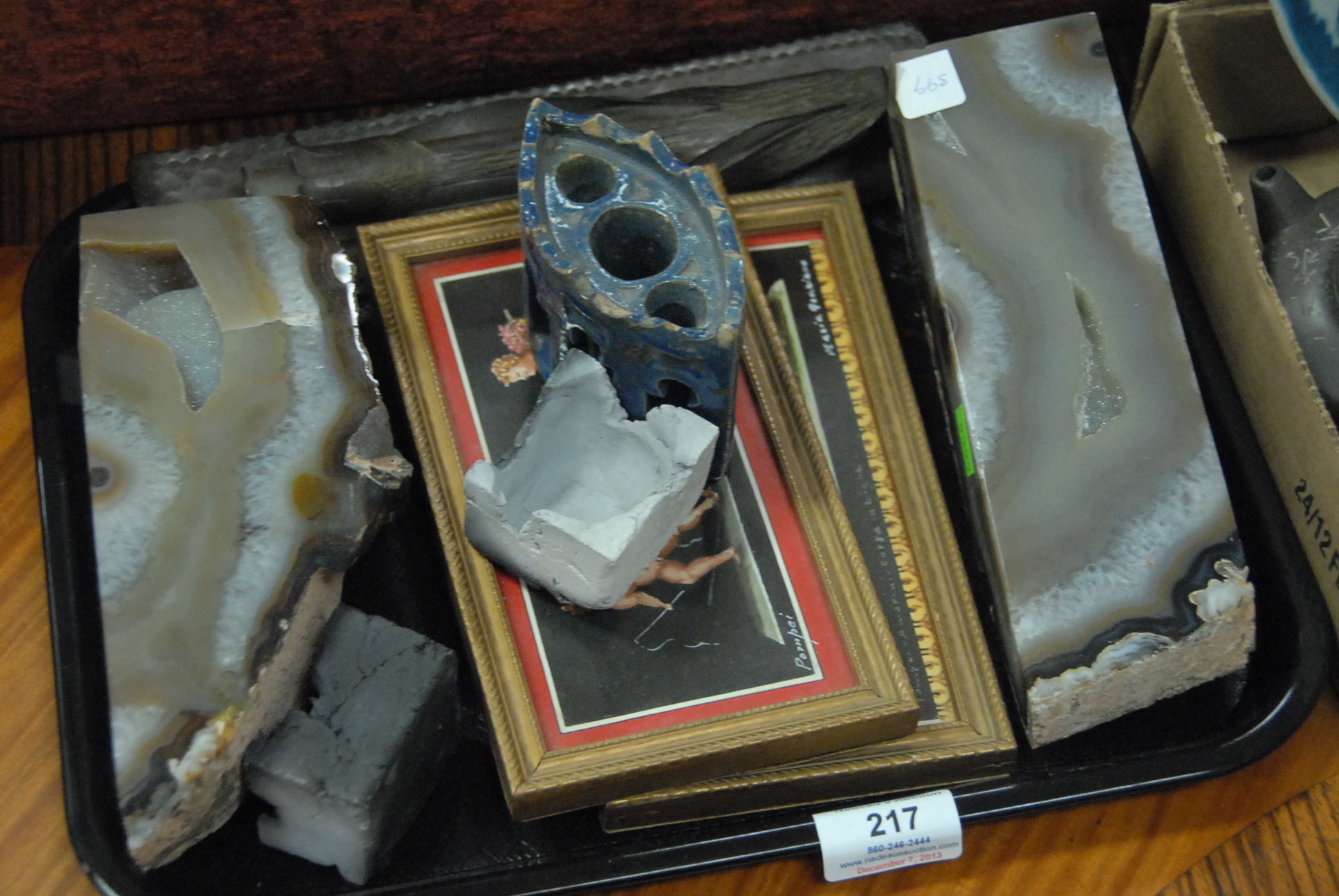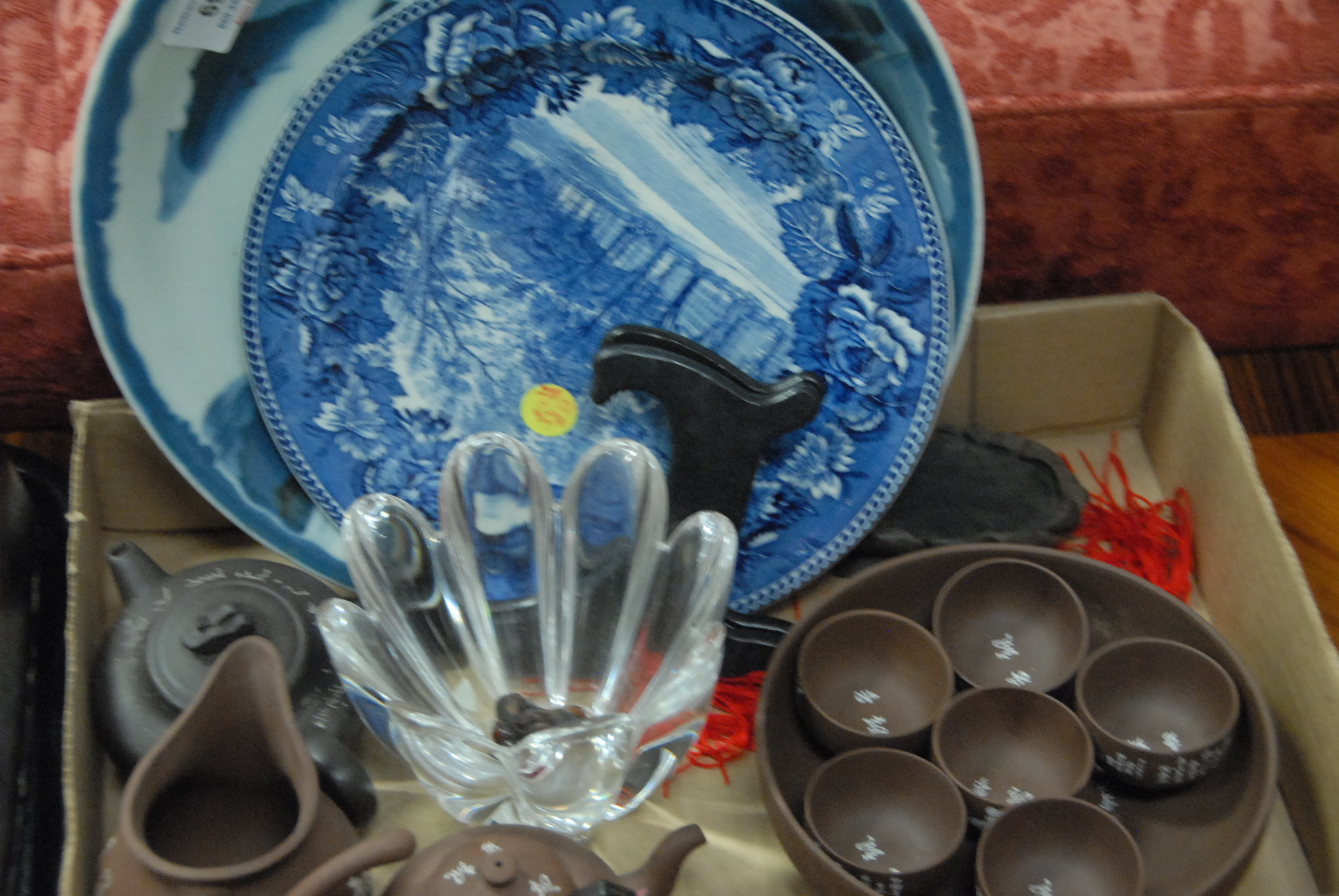Lot 217: Two box lots of miscellaneous items to include Chinese tea set, pair of store book ends, pair of prints, etc.