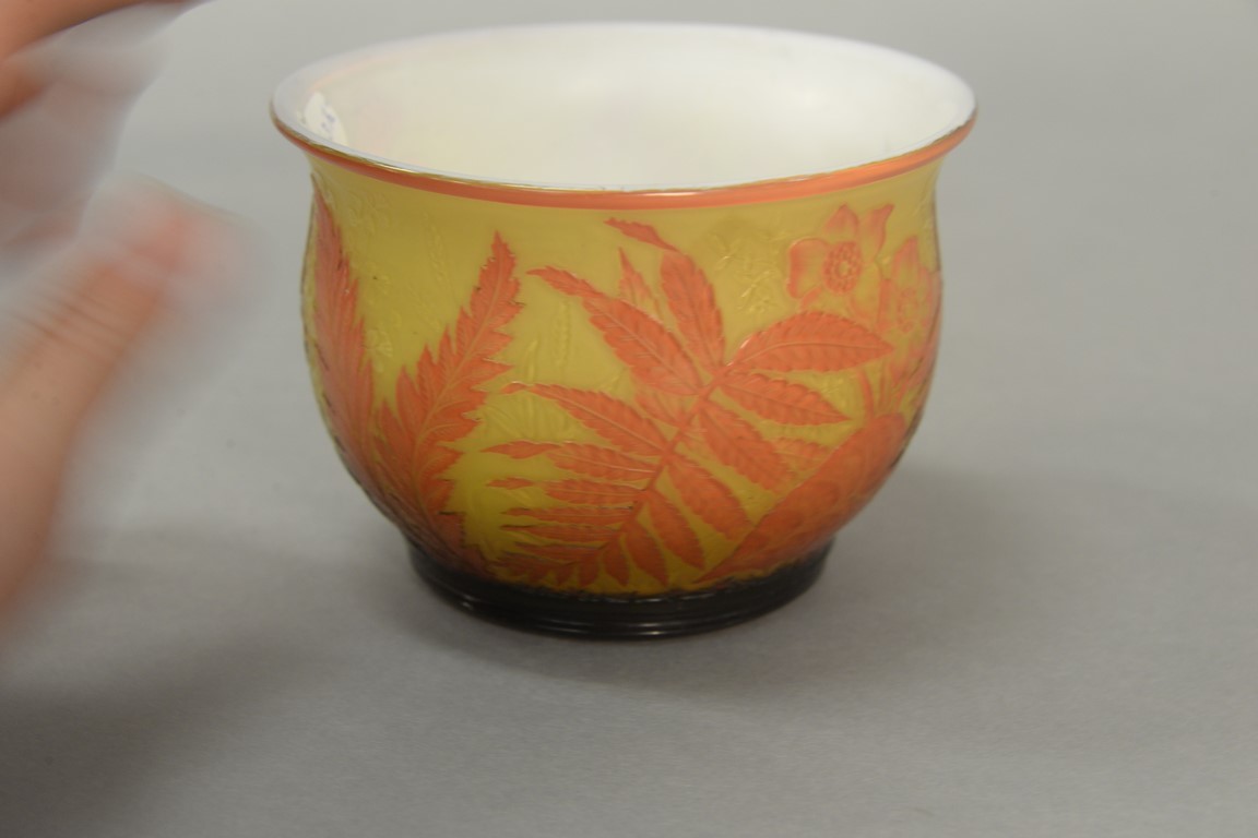 Lot 217: Webb cameo glass bowl, fern and flower design having orange etched to yellow color. ht. 3 1/2in., dia. 4 1/2in.